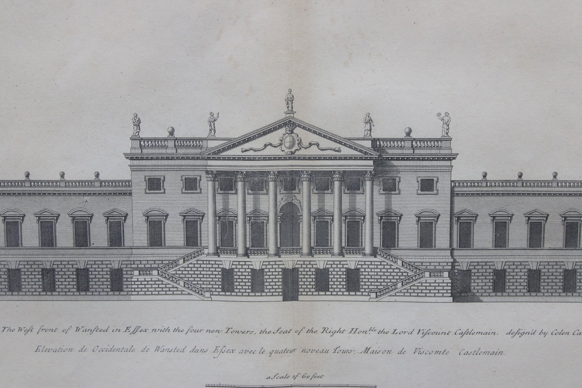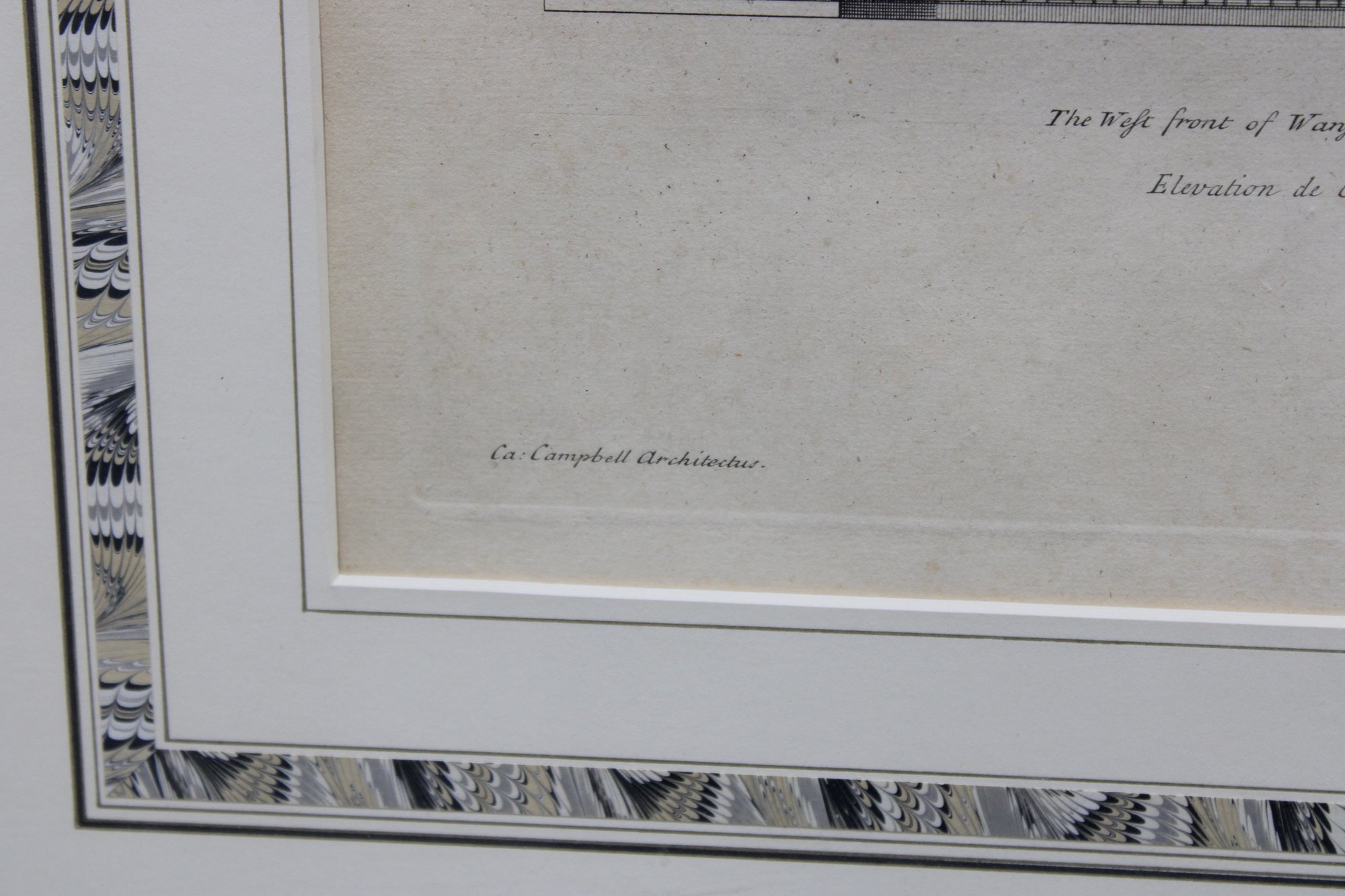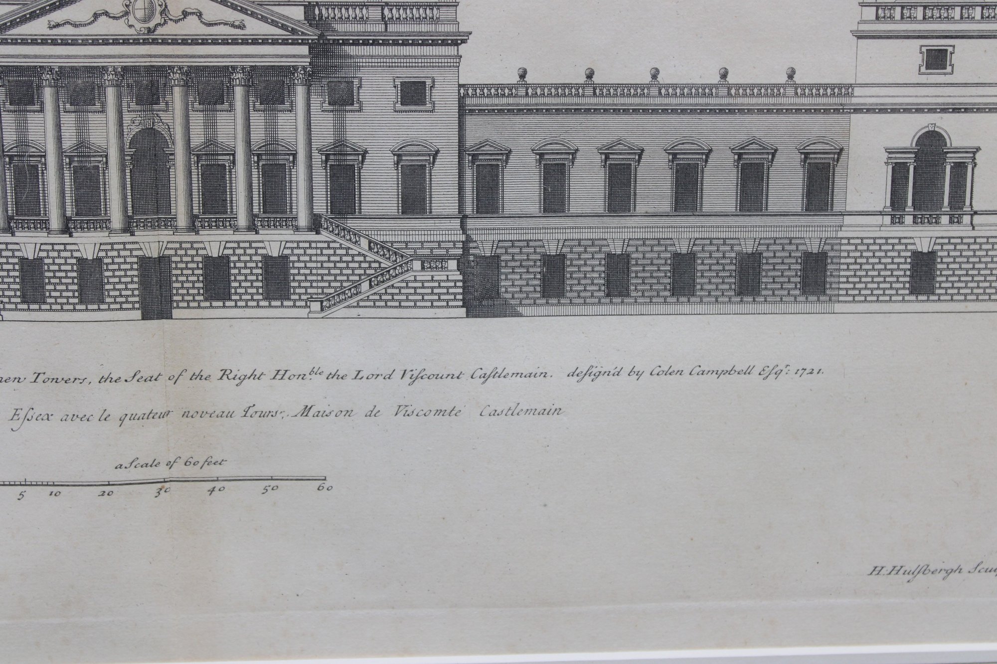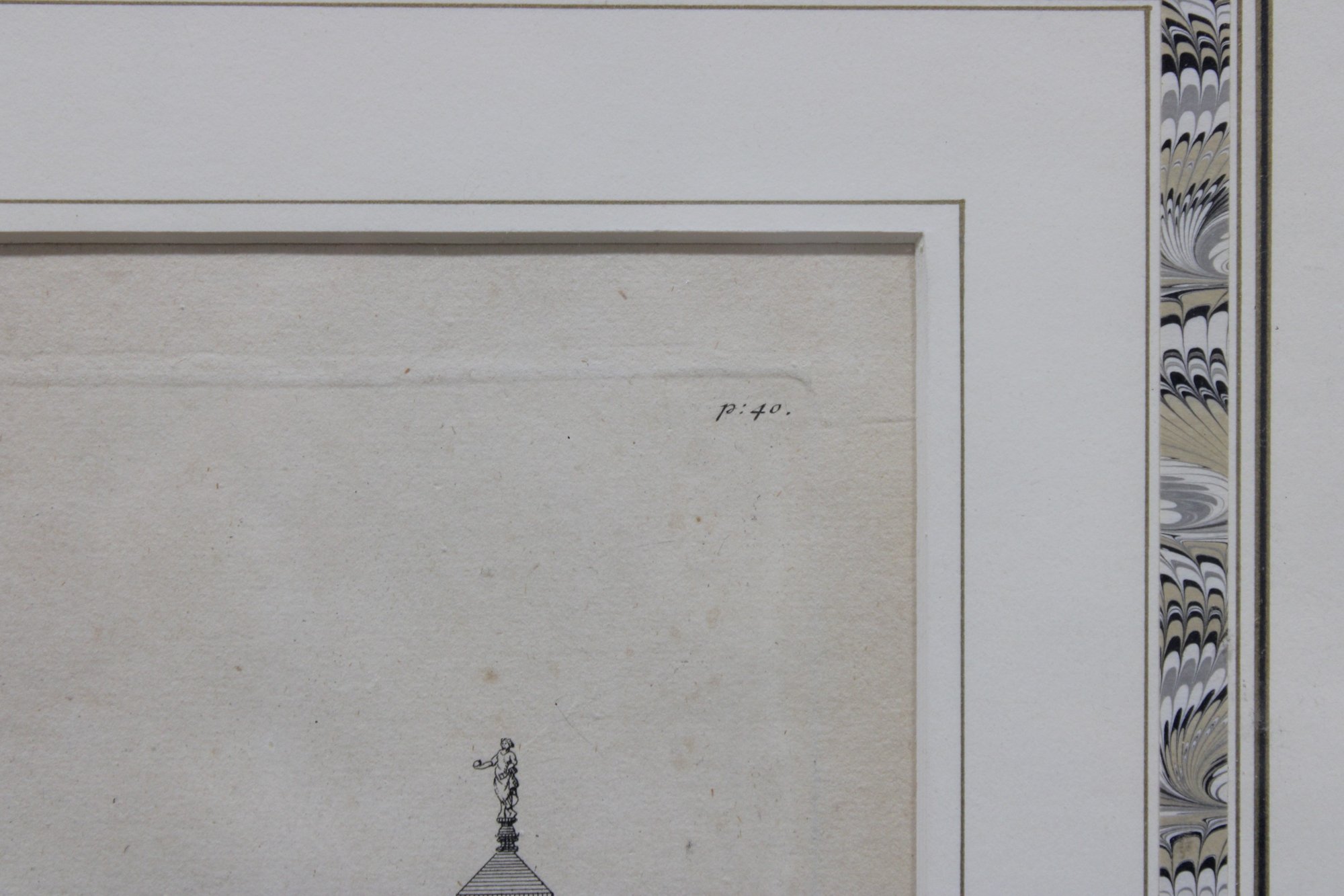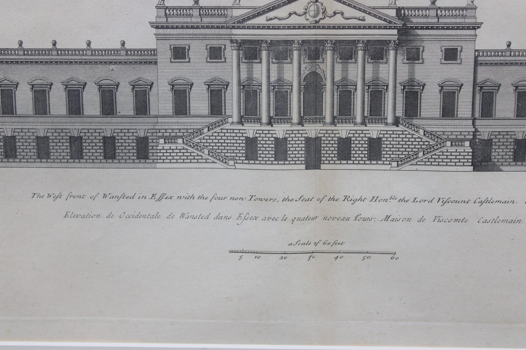 a framed antique architectural engraving, depicting a formal elevation of a grand classical building with colonnades, pediments, and sculptural roof details. The image reflects traditional European architectural design and appears to be taken from an early architectural or academic publication.