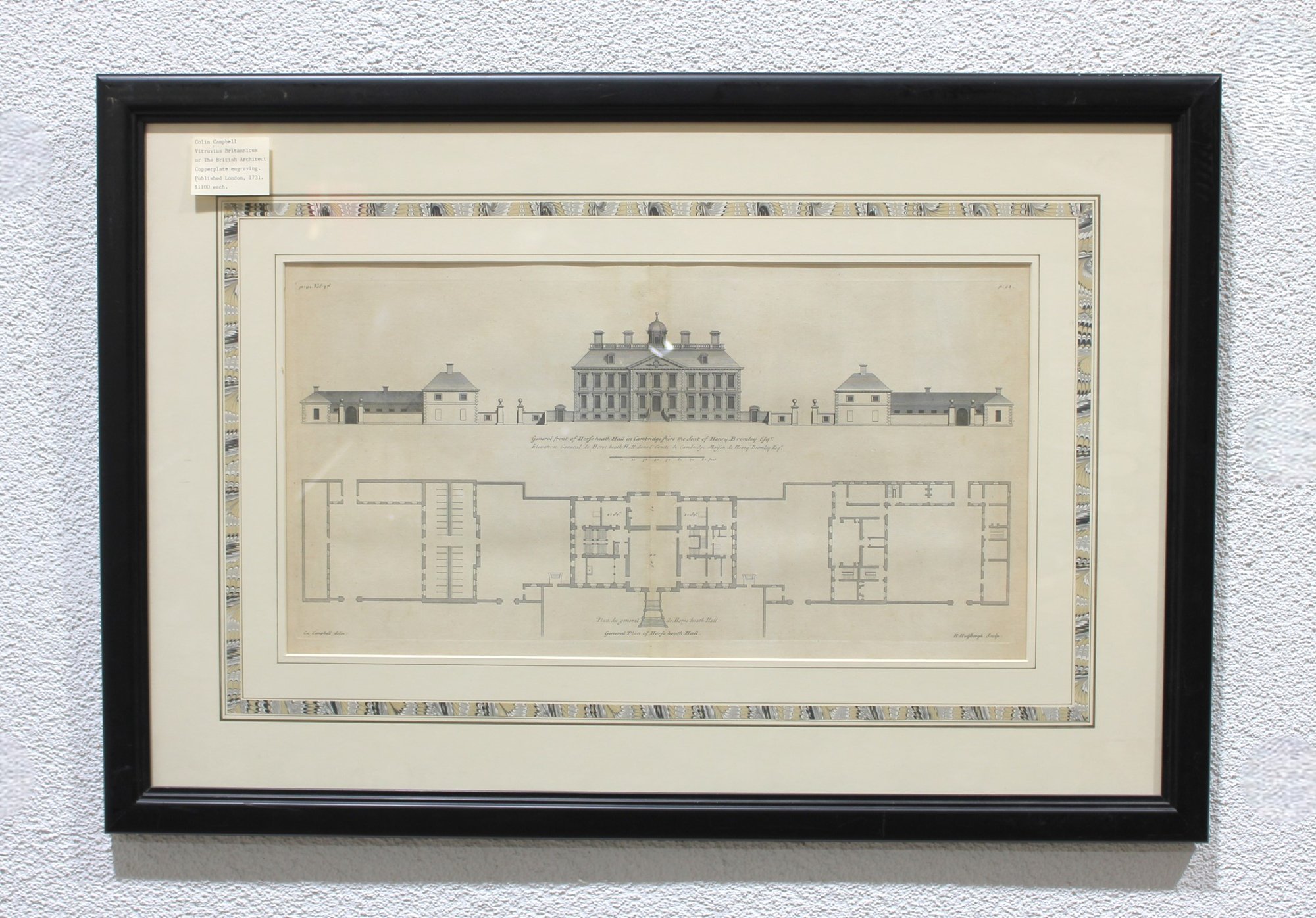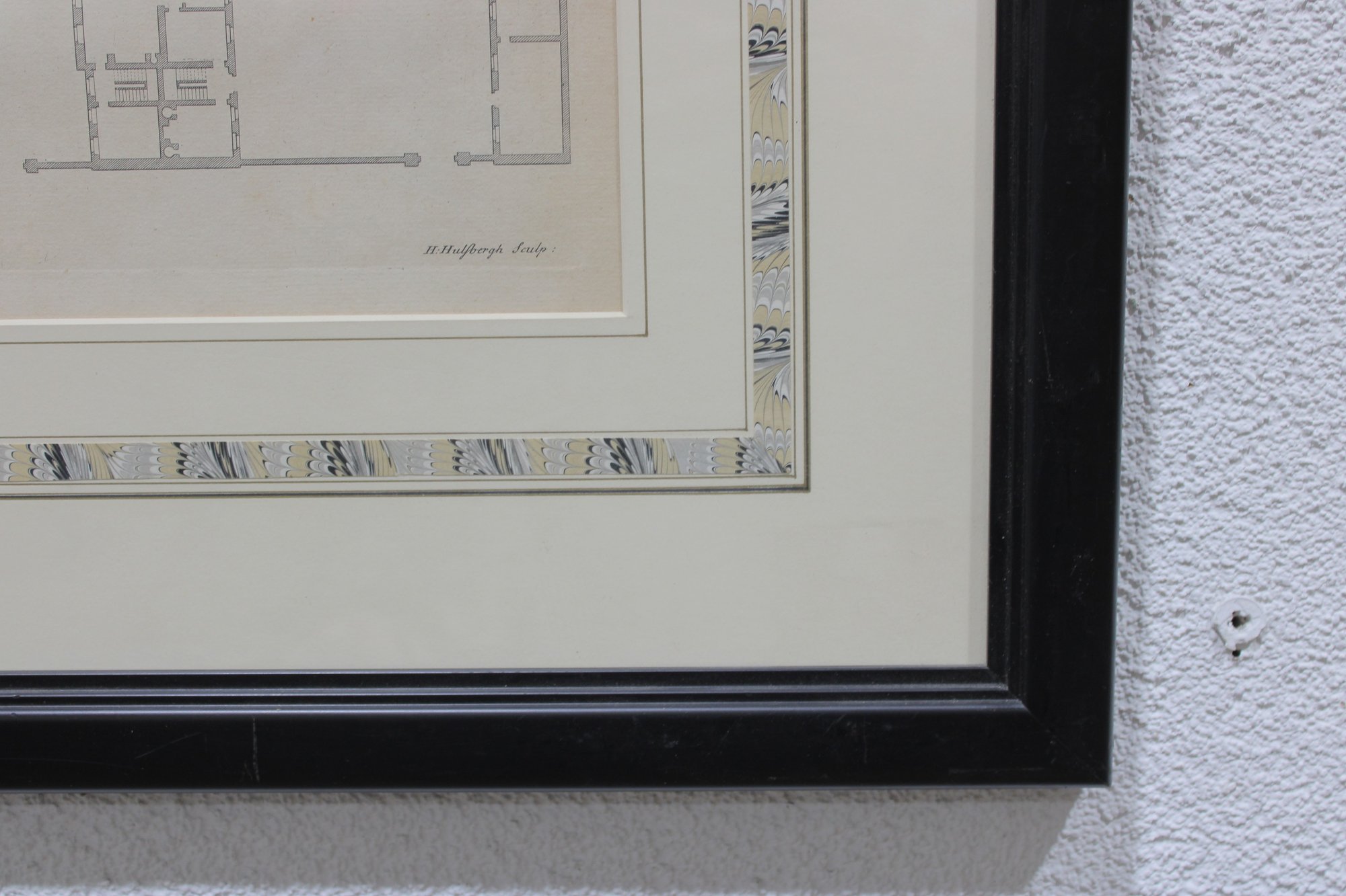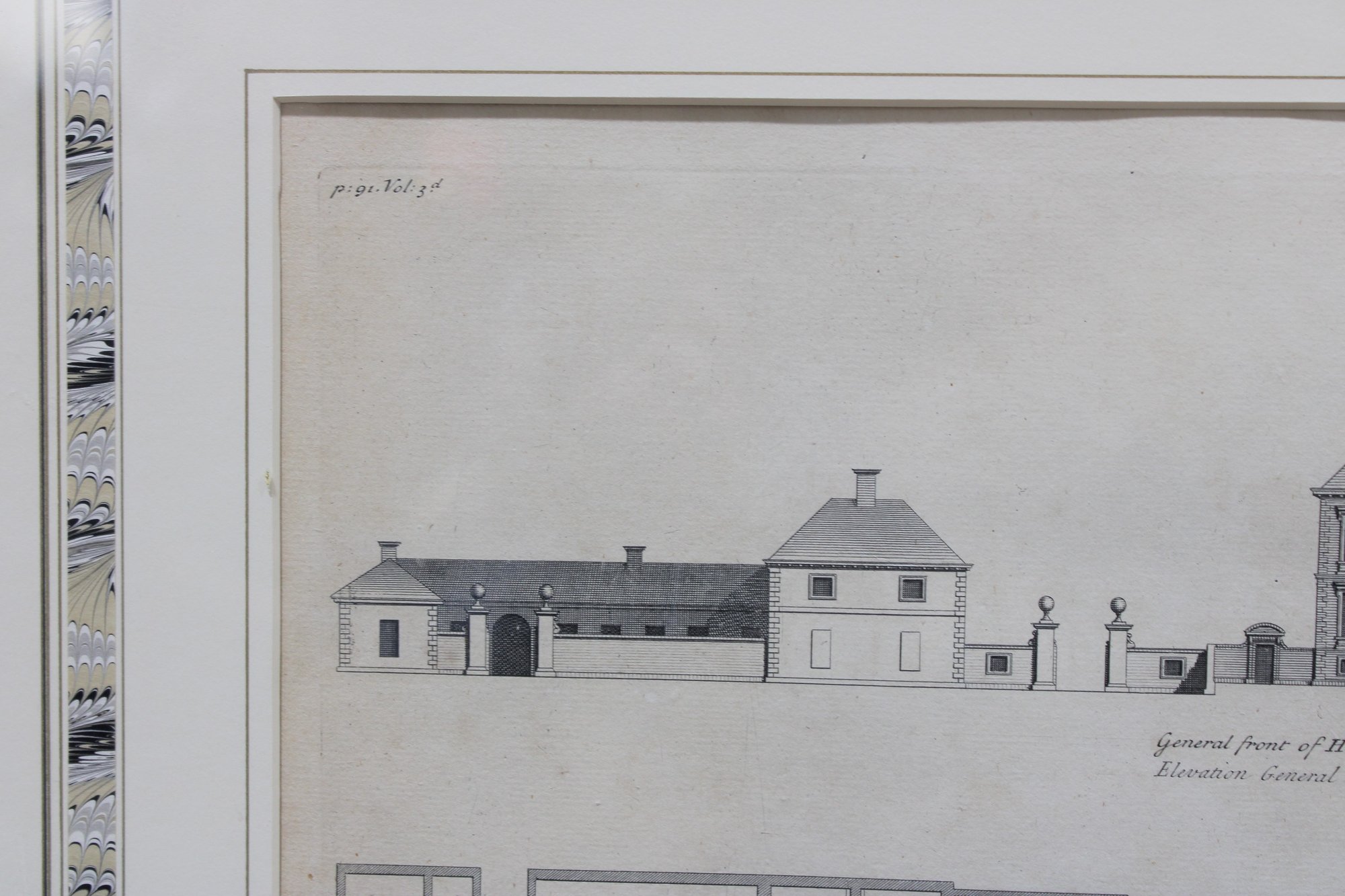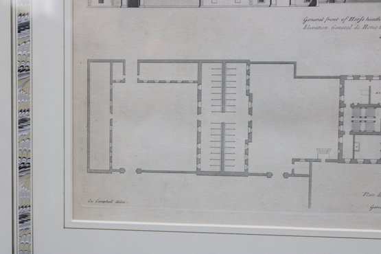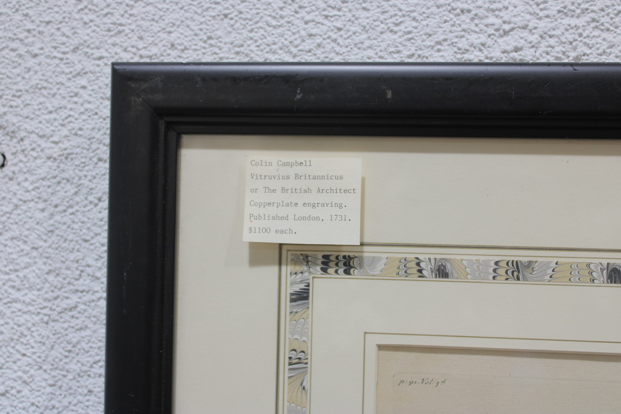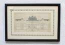 a framed antique architectural engraving, featuring a formal building elevation with corresponding floor plan beneath. The image presents a symmetrical classical structure rendered with precise line work, typical of architectural and academic engravings from early European design publications.