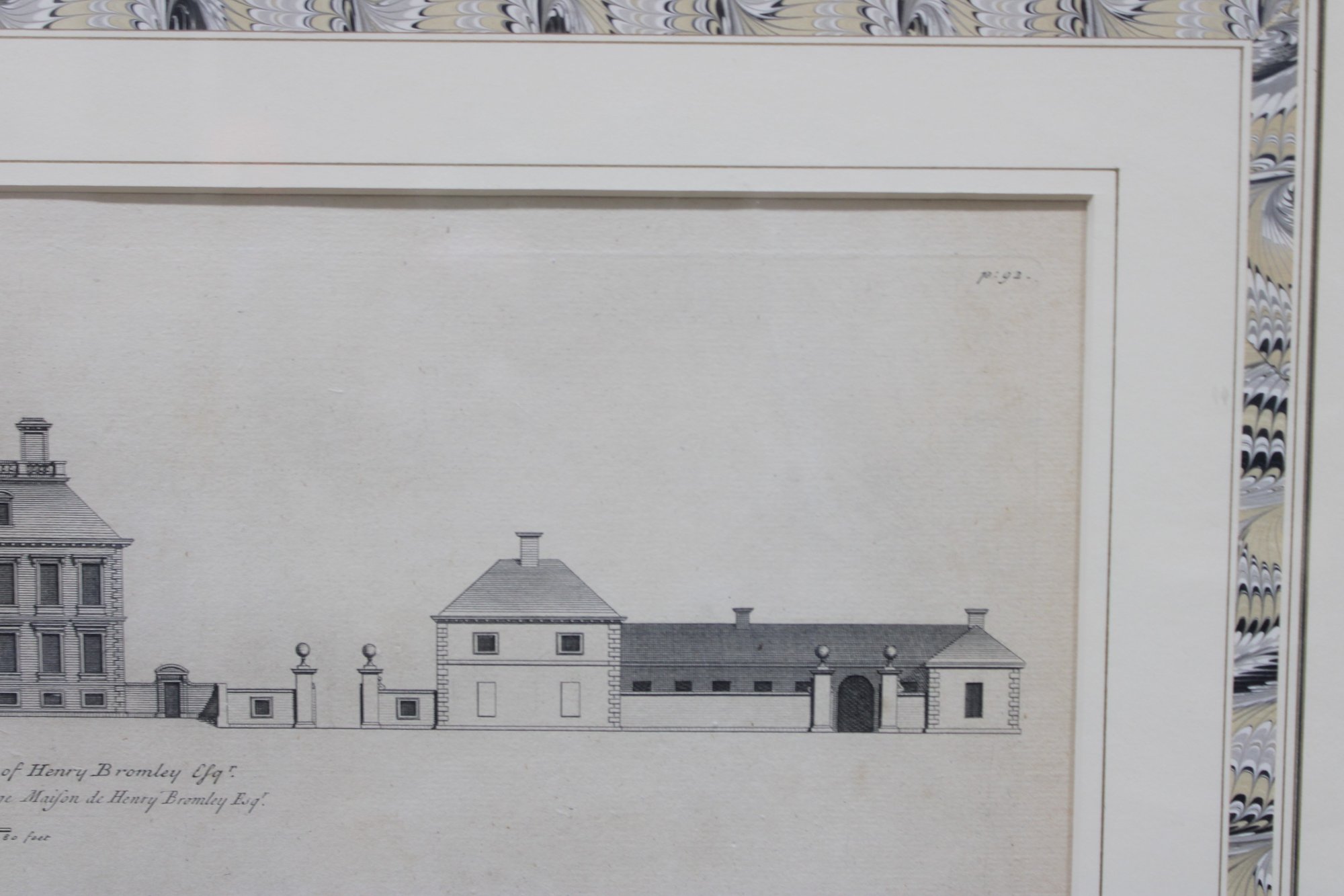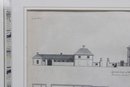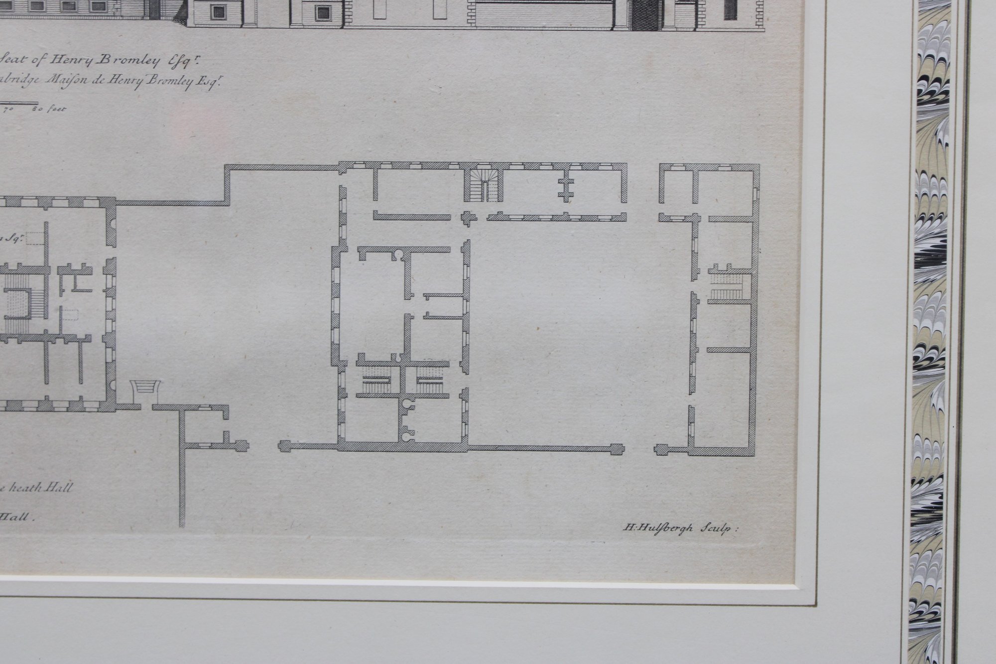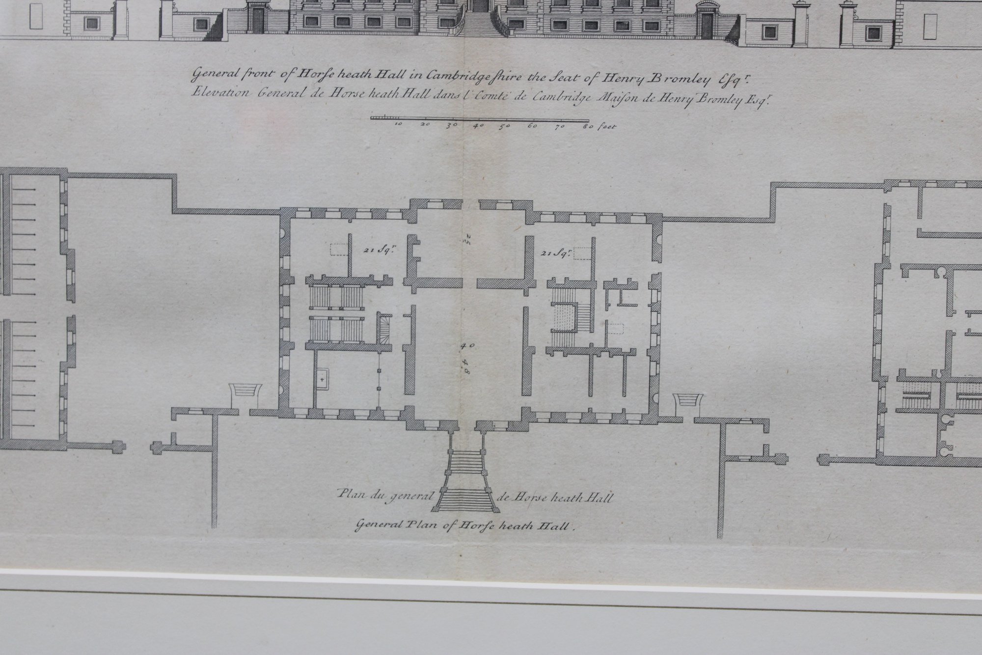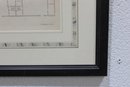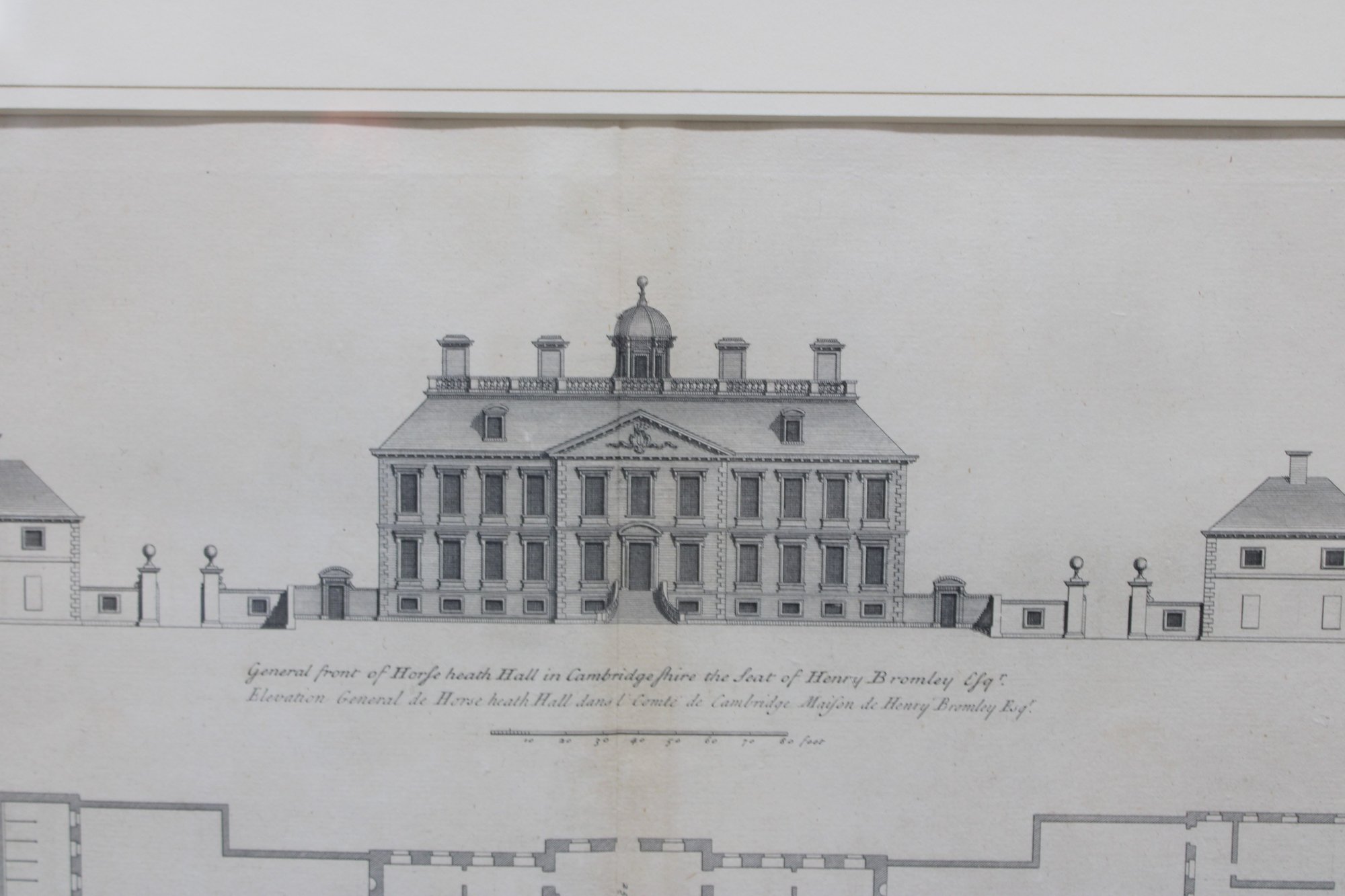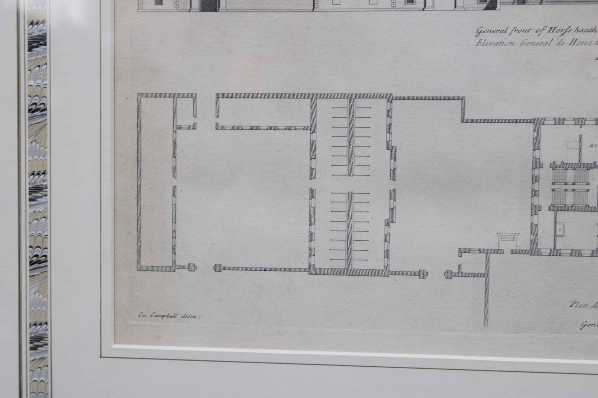 a framed antique architectural engraving, featuring a formal building elevation with corresponding floor plan beneath. The image presents a symmetrical classical structure rendered with precise line work, typical of architectural and academic engravings from early European design publications.