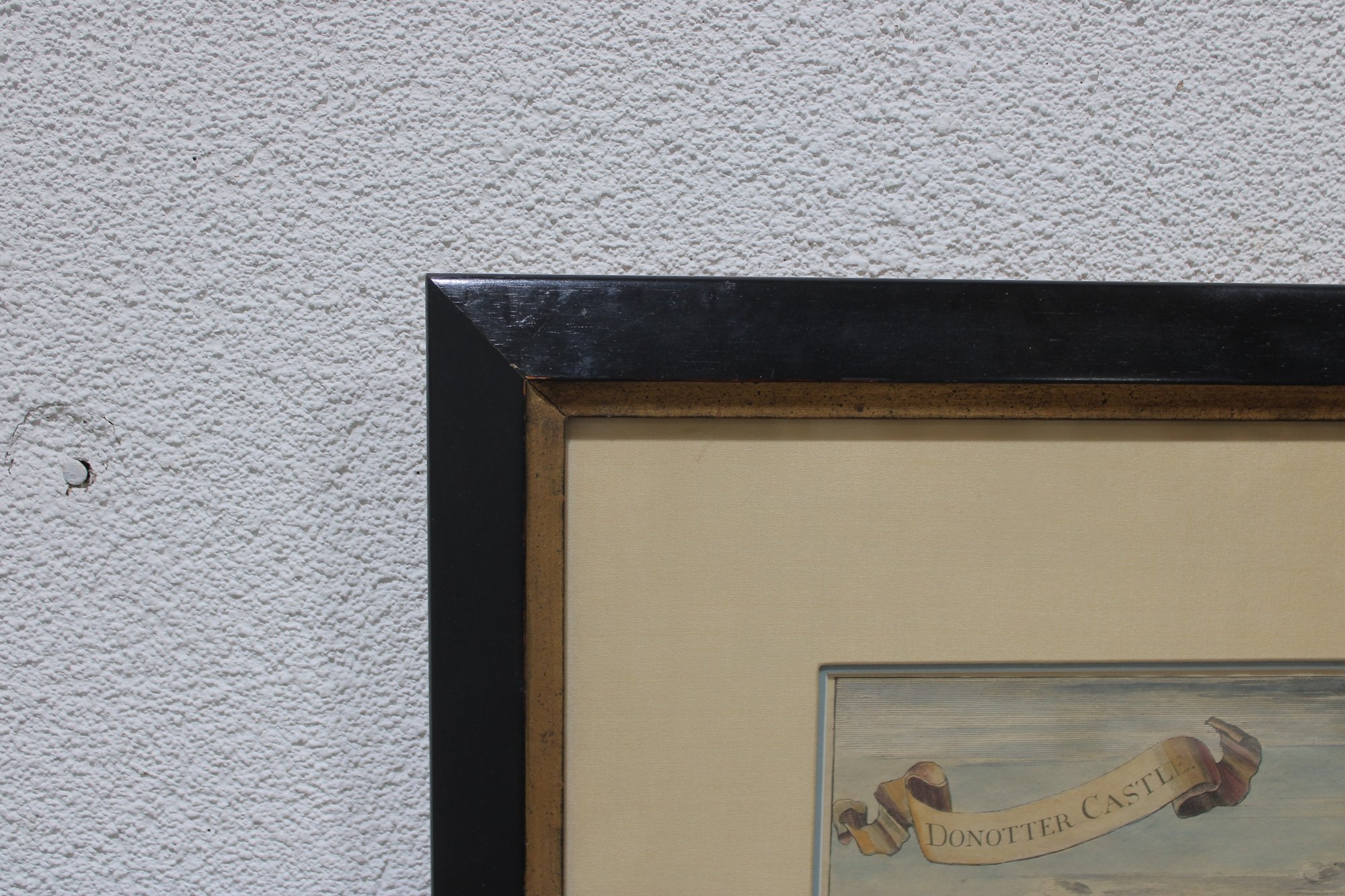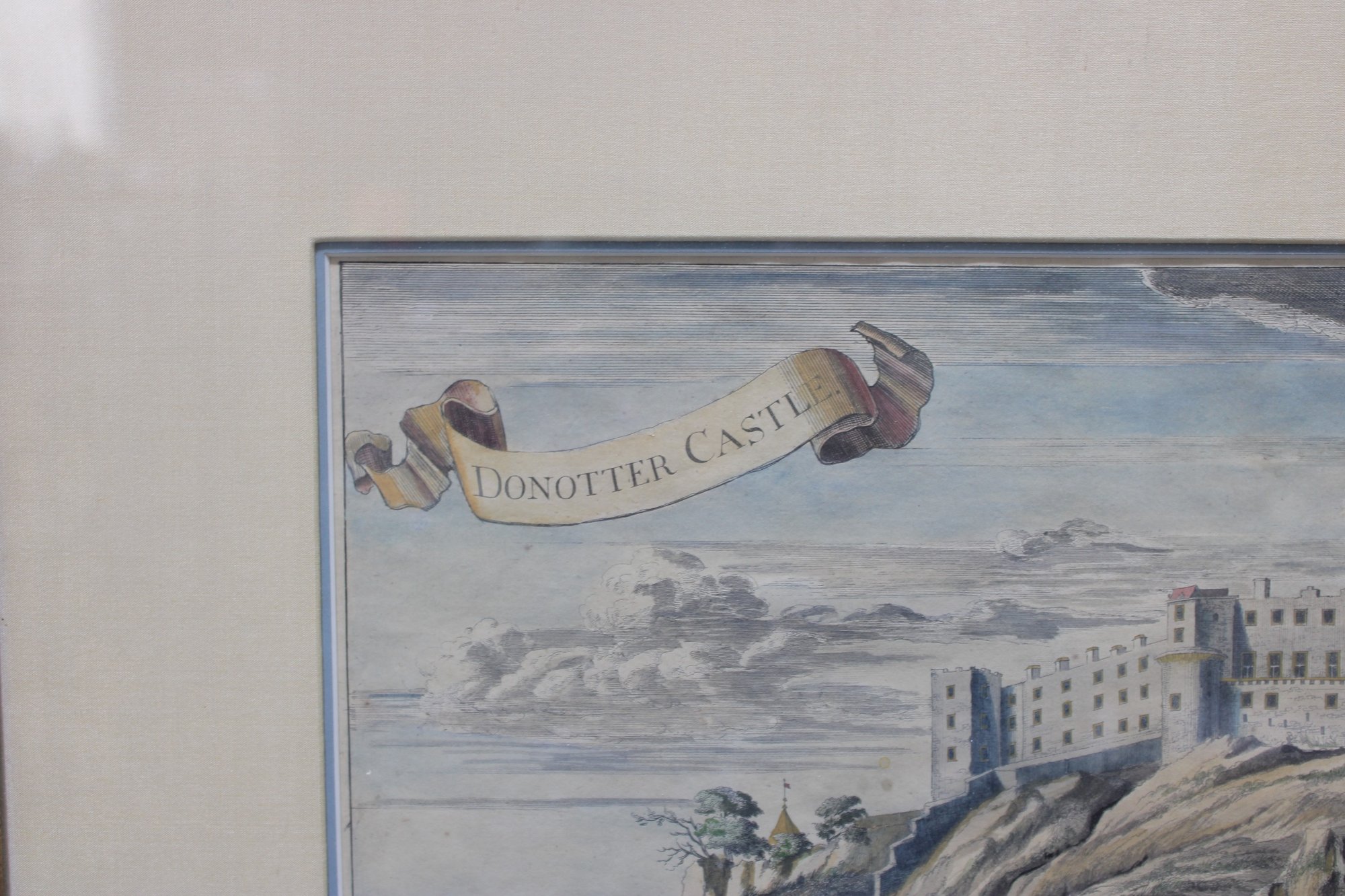 The image is titled “Donottar Castle” within a decorative banner at the top of the composition. The print is professionally matted and housed in a black-painted wood frame with gilt inner liner, giving it a classic and elegant presentation suitable for traditional or historical interiors.