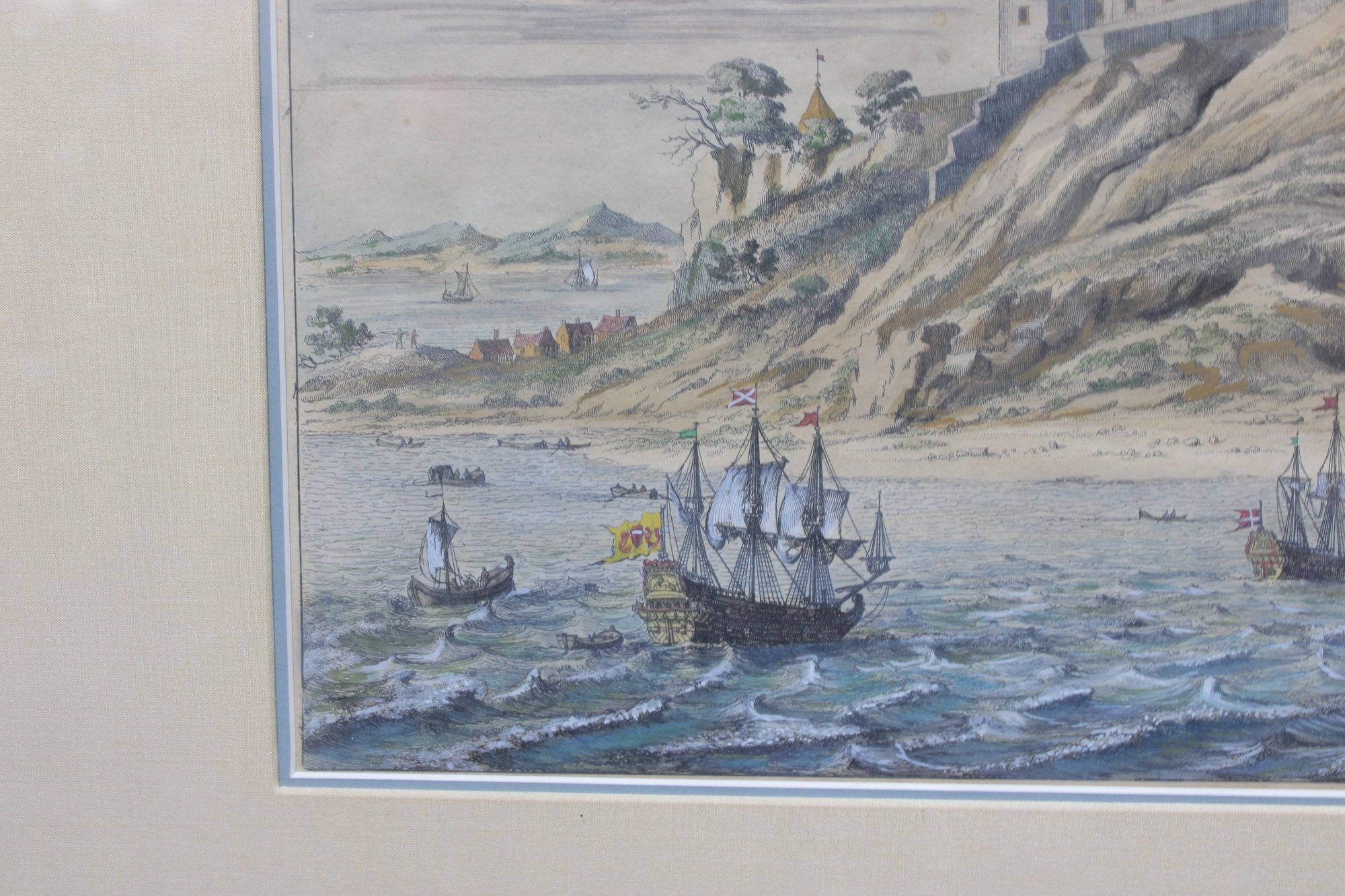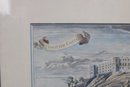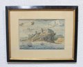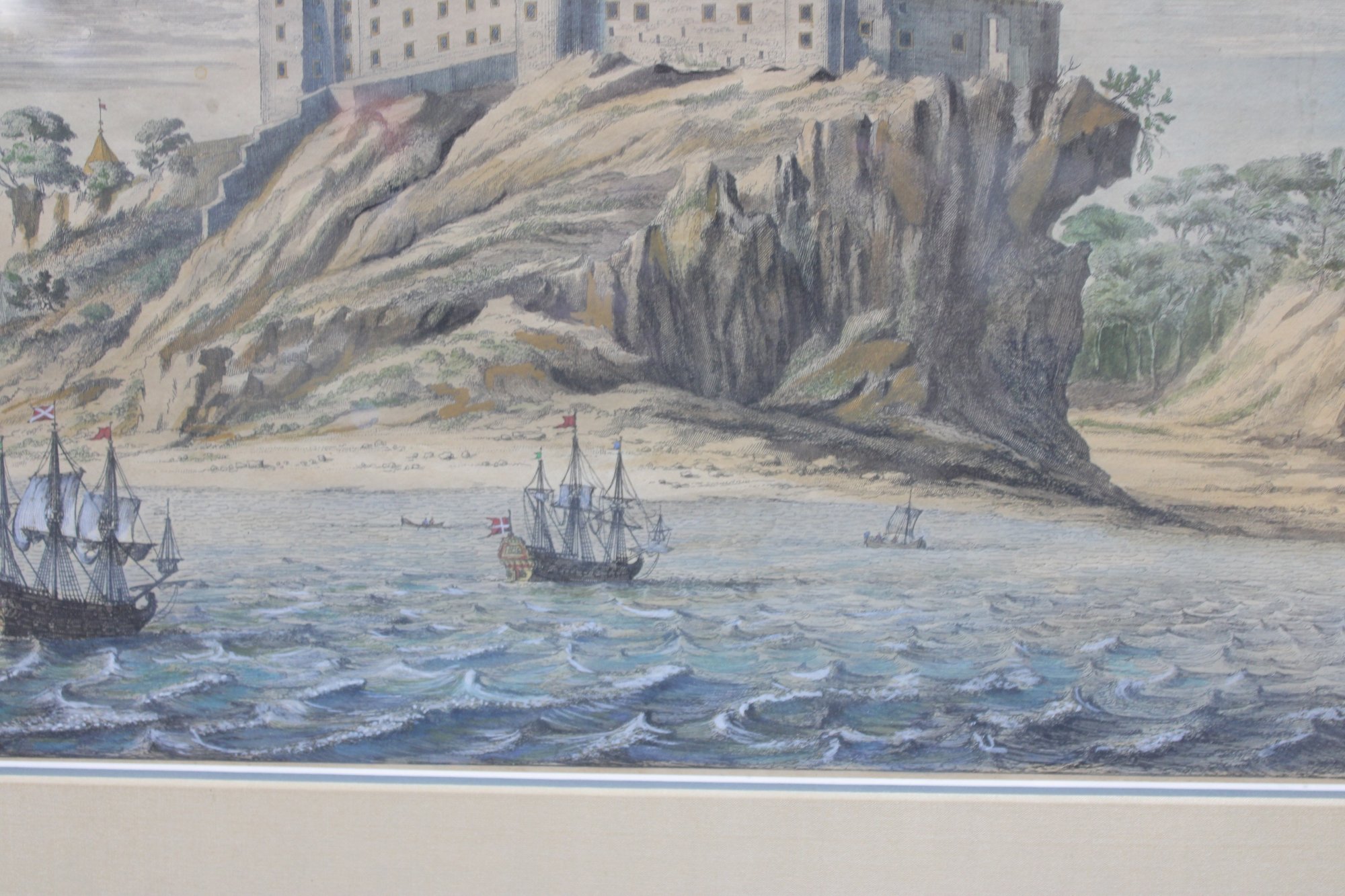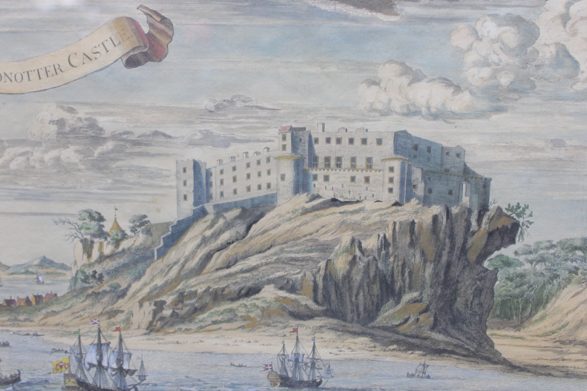 a framed antique lithograph depicting Donottar (Dunnottar) Castle, dramatically situated atop a rocky coastal promontory overlooking the sea. The scene features sailing vessels below and a sweeping sky, rendered in soft hand-colored tones typical of early scenic and topographical lithographs.