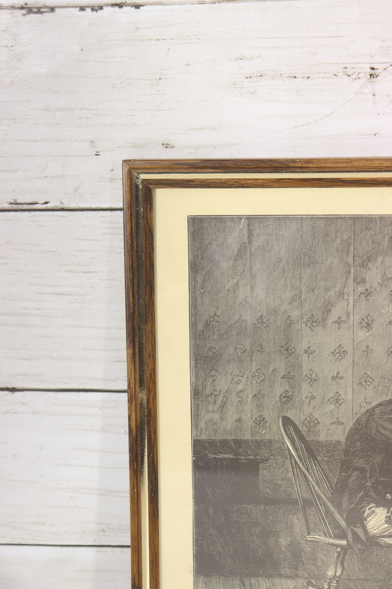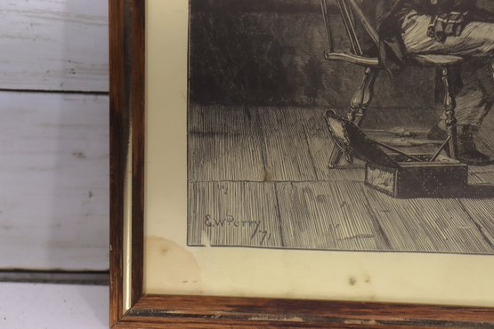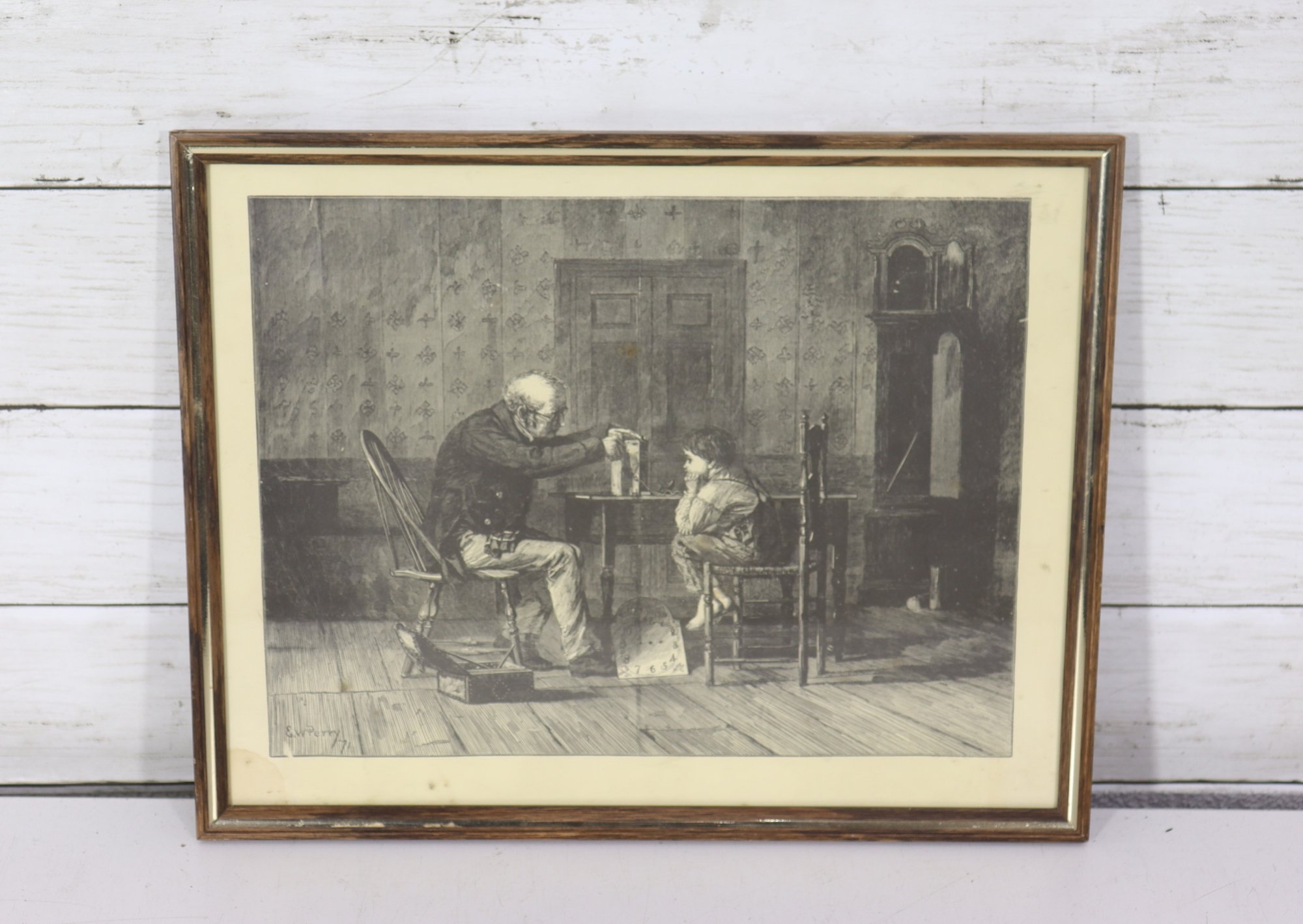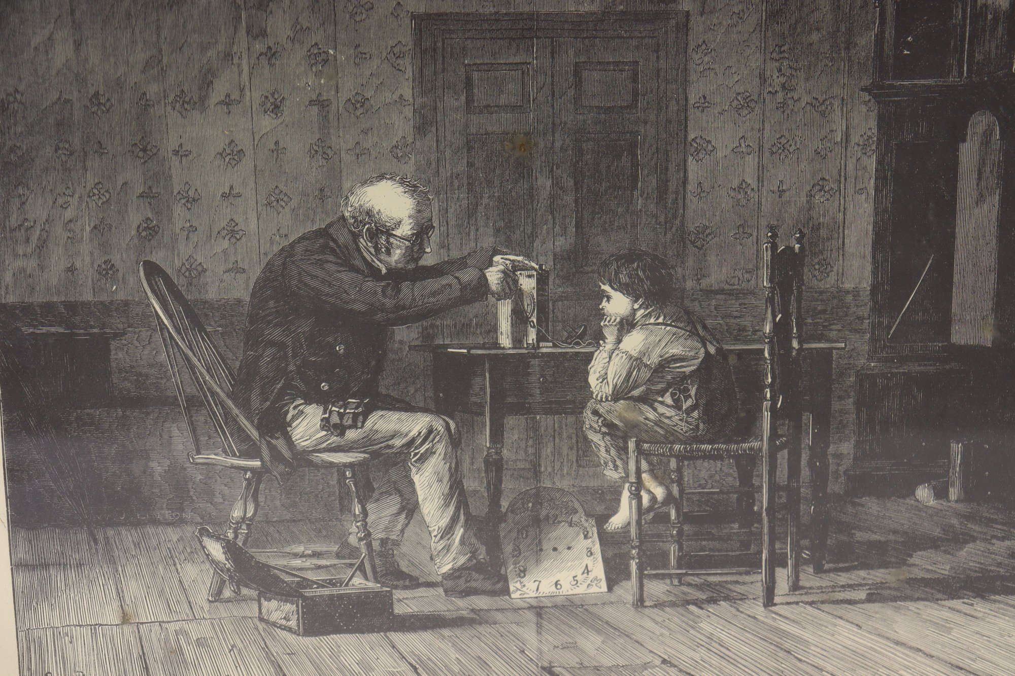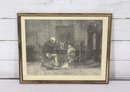 framed genre print depicting an intimate interior scene, showing an elderly man instructing a young child at a small table. The image captures a quiet, reflective moment, rendered with strong contrast, detailed line work, and careful attention to gesture and expression.