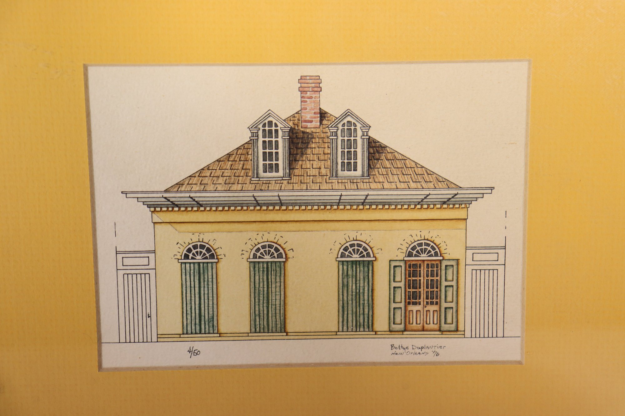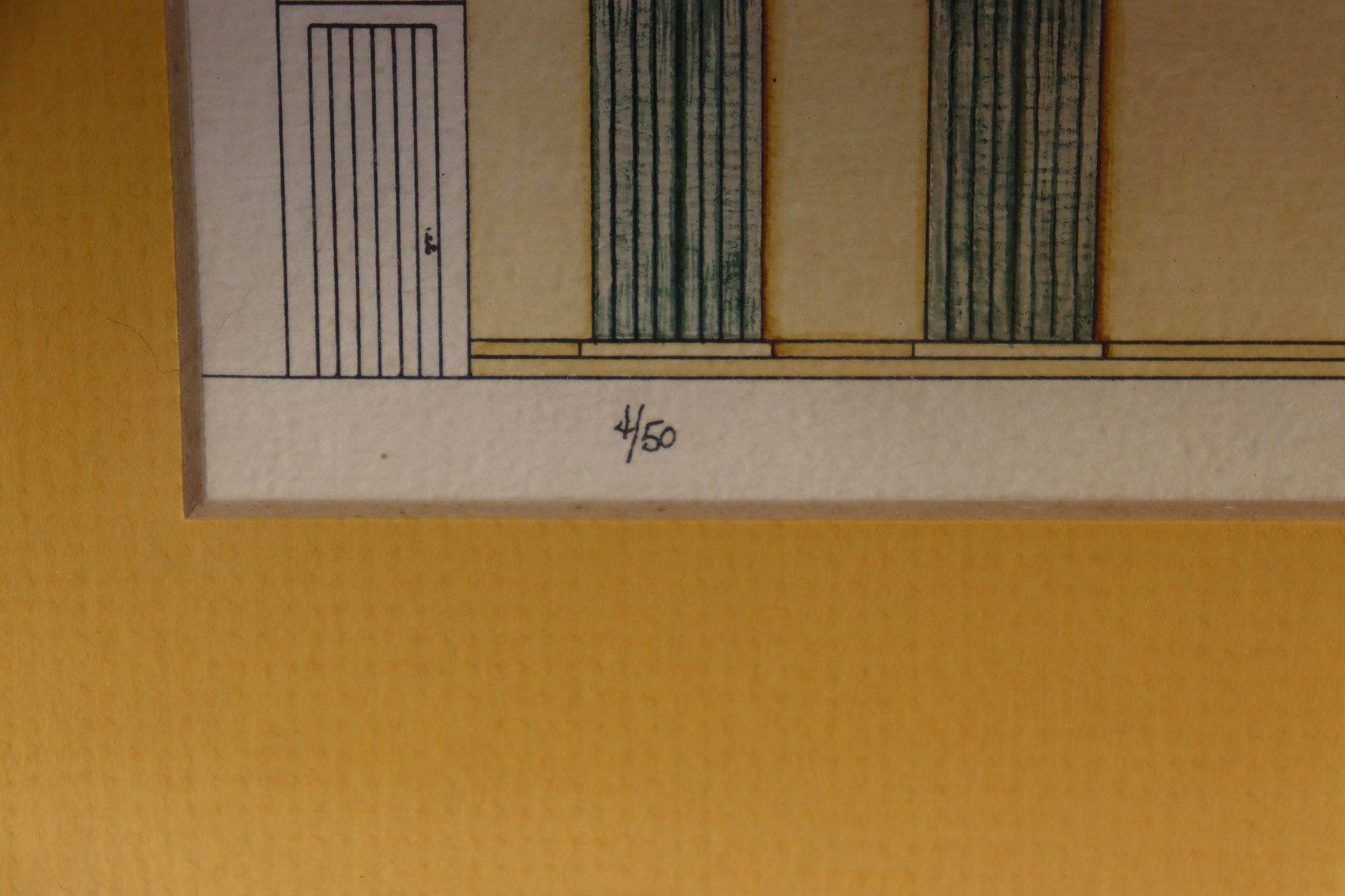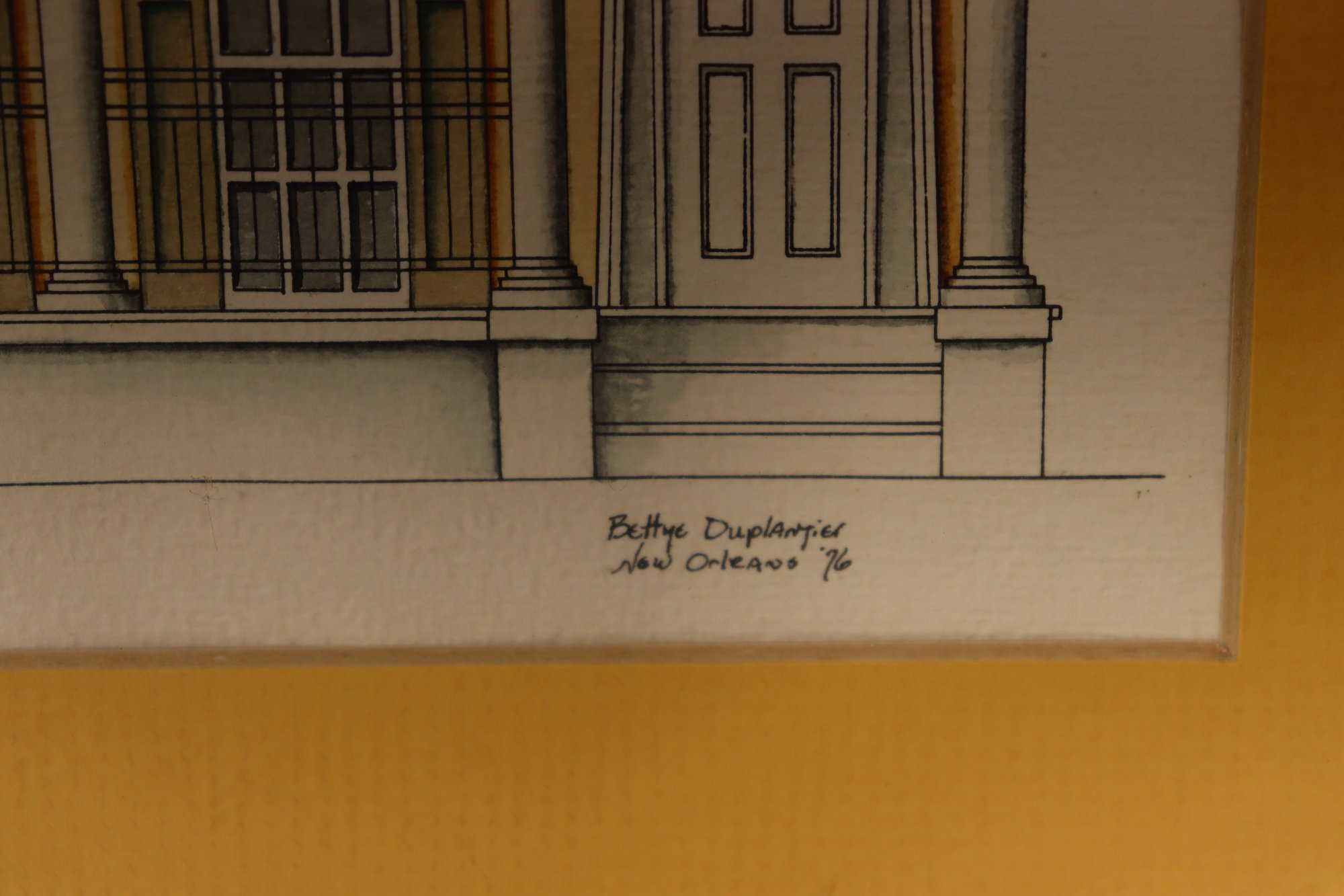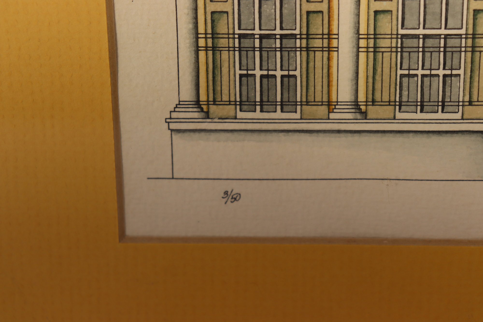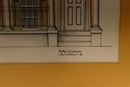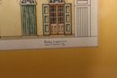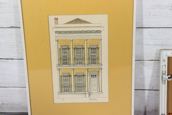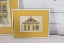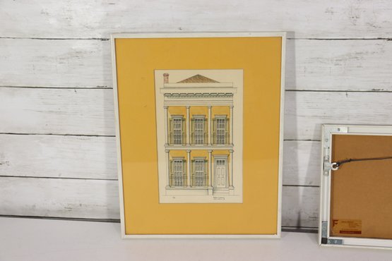 a pair of framed architectural illustration prints, each depicting classic historic building façades. The prints feature detailed linework with soft color accents and are attractively presented with golden yellow matting and simple frames.