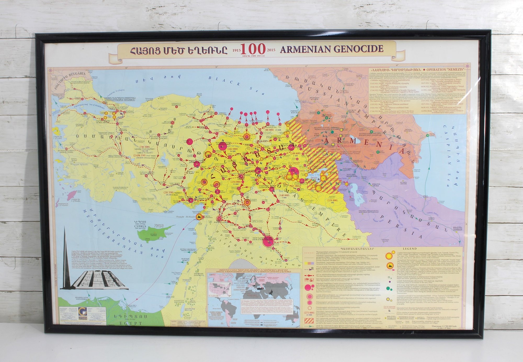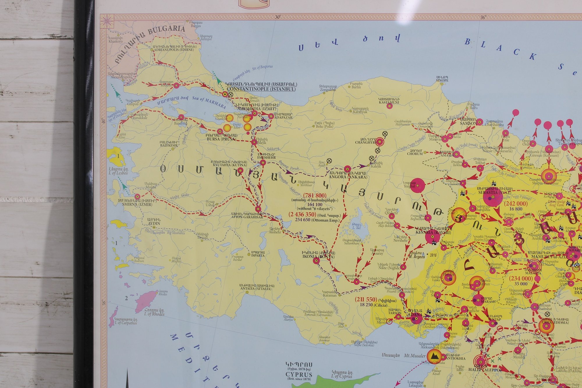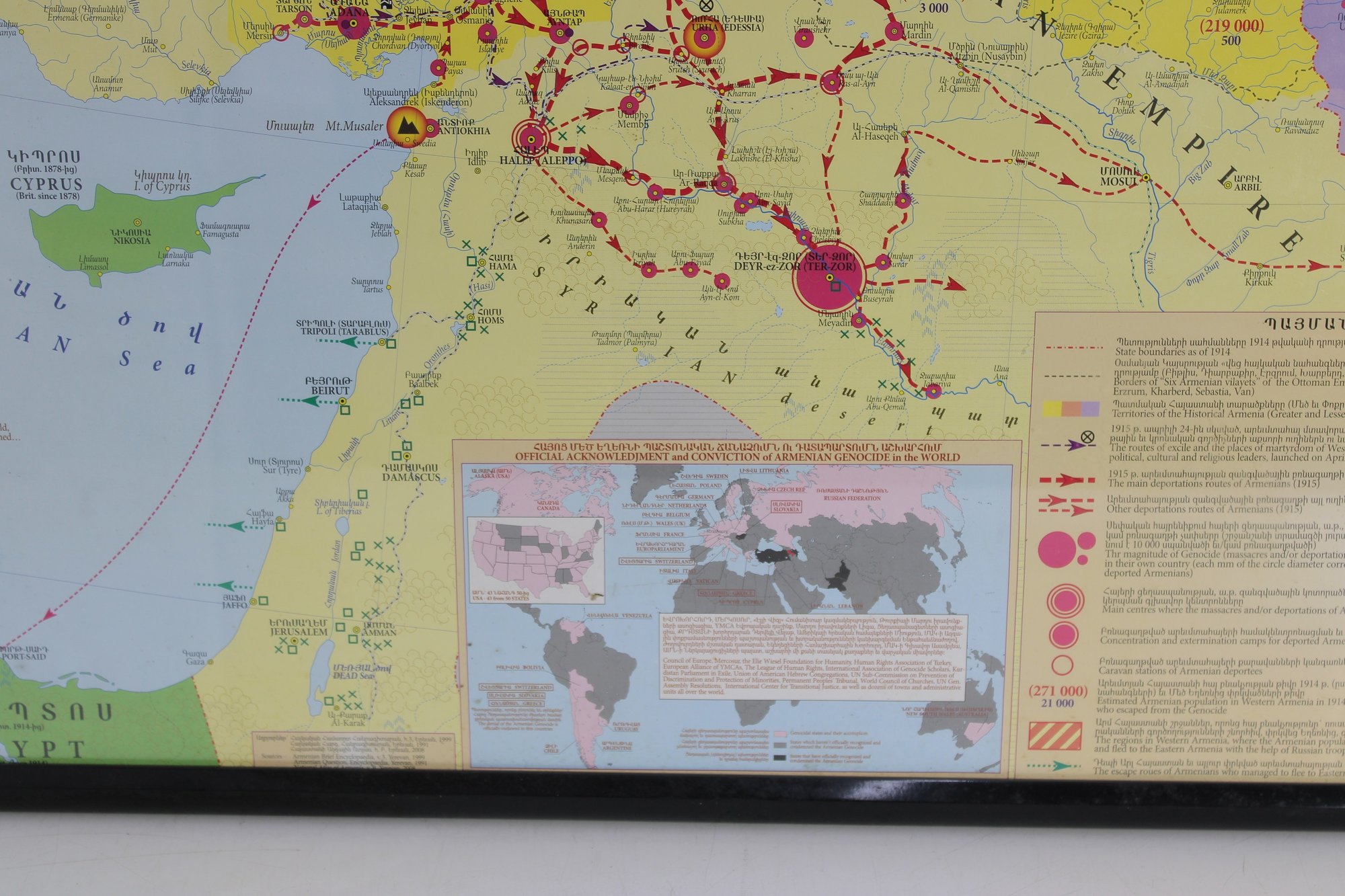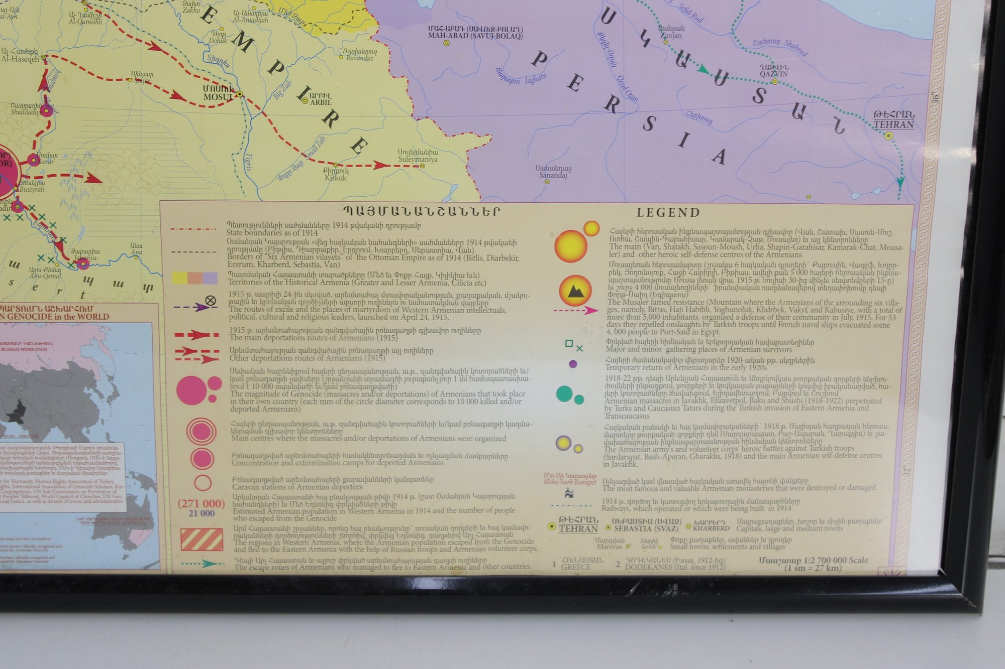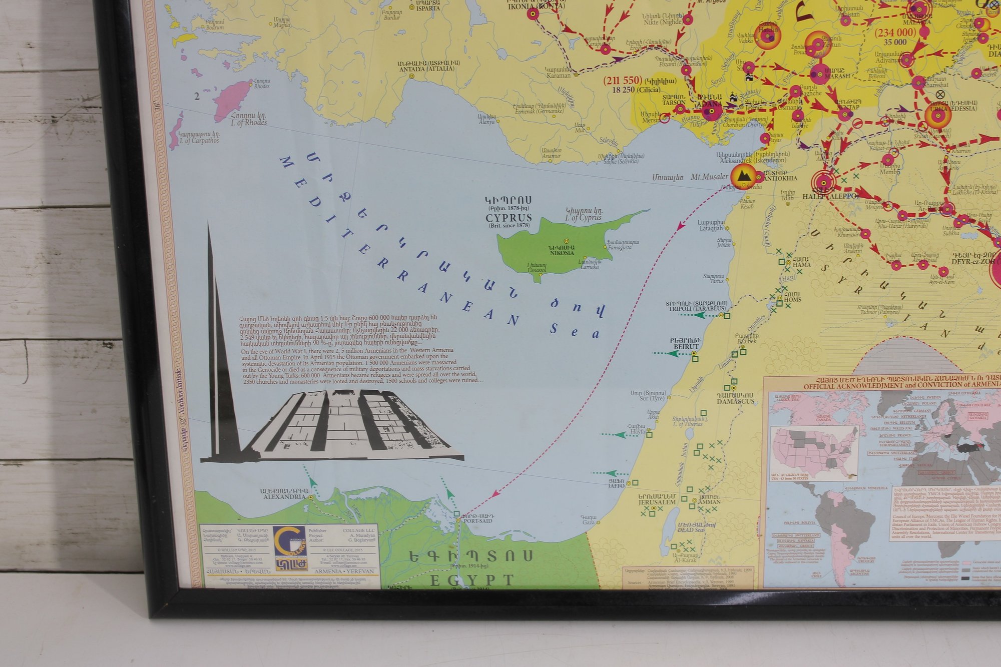 Large framed Armenian Genocide historical map print measuring approximately 28.5" x 41". This detailed educational map illustrates historical regions, migration routes, and significant locations connected to the events commemorated between 1915–2015. Featuring informative text panels, geographic markings, and vivid color-coded details, this piece serves as both a historical reference and a meaningful cultural display.