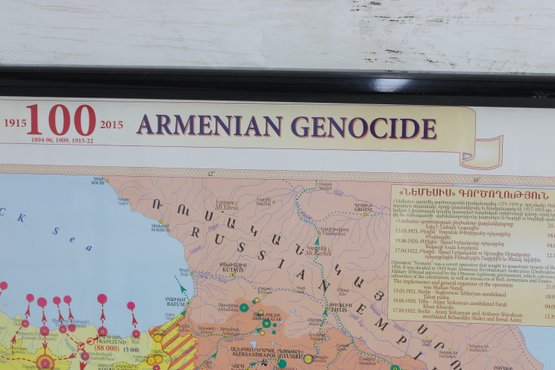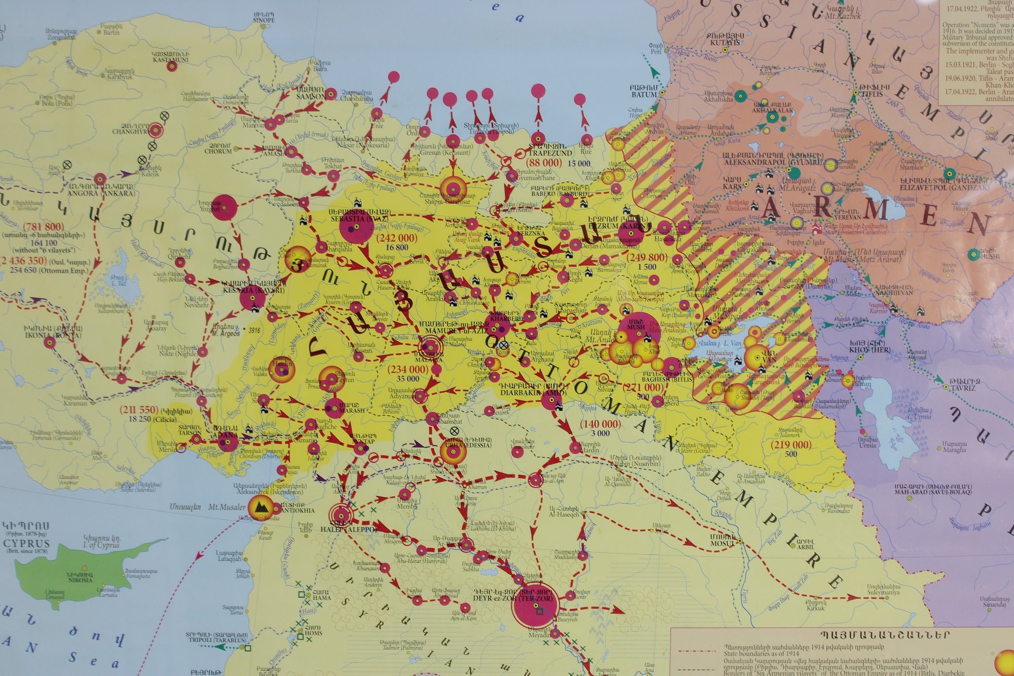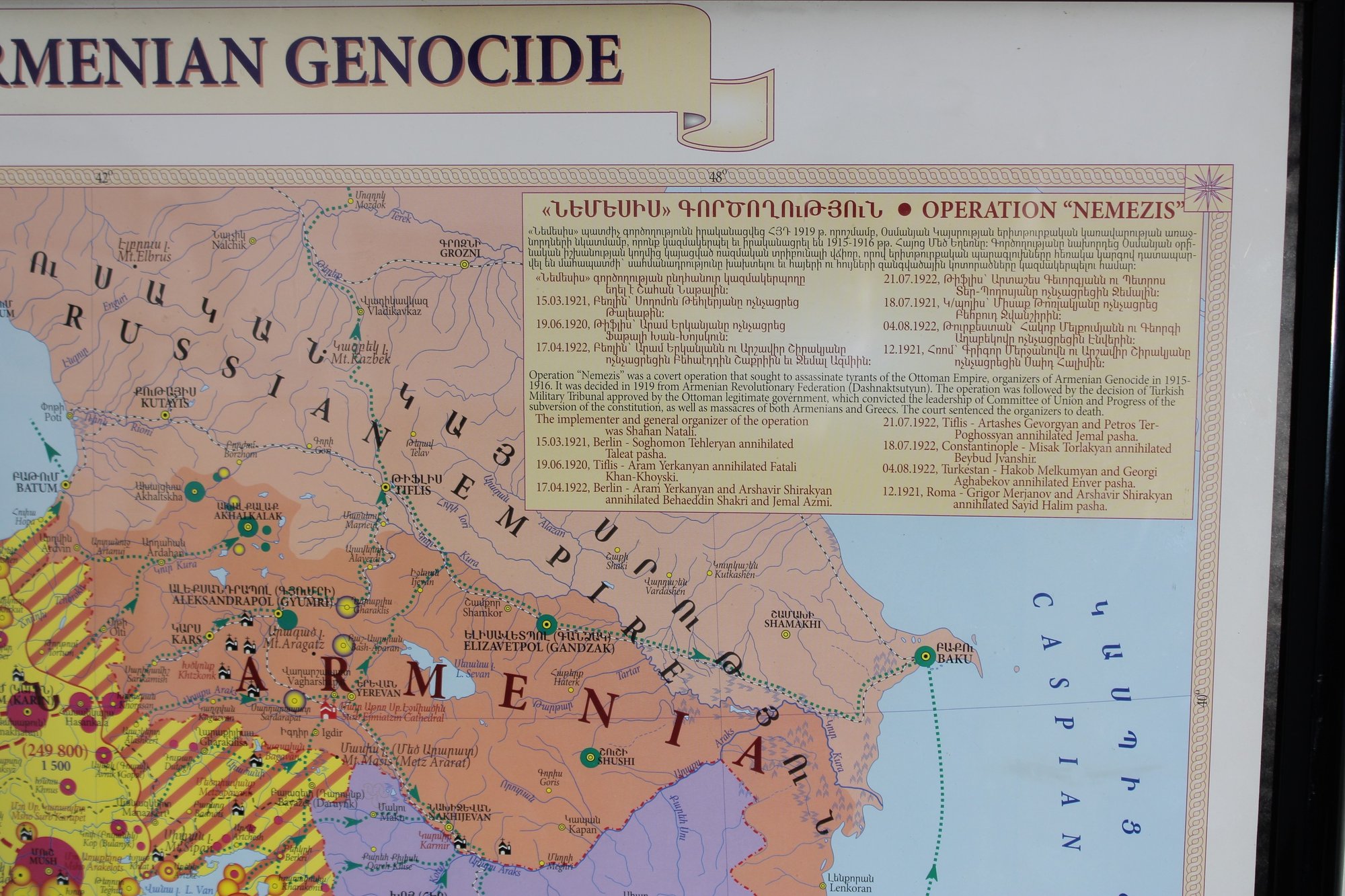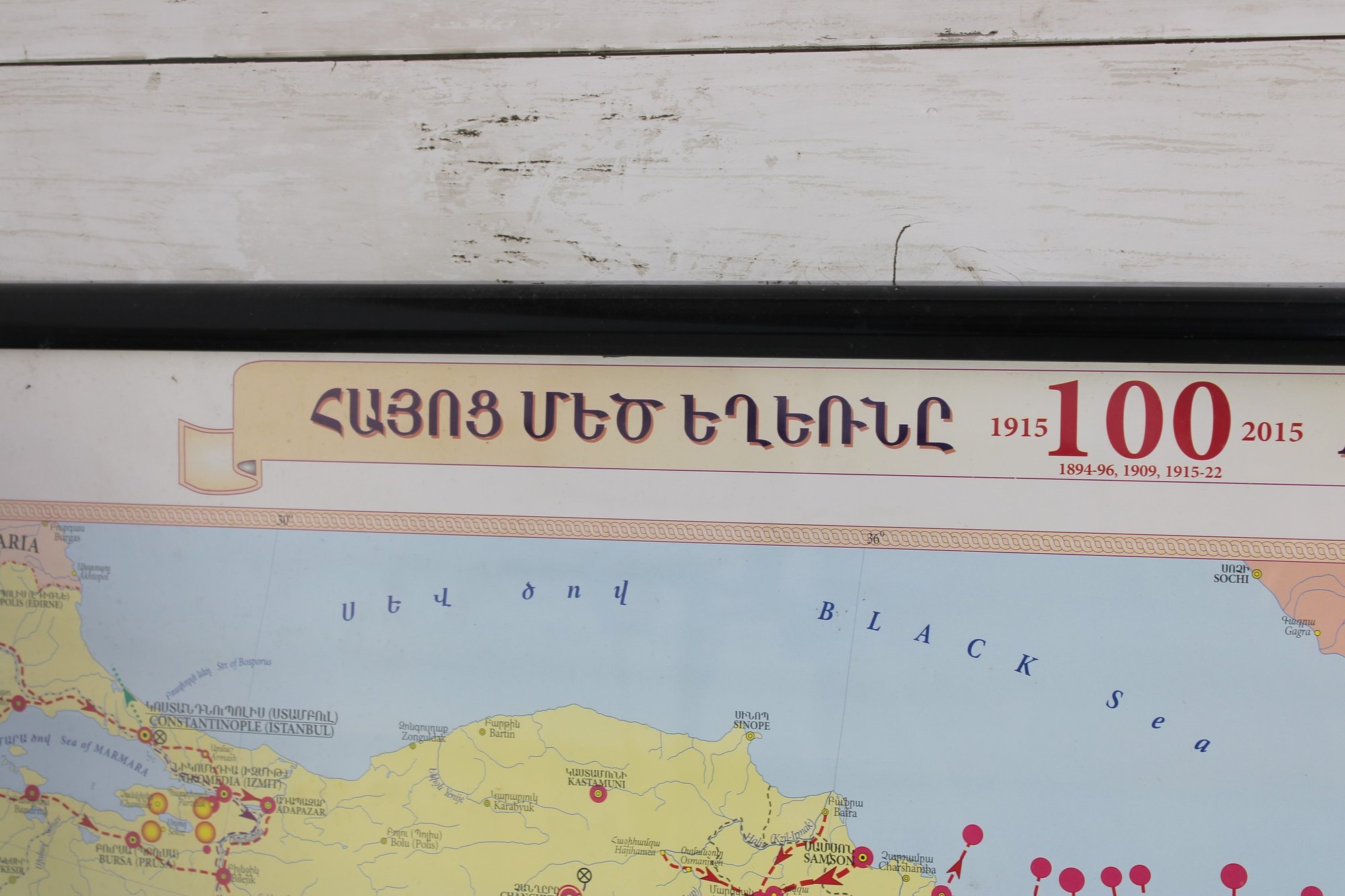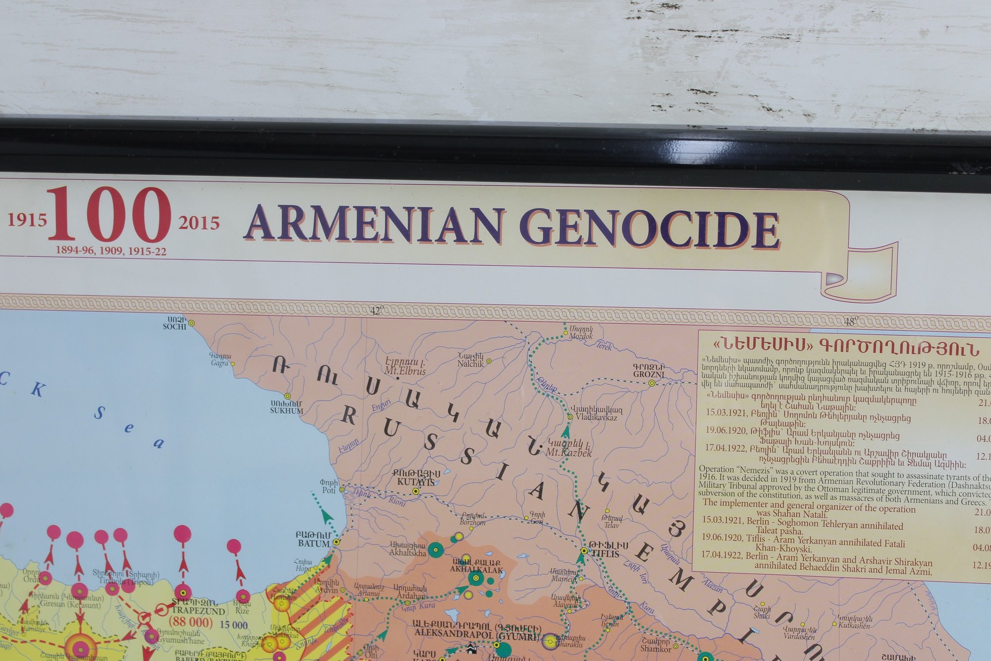 Large framed Armenian Genocide historical map print measuring approximately 28.5" x 41". This detailed educational map illustrates historical regions, migration routes, and significant locations connected to the events commemorated between 1915–2015. Featuring informative text panels, geographic markings, and vivid color-coded details, this piece serves as both a historical reference and a meaningful cultural display.