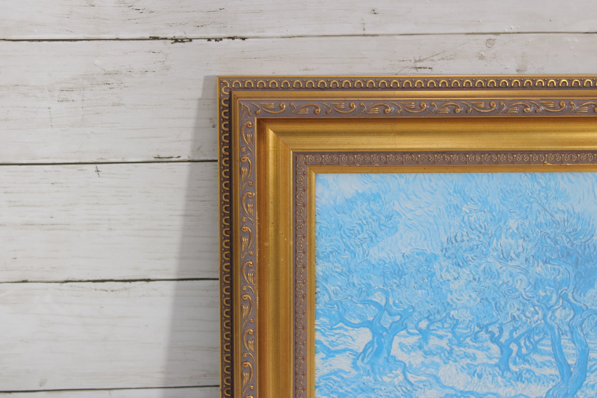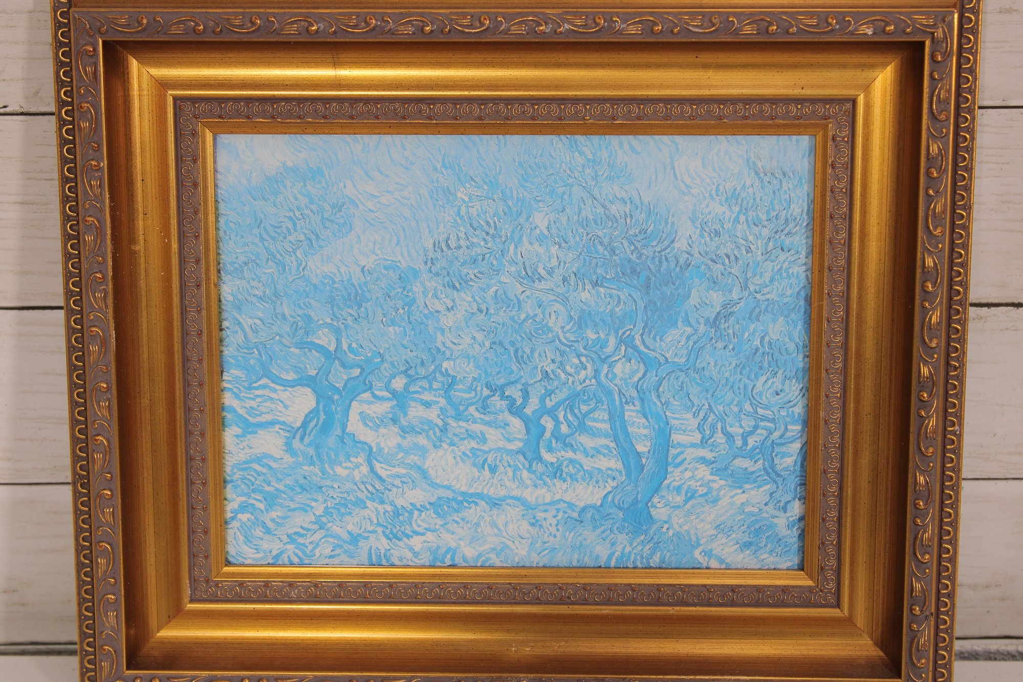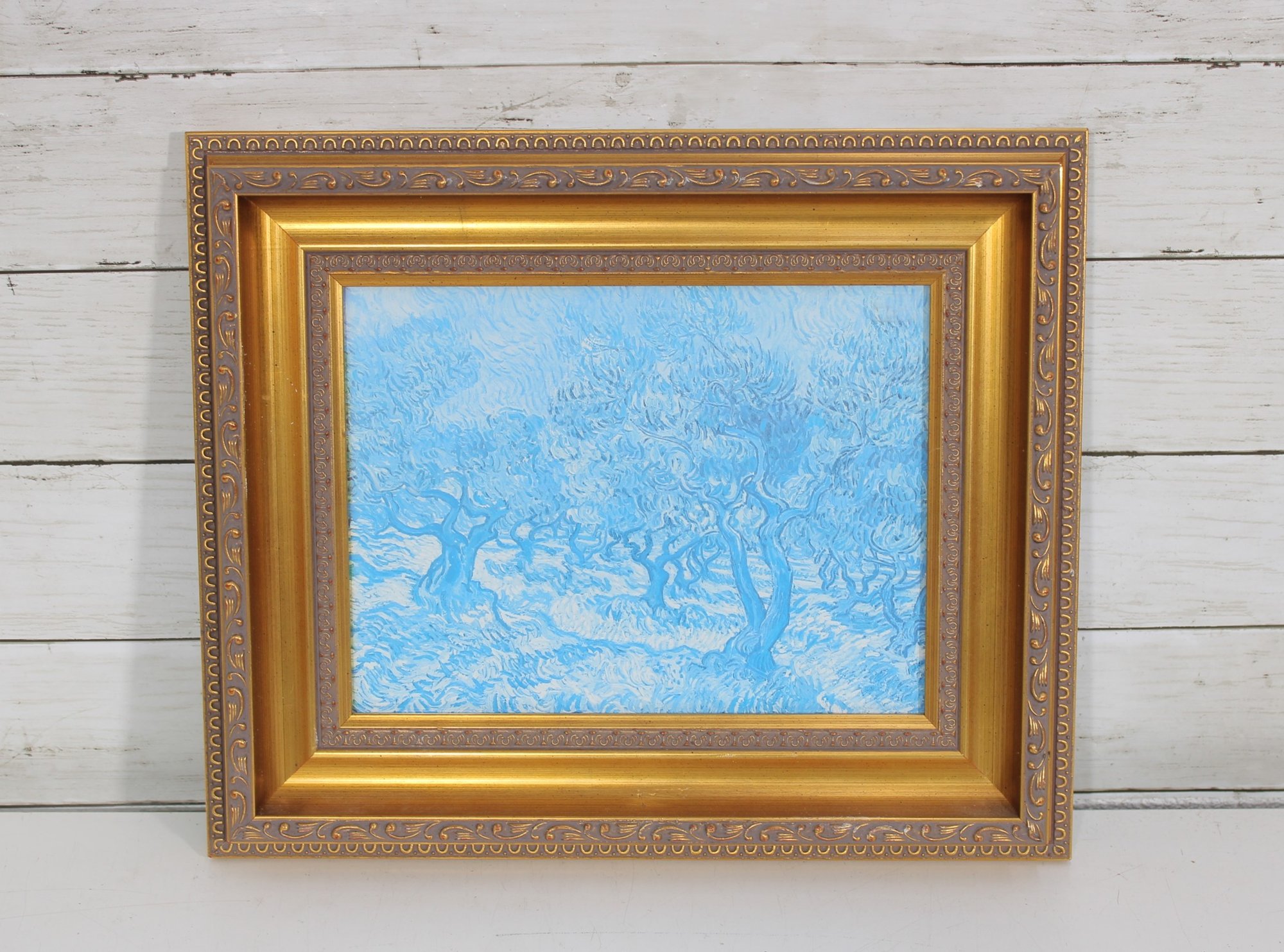 print features a serene blue landscape scene rendered in soft, calming tones. The image depicts a peaceful natural setting with trees and open land, creating a tranquil, almost dreamlike atmosphere. The artwork is beautifully presented in an ornate gold-tone frame with decorative detailing that adds a classic, timeless touch.