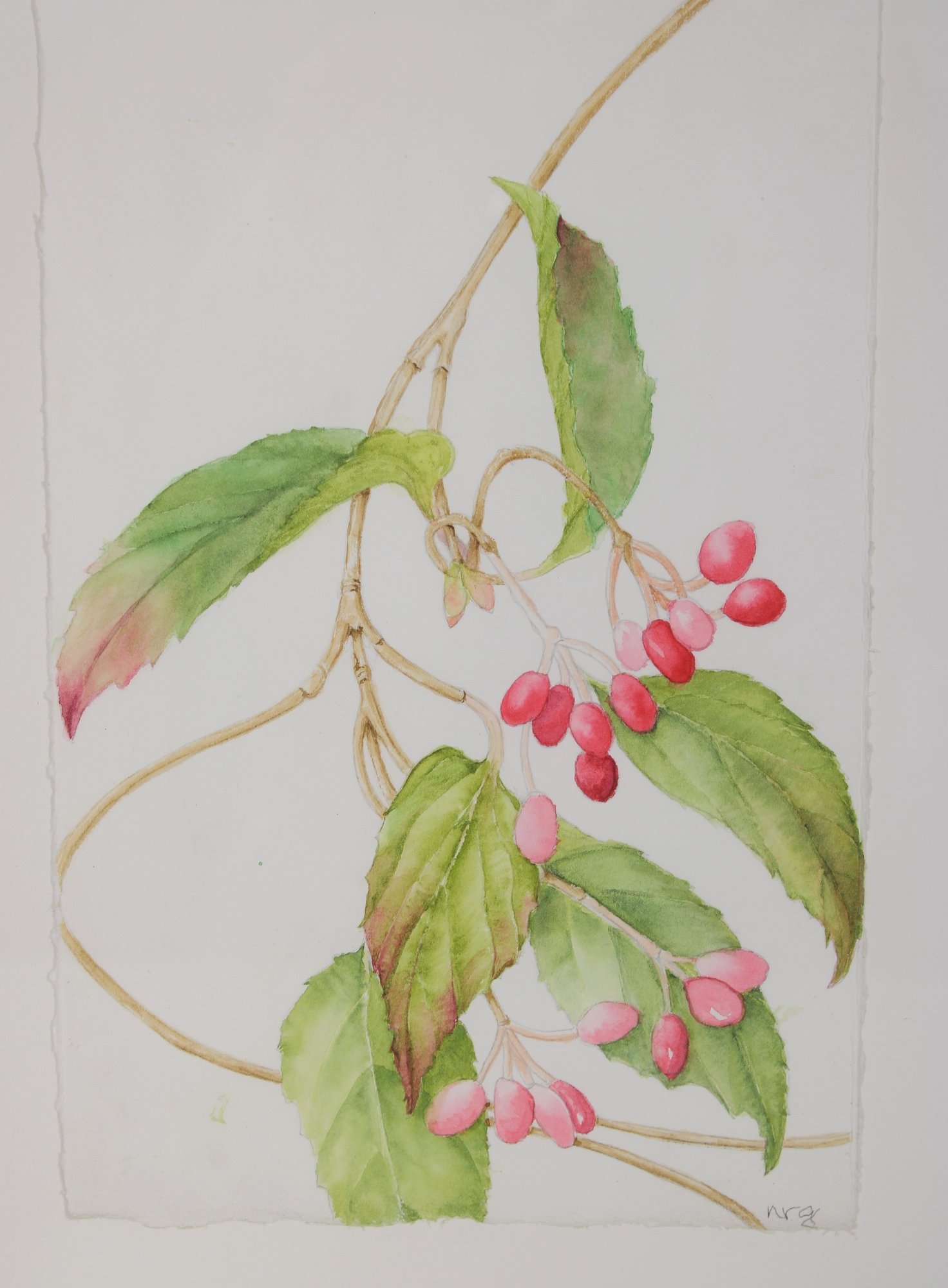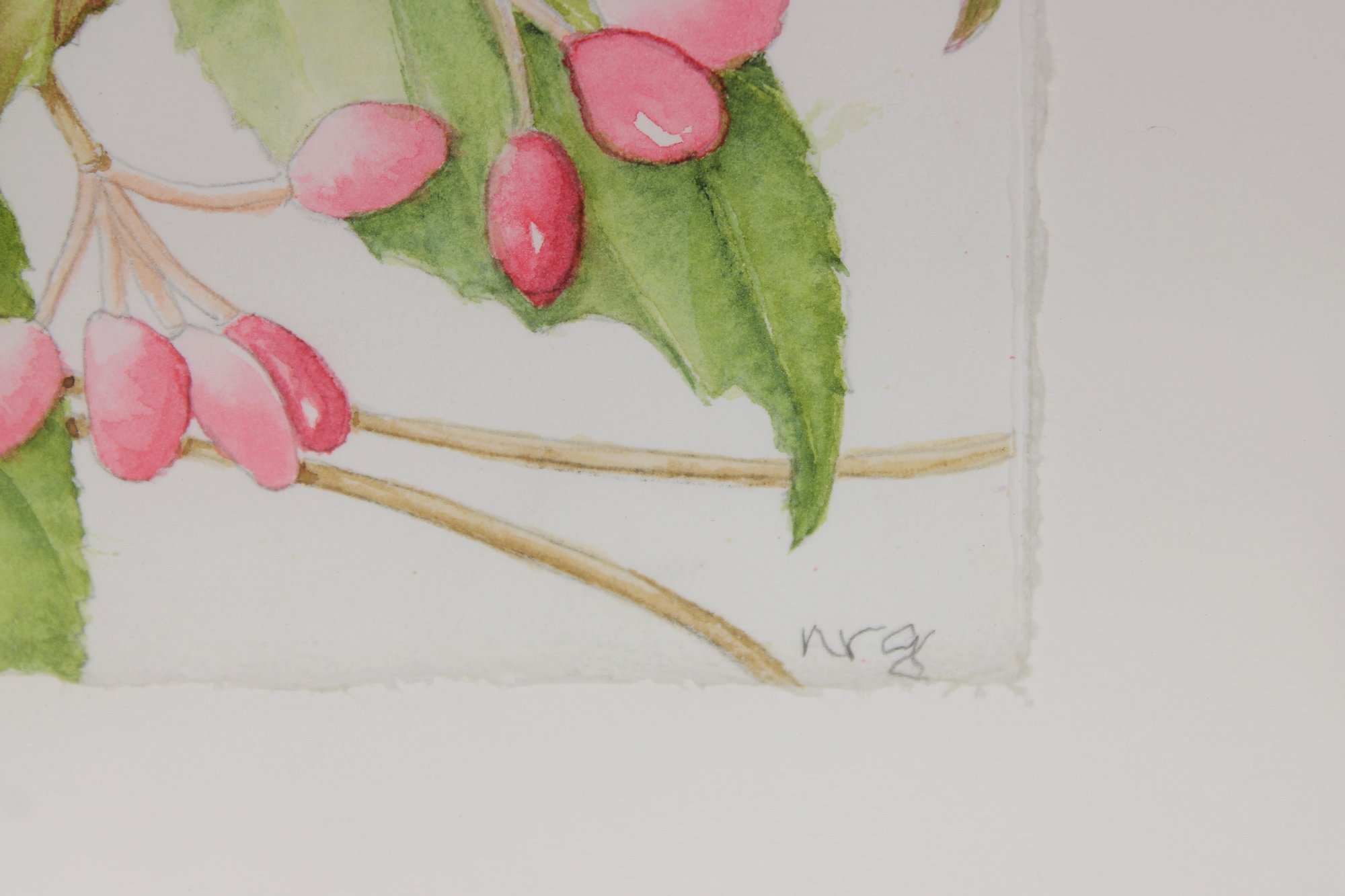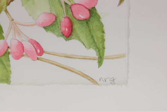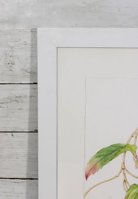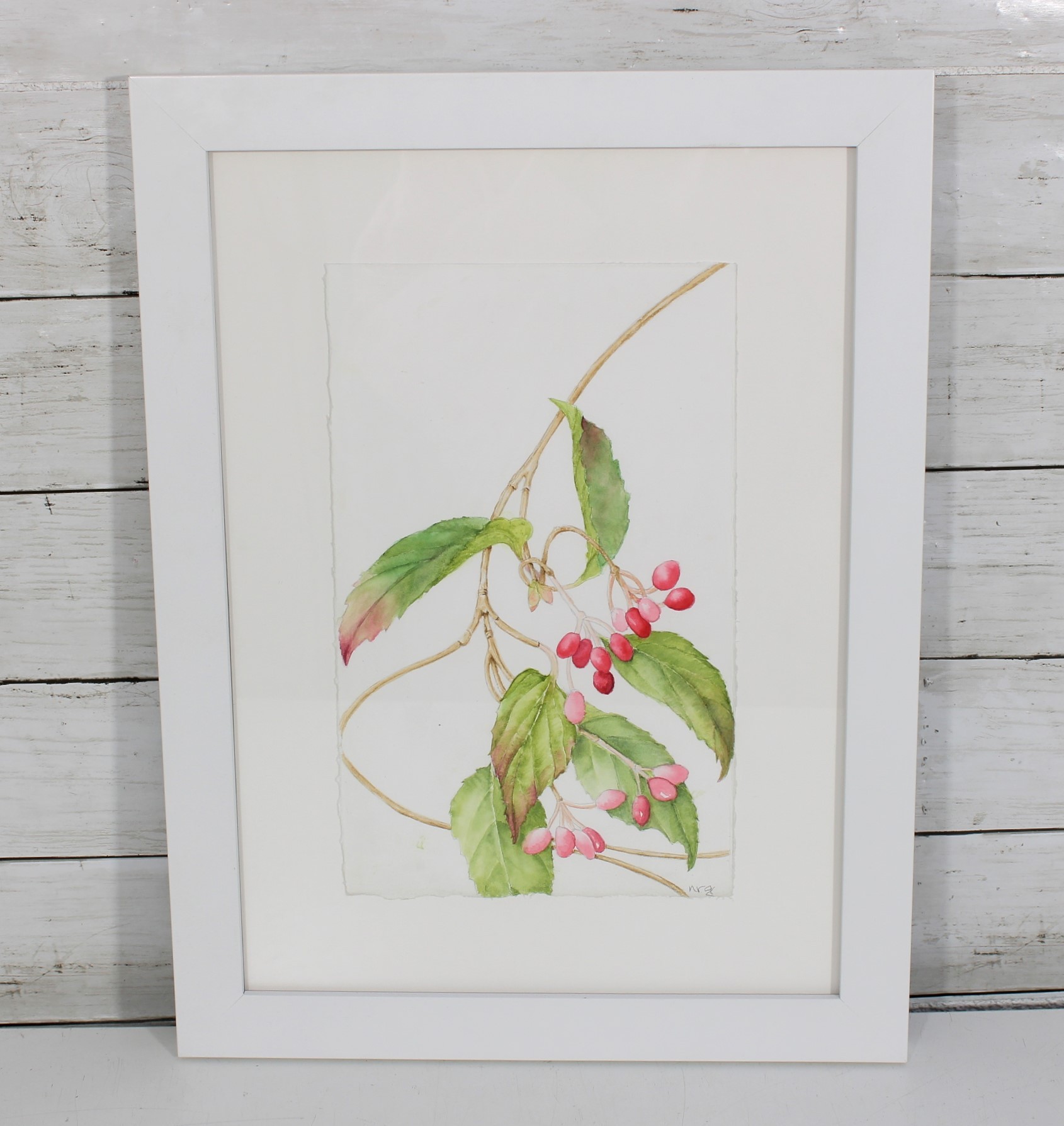 Beautiful framed botanical artwork featuring a delicate watercolor-style rendering of a leafy branch with clusters of soft pink berries. The composition is elegant and naturalistic, with fine detail and gentle color tones that make it a perfect addition to cottage, farmhouse, or traditional décor.
