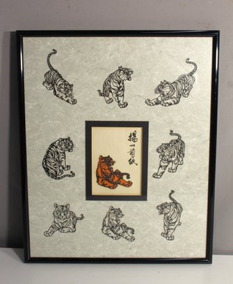 This beautifully framed artwork features a series of intricate Chinese tiger paper-cuts surrounding a central, colored paper-cut tiger paired with calligraphy. The design is executed with fine precision, displaying the traditional craftsmanship of Chinese paper cutting, a renowned folk art. The tigers are captured in various dynamic poses, symbolizing strength, courage, and power in Chinese culture.