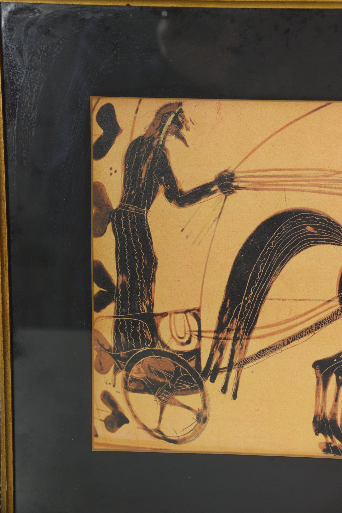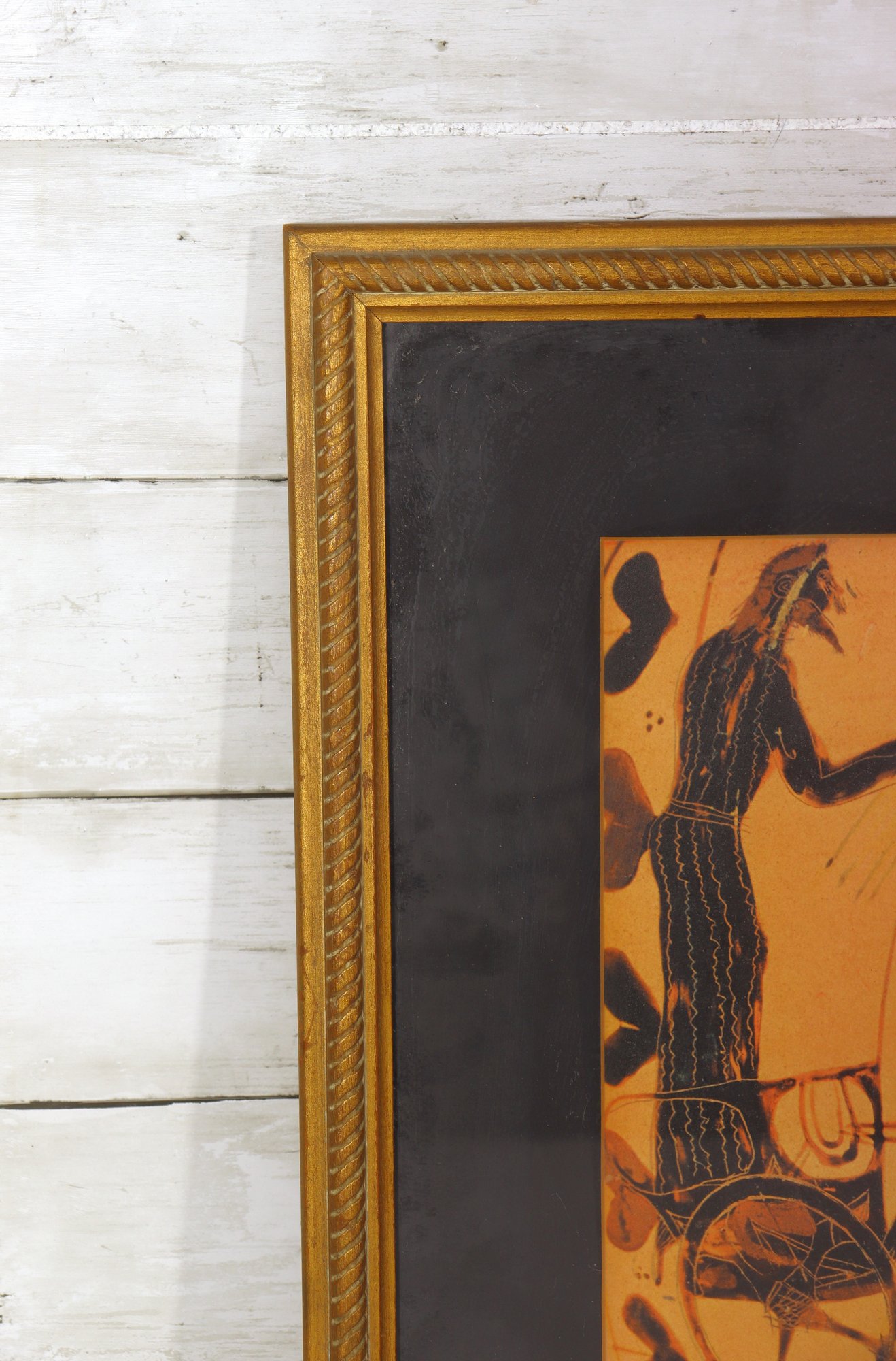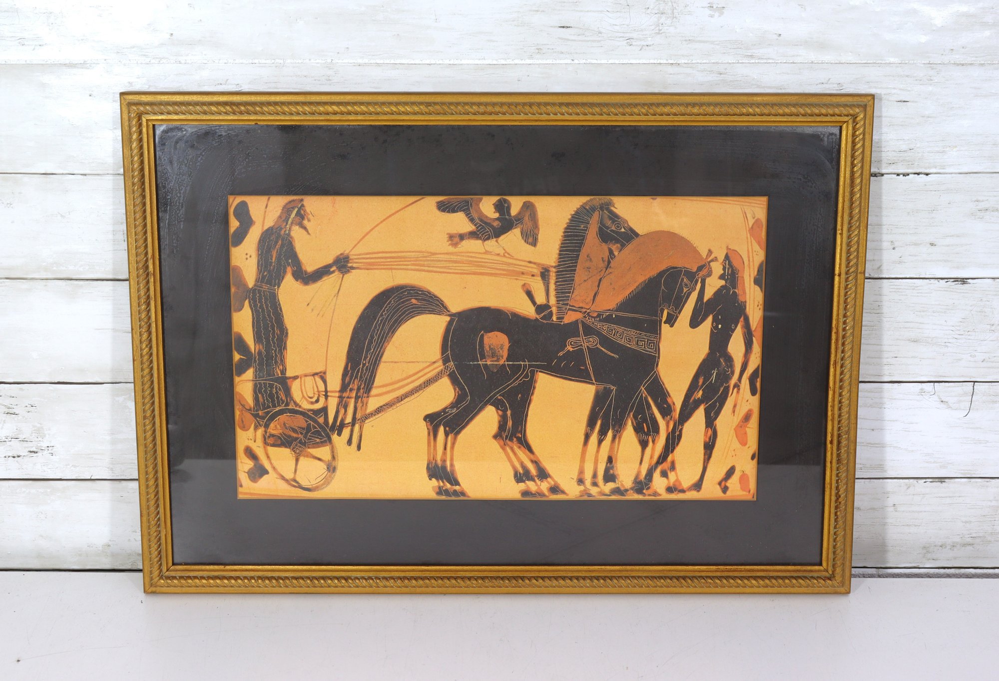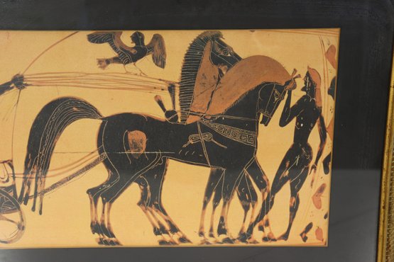 framed artwork depicting a classical Greek–style scene, inspired by ancient black-figure pottery imagery. The composition features stylized horsemen, a chariot, and dynamic figures rendered in bold black silhouettes against a warm terracotta-colored ground—echoing the look of ancient Attic vase painting.
