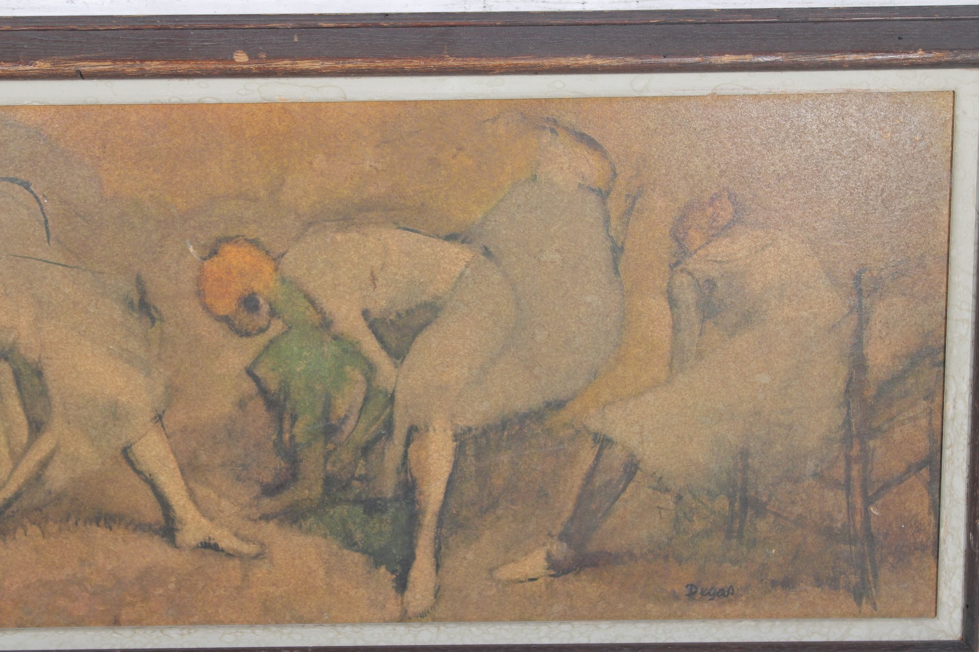 This horizontal composition shows several dancers bending and stretching in preparation, forming a flowing frieze-like arrangement across the scene. The warm pastel tones and sketch-like style are characteristic of Degas’ famous ballet works.