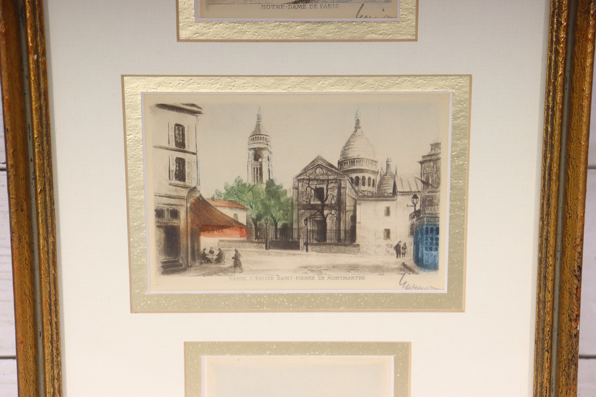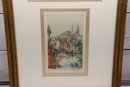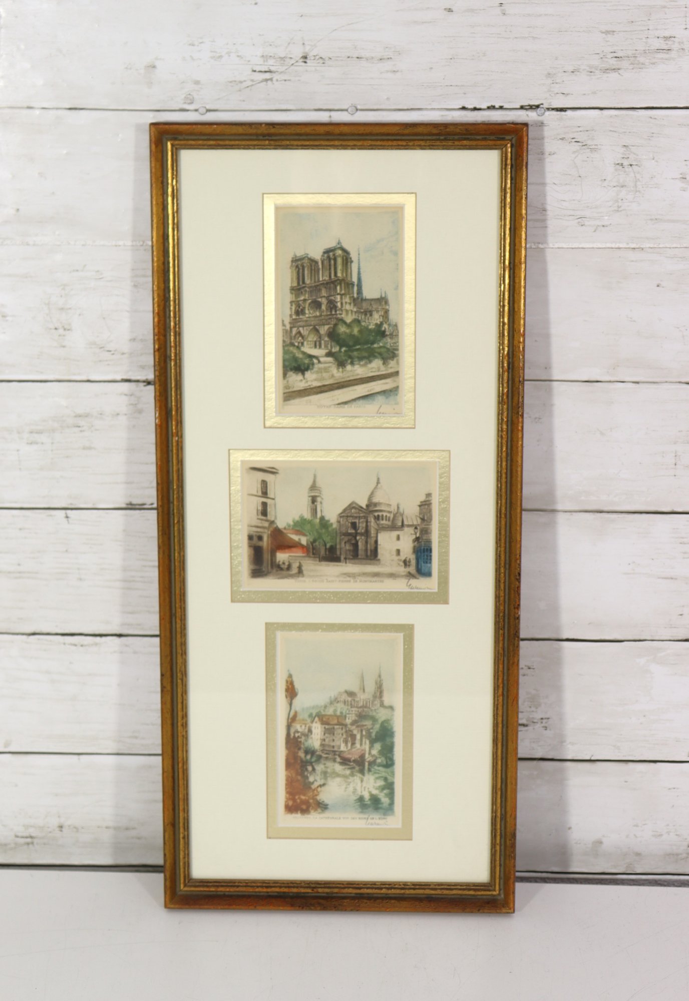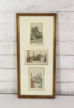 framed vertical wall art piece featuring three European cityscape prints, attractively arranged in a single frame with coordinating matting. The artwork depicts historic architecture and scenic town views, giving this piece a classic travel-inspired aesthetic.