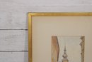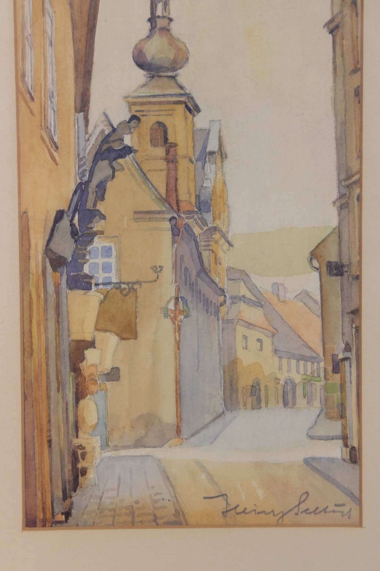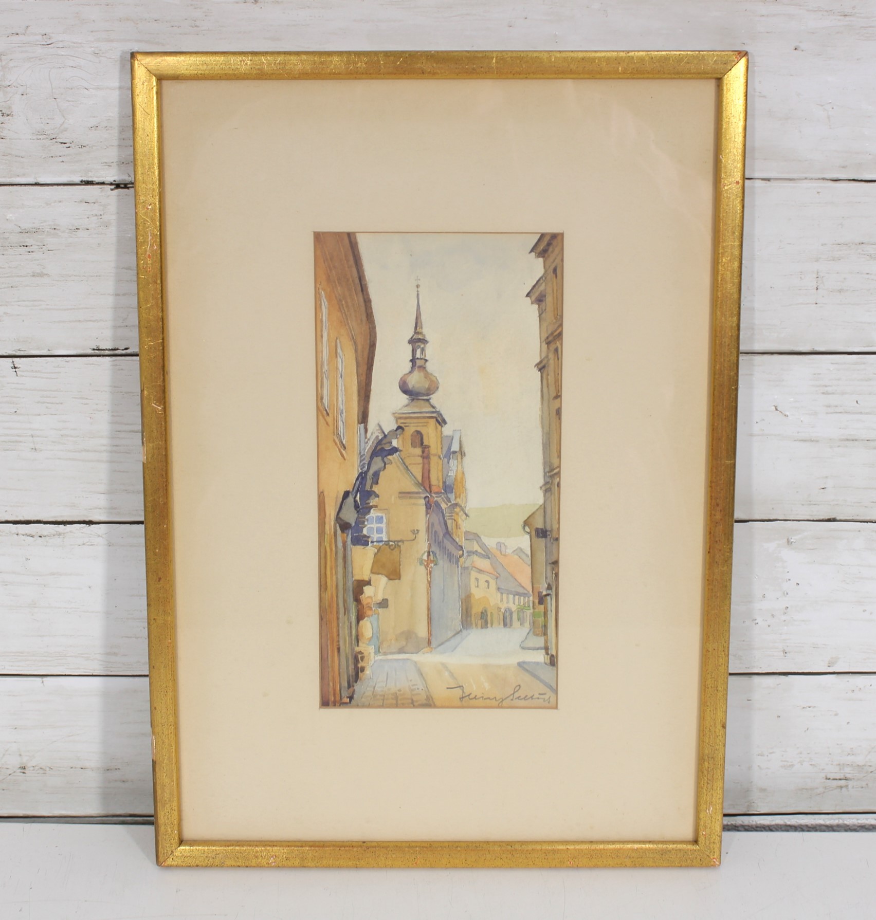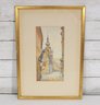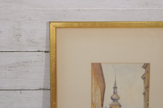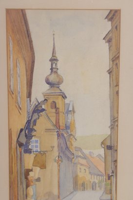 framed watercolor depicting a charming European street scene, featuring a narrow passageway leading toward a prominent church tower with a distinctive spire. The warm tones of the surrounding buildings and soft architectural details create a peaceful, old-world atmosphere.