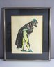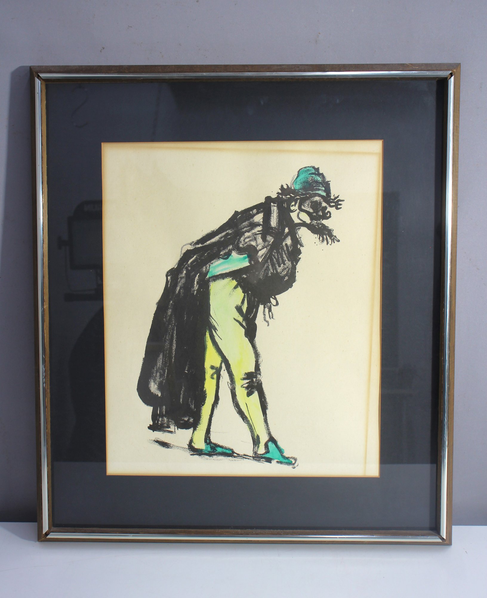 An expressive lithograph featuring a whimsical clown figure in black, yellow, and teal. Set against a black mat and encased in a gold and silver metal frame. Perfect for vintage art collectors or fans of theatrical imagery.
