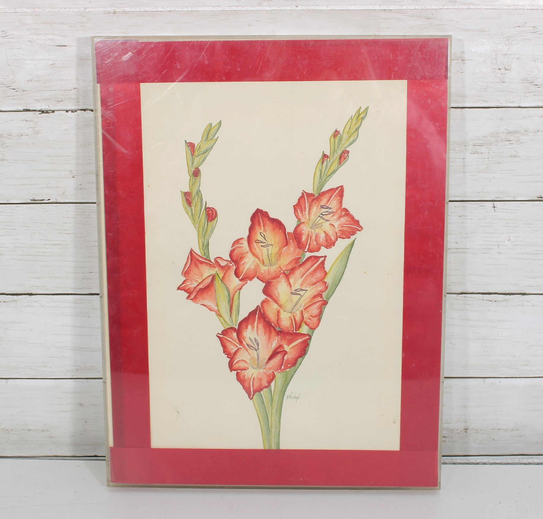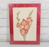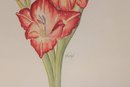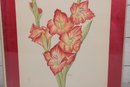 Charming framed floral artwork featuring a detailed illustration of blooming gladiolus flowers in warm coral and pink tones with soft green stems. The composition is delicate and elegant, capturing the natural beauty of the flowers with fine linework and gentle shading.