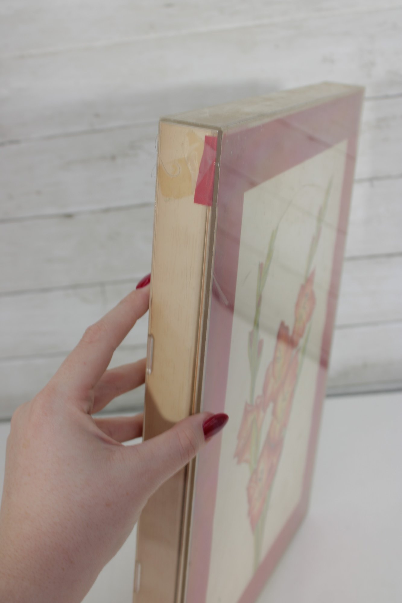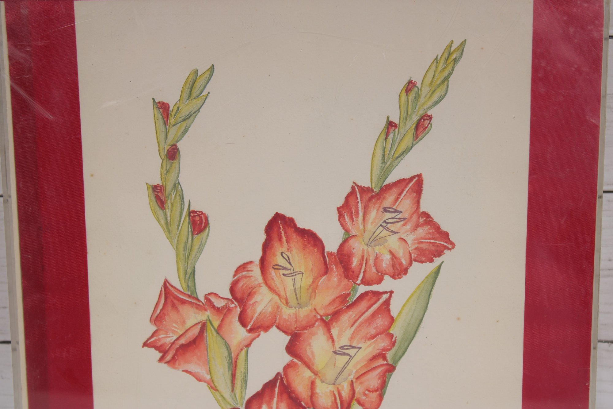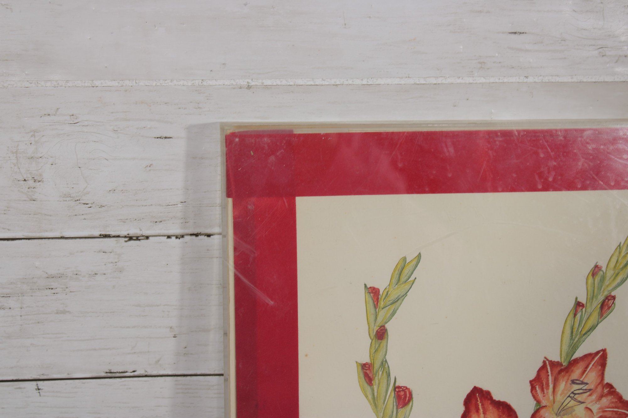 The artwork appears to be signed near the lower portion (see photos), adding a touch of uniqueness. It is presented with a bold red mat that complements the flower tones and is enclosed in a clear-front frame, giving it a clean, modern display style.