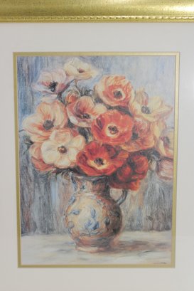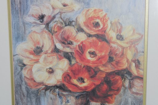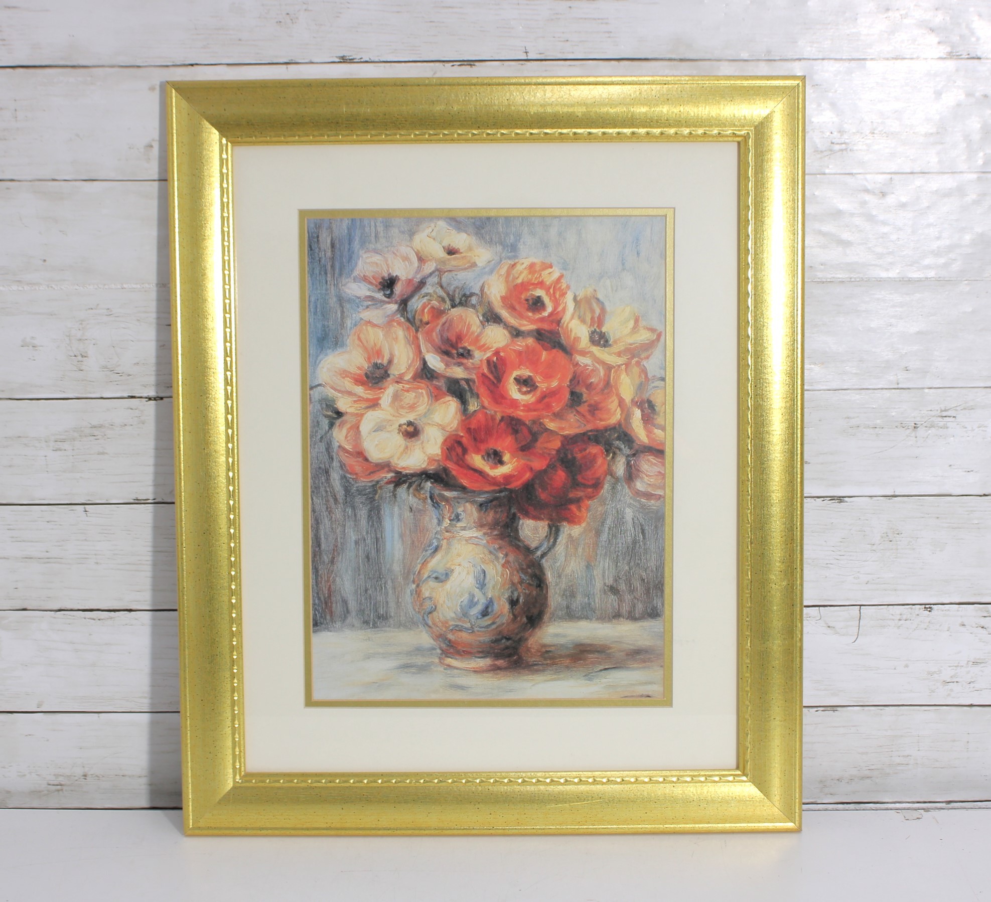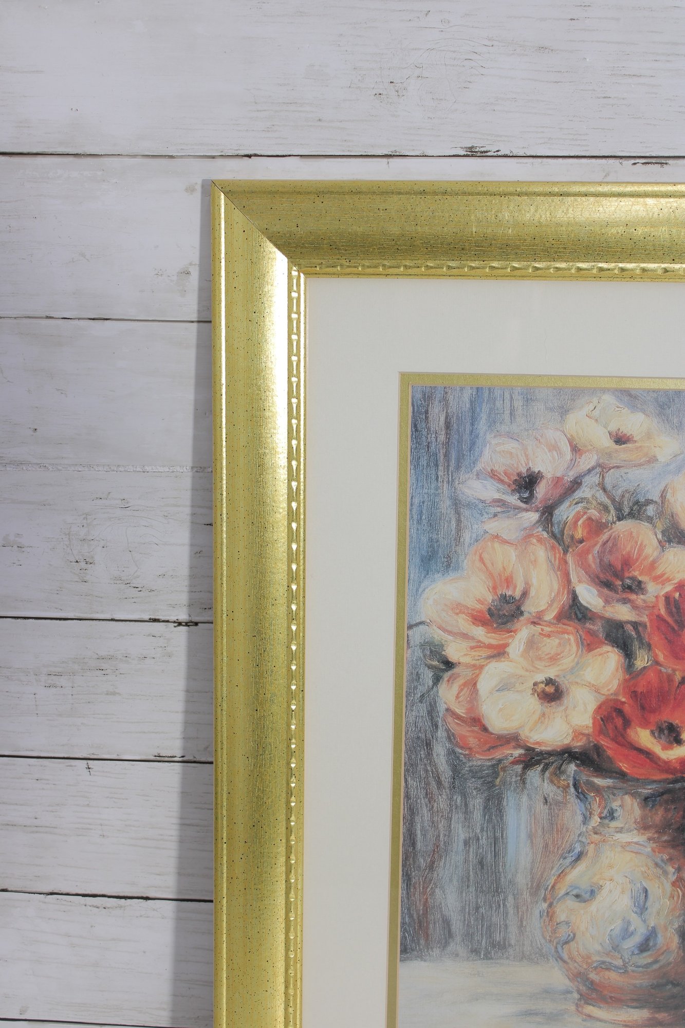 Add a warm, timeless touch to your décor with this beautifully framed floral still life print. The artwork features a vibrant bouquet of poppies in soft creams, blush tones, and rich reds, arranged in a decorative vase against a muted, painterly background.