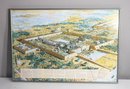 This detailed and colorful historical illustration presents a reconstruction of an ancient Egyptian temple complex, offering a fascinating glimpse into architecture, daily life, and landscapes of ancient Egypt. The artwork is signed by the artist and features descriptive text in French, providing historical context.