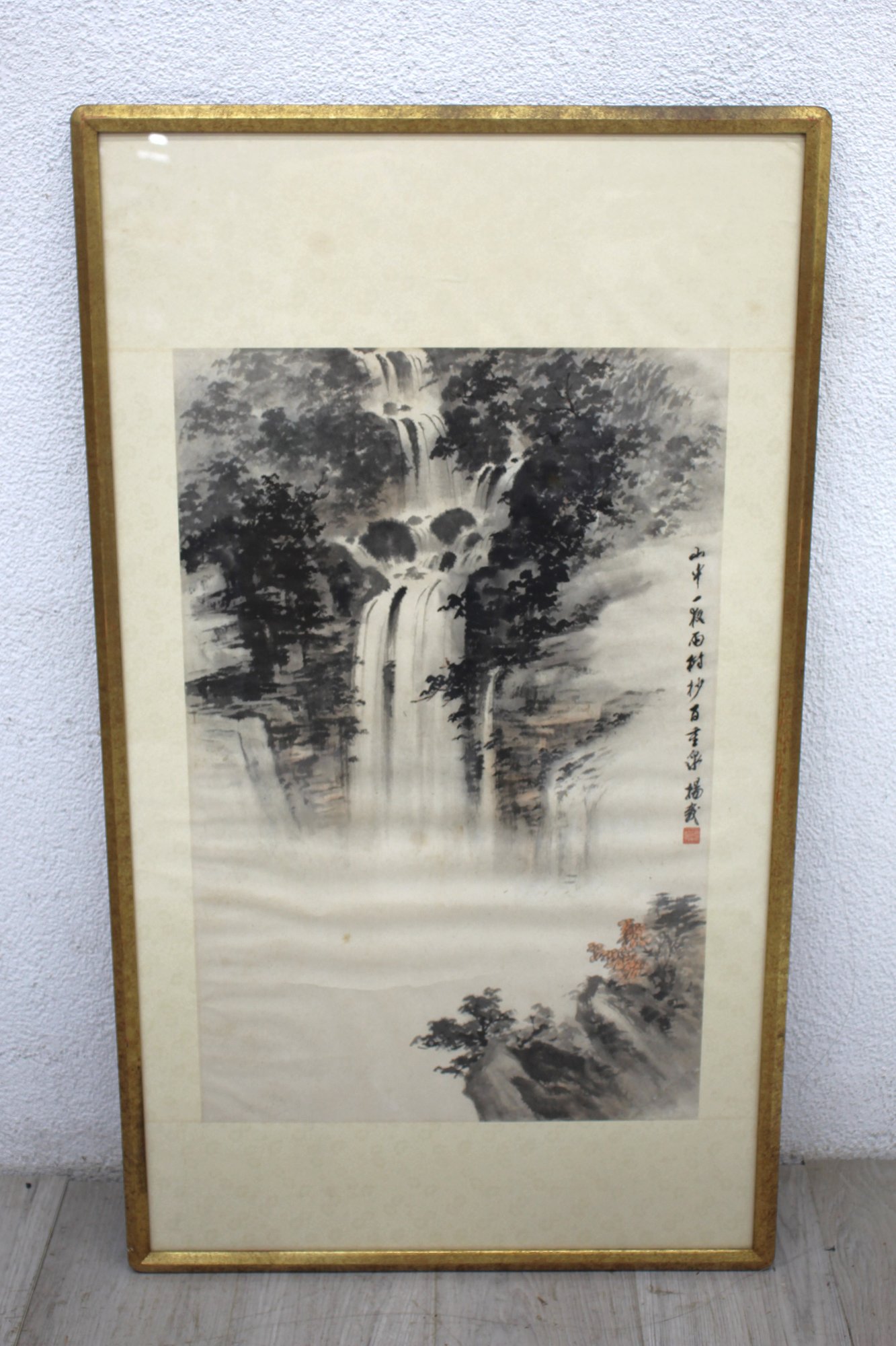 A serene and captivating framed Japanese ink wash painting featuring a stunning waterfall cascading down through lush forested cliffs. The masterful brushwork brings the natural scene to life with a harmonious balance of light and dark, revealing subtle details of the foliage and rocky landscape. The vertical inscription on the right side and artist's seal add an authentic cultural touch to the artwork. The painting is framed in a simple gold-colored frame,