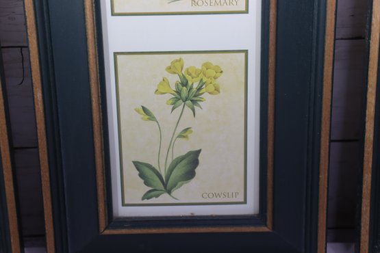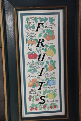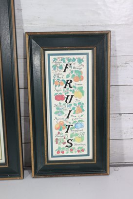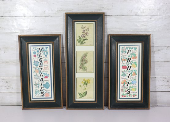 The two outer prints feature vertical word art spelling “Vegetables” and “Fruits,” surrounded by illustrated produce. The center frame contains three stacked botanical illustrations, creating a balanced and visually pleasing trio when displayed together.