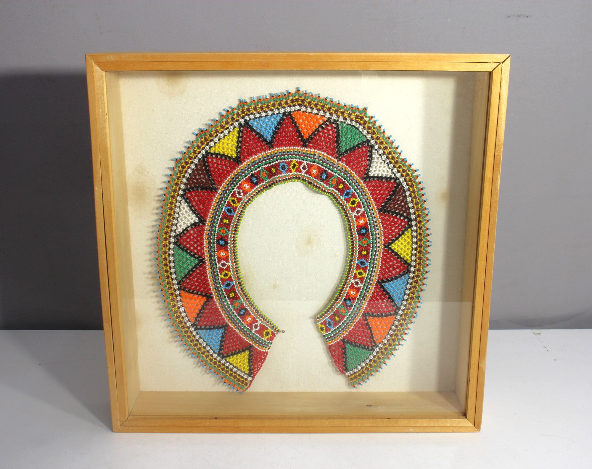 The necklace is securely mounted within a natural wood frame with glass, making it a striking wall décor item for collectors of tribal art, global textiles, or unique cultural artifacts.