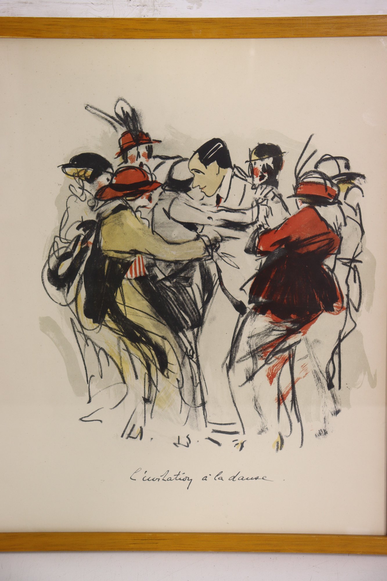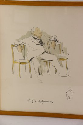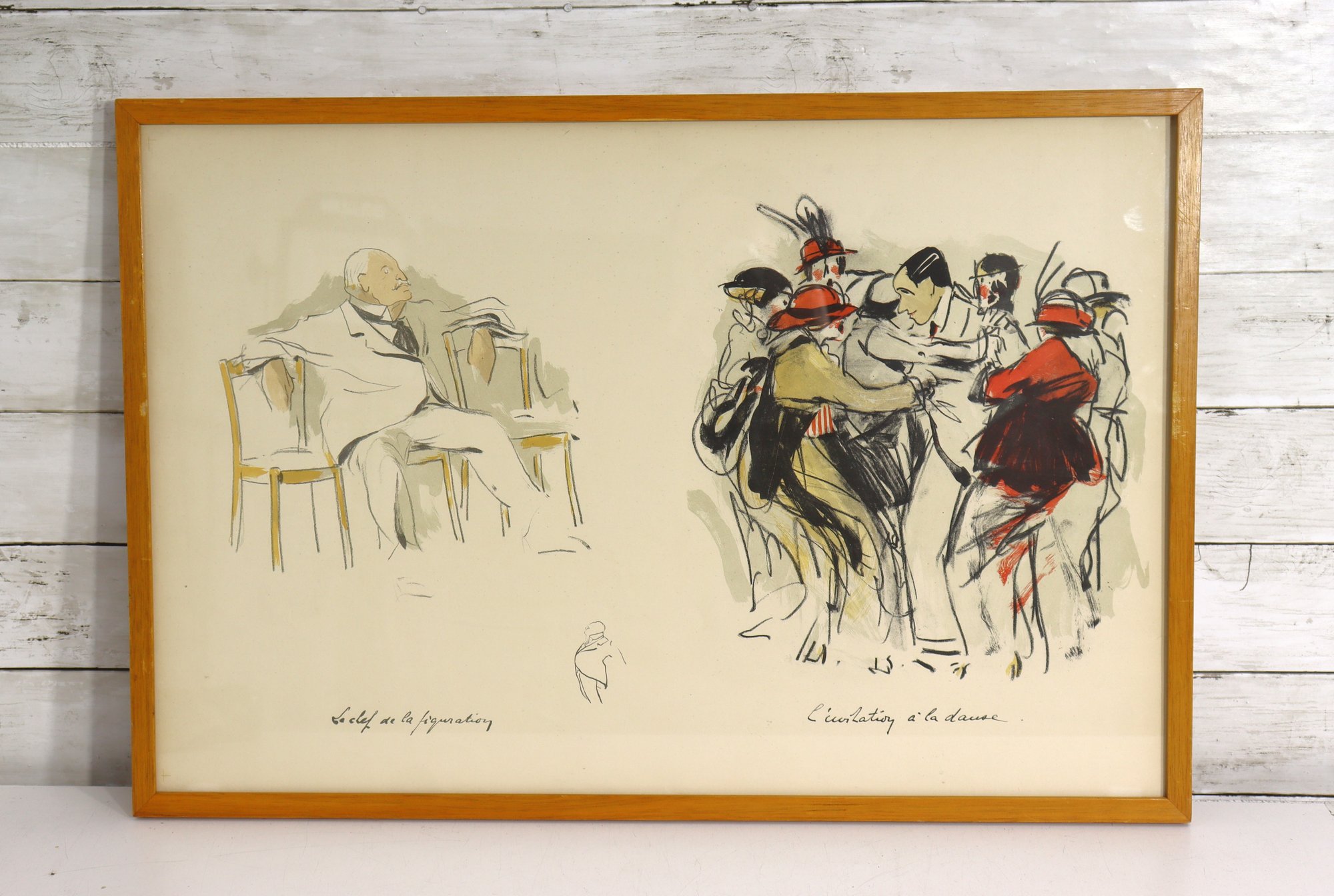 Whimsical and expressive mid-century art print featuring two charming scenes titled “Asleep at the Symphony” and “Socializing at the Dance.” Rendered in a lively sketch style with watercolor-like color accents, these illustrations capture both humor and elegance in everyday social life.