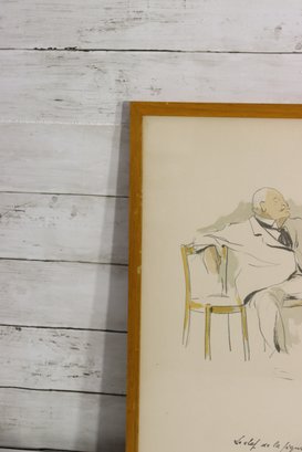 The piece is framed under glass in a simple natural wood frame with the original paper backing and hanging wire. This print adds a touch of vintage charm and sophistication, ideal for mid-century or eclectic interiors.