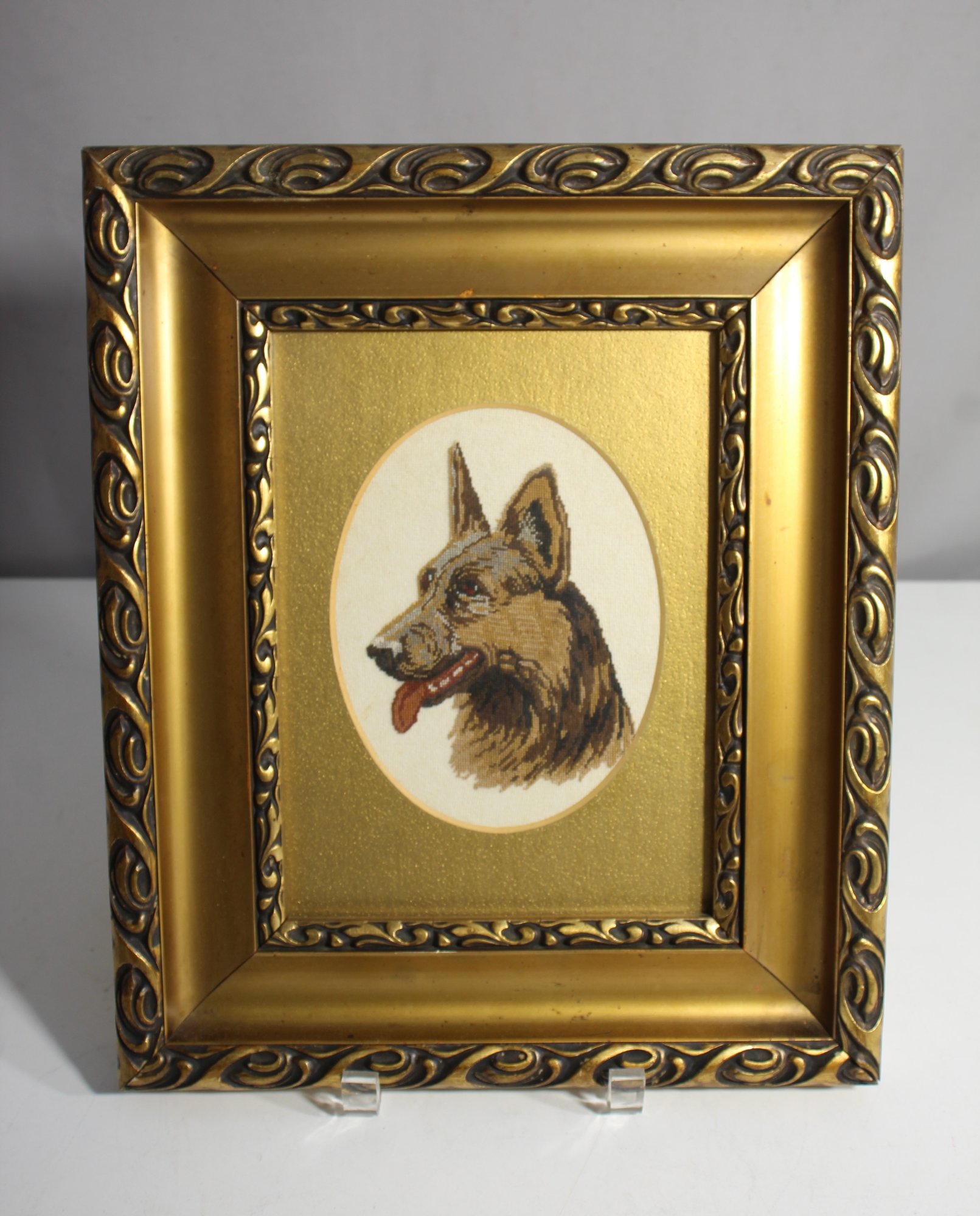 A beautifully framed needlepoint featuring a detailed depiction of a German Shepherd. The needlework is set in an ornate golden frame with intricate scrolling details on the corners, accentuating the craftsmanship of both the frame and the artwork. Perfect for dog lovers or as a decorative piece in any home. The artwork captures the likeness of the German Shepherd with impressive attention to detail.