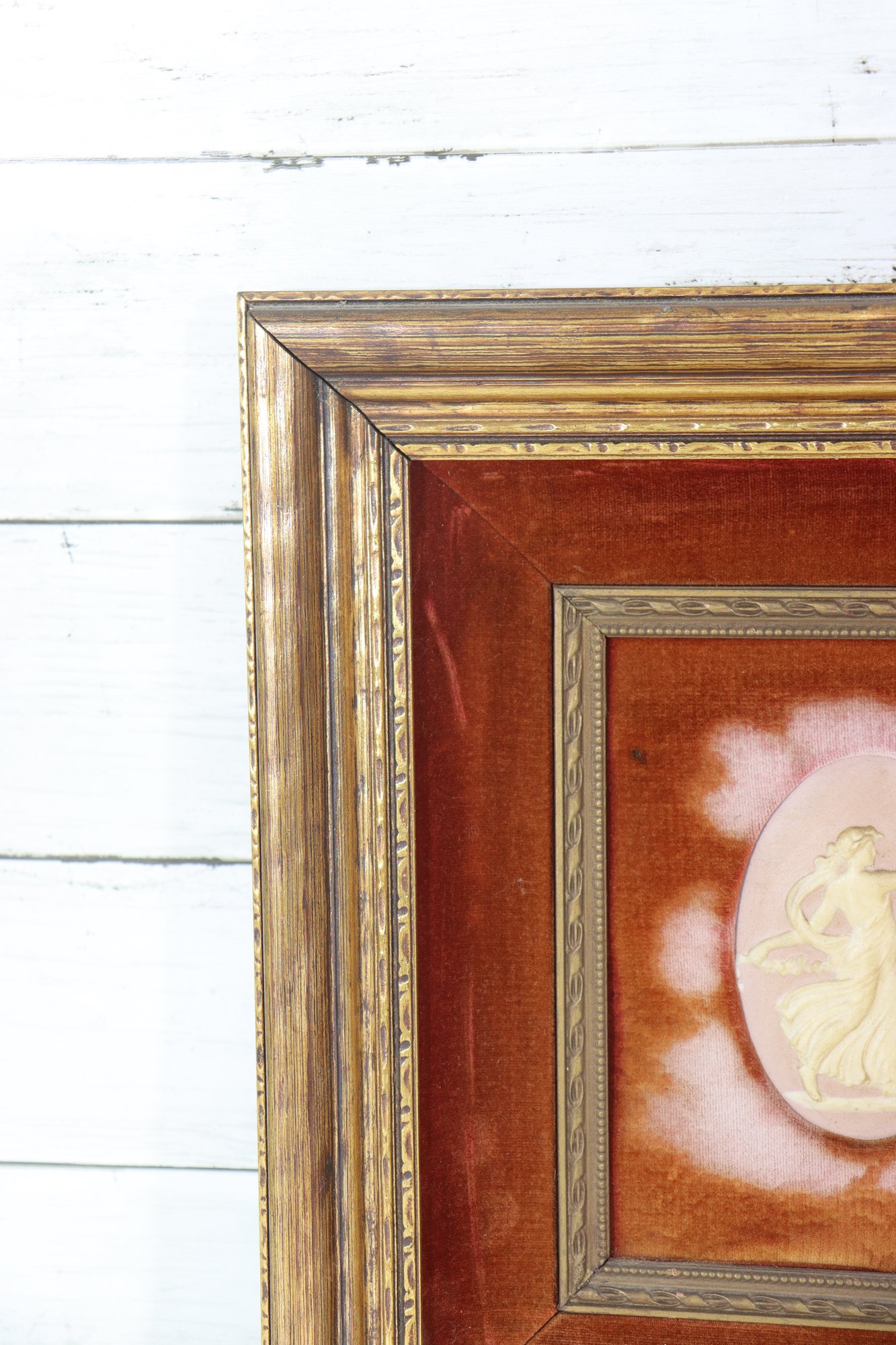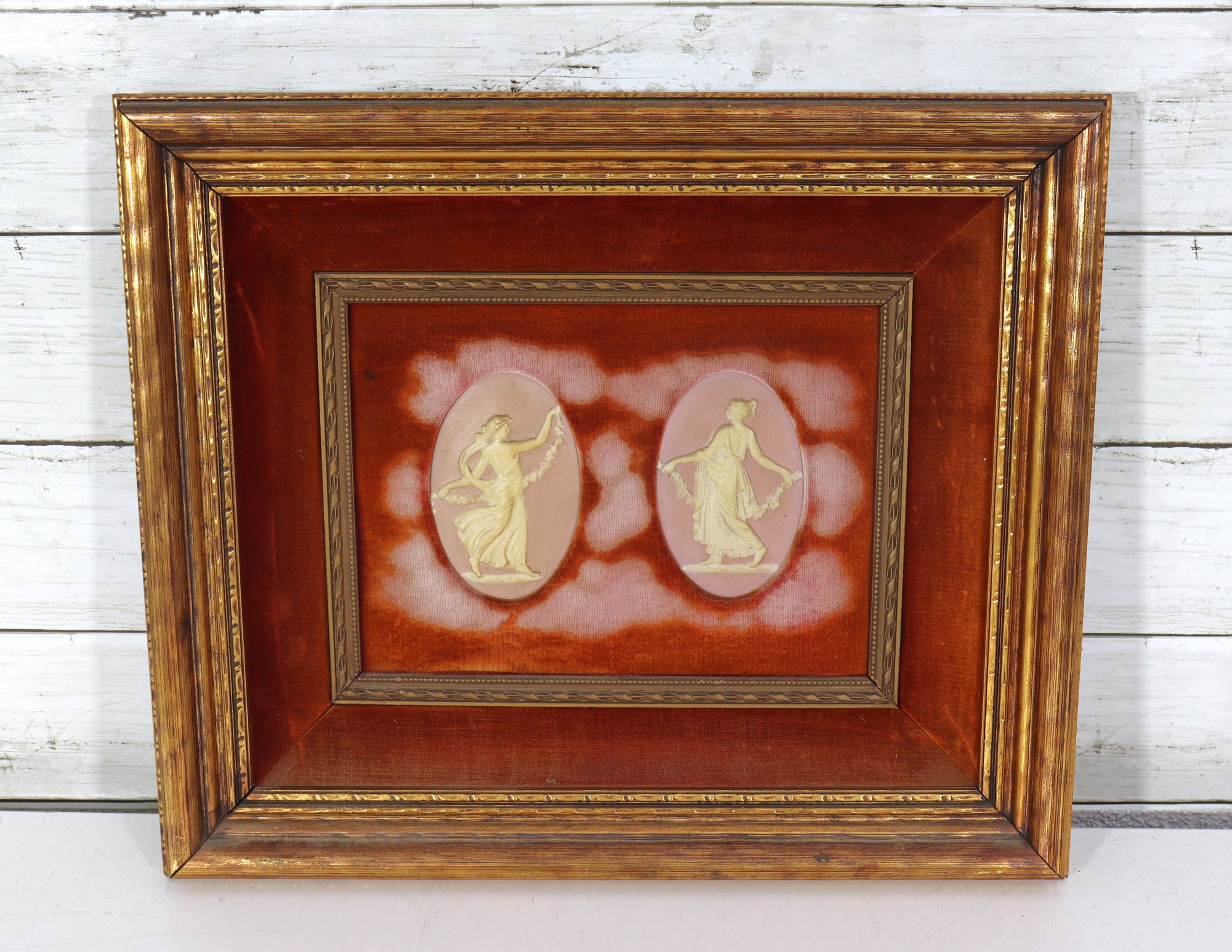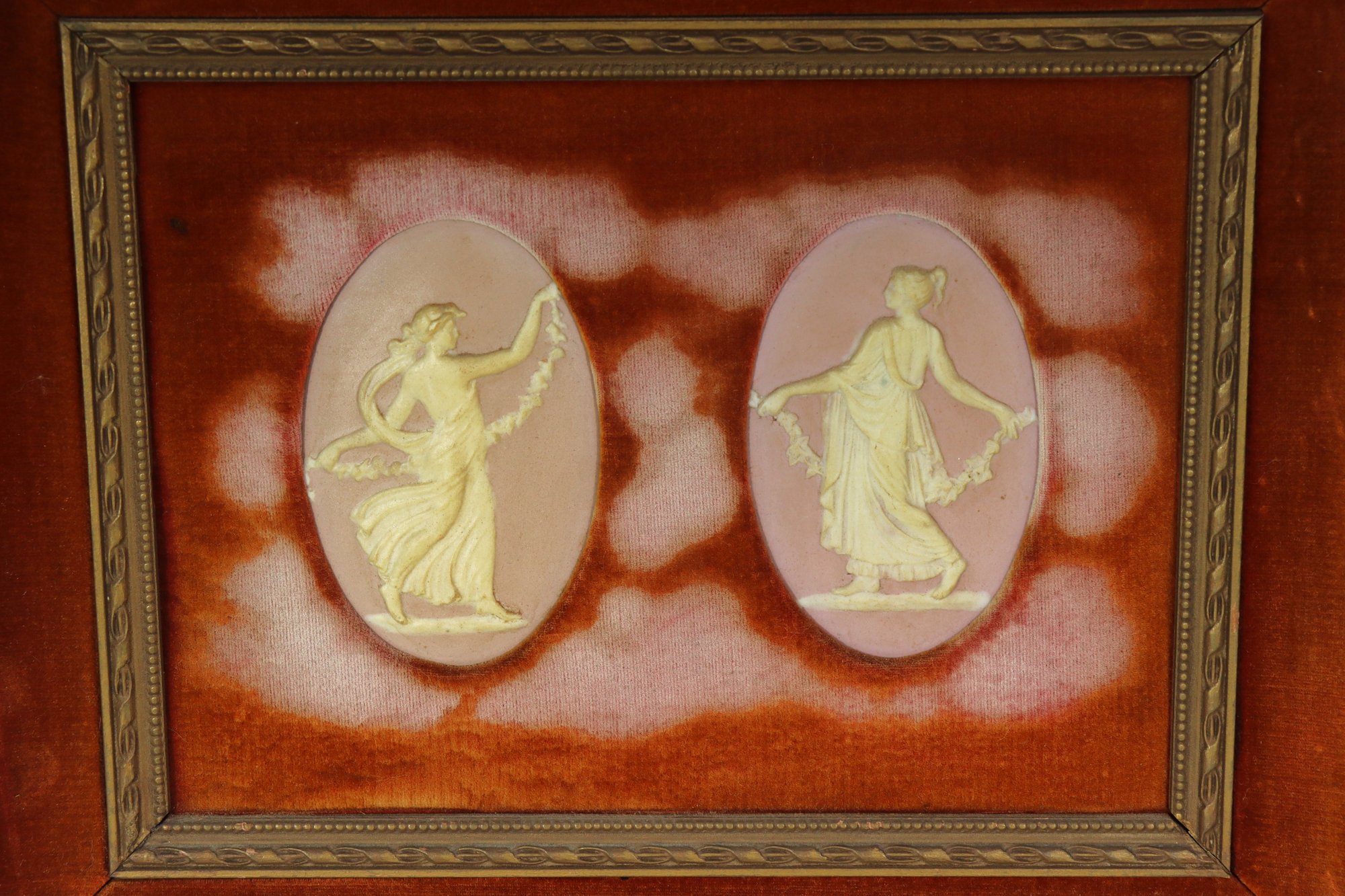 framed decorative artwork featuring two neoclassical-style relief cameos, each depicting a graceful classical figure in flowing drapery. The figures are set within oval reserves against a rich rust-colored ground with soft cloud-like shading, creating depth and visual contrast.