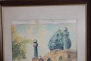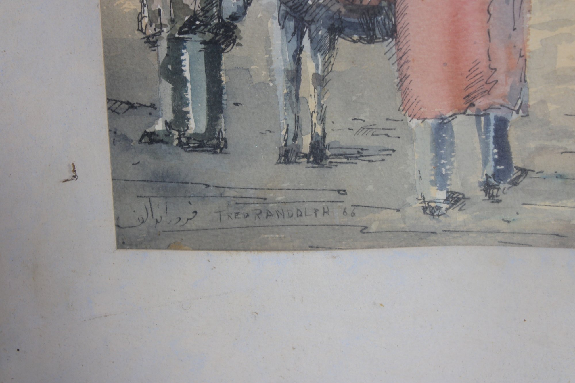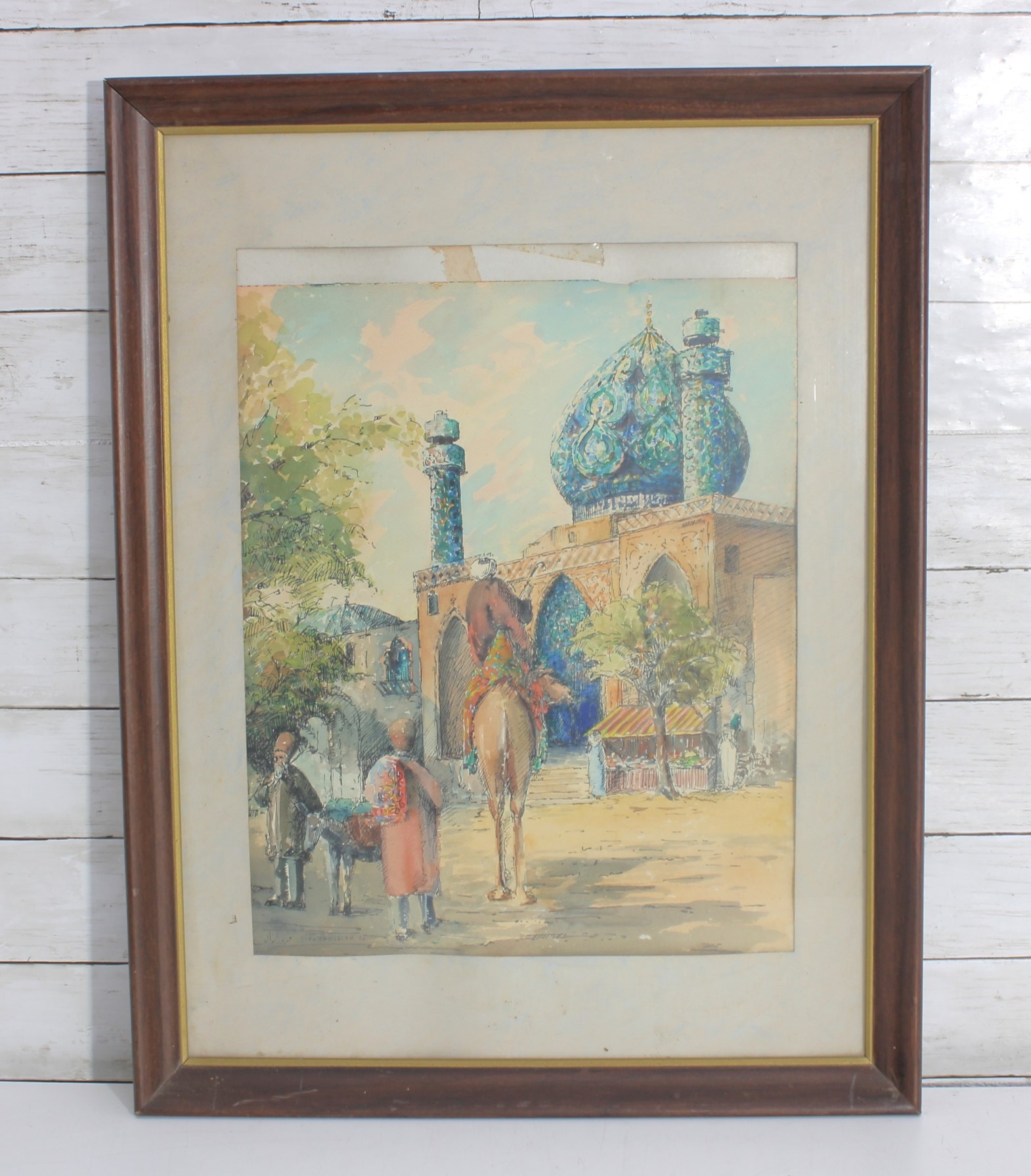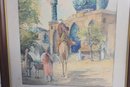 The artwork captures a lively Middle Eastern marketplace setting, featuring architectural details, arched entryways, and richly colored domes. In the foreground, figures dressed in traditional garments stand beside a camel, creating a sense of depth and cultural atmosphere. The piece is signed in the lower margin (please see close-up photos for signature detail).