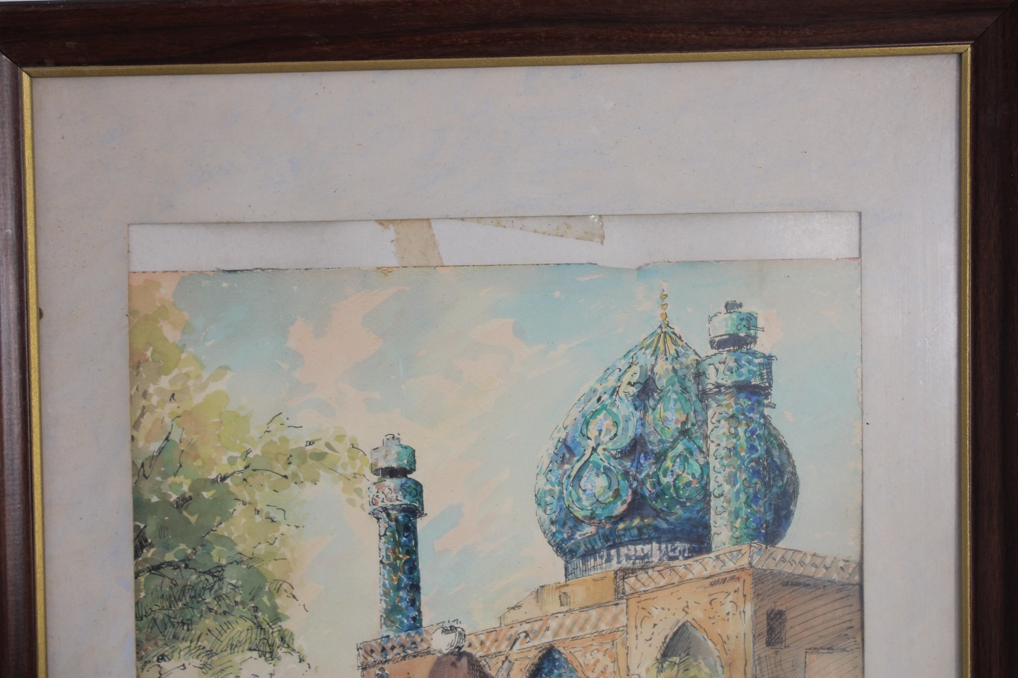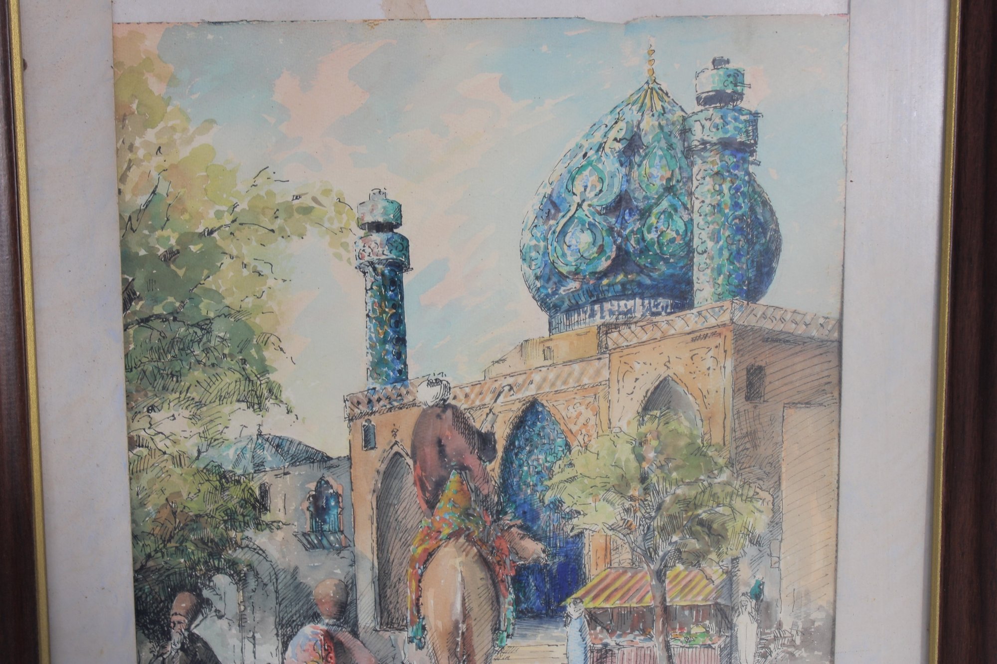 framed Orientalist-style art print depicting a vibrant street scene with figures, a camel, and a striking blue-domed mosque in the background.