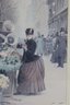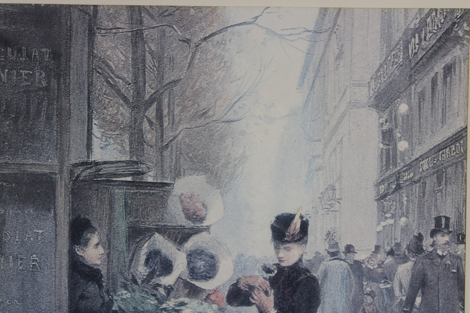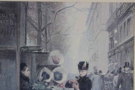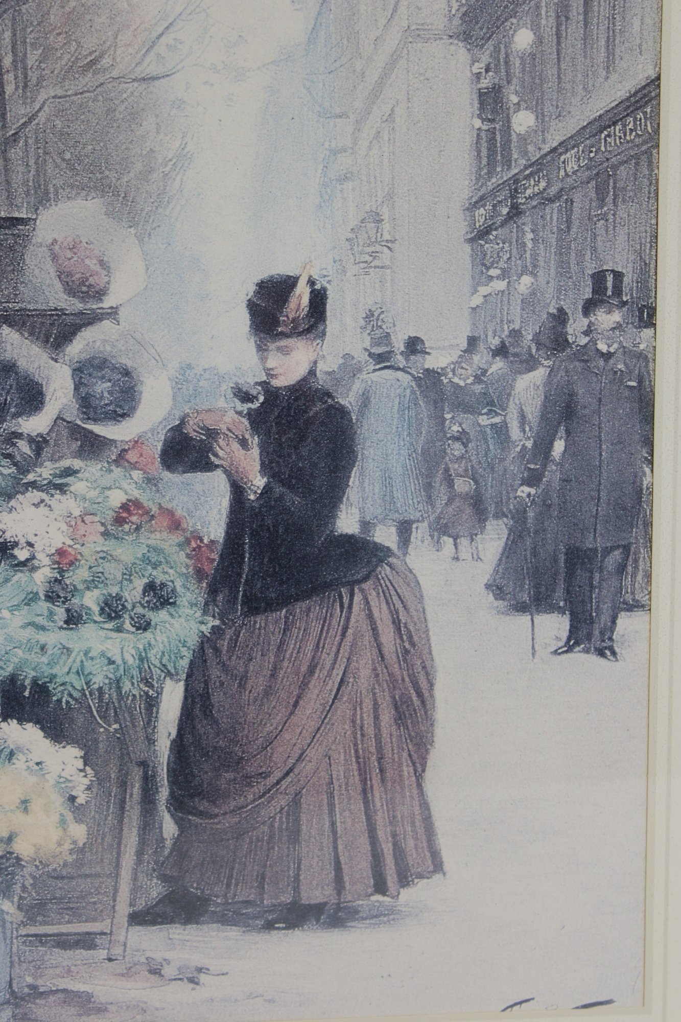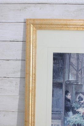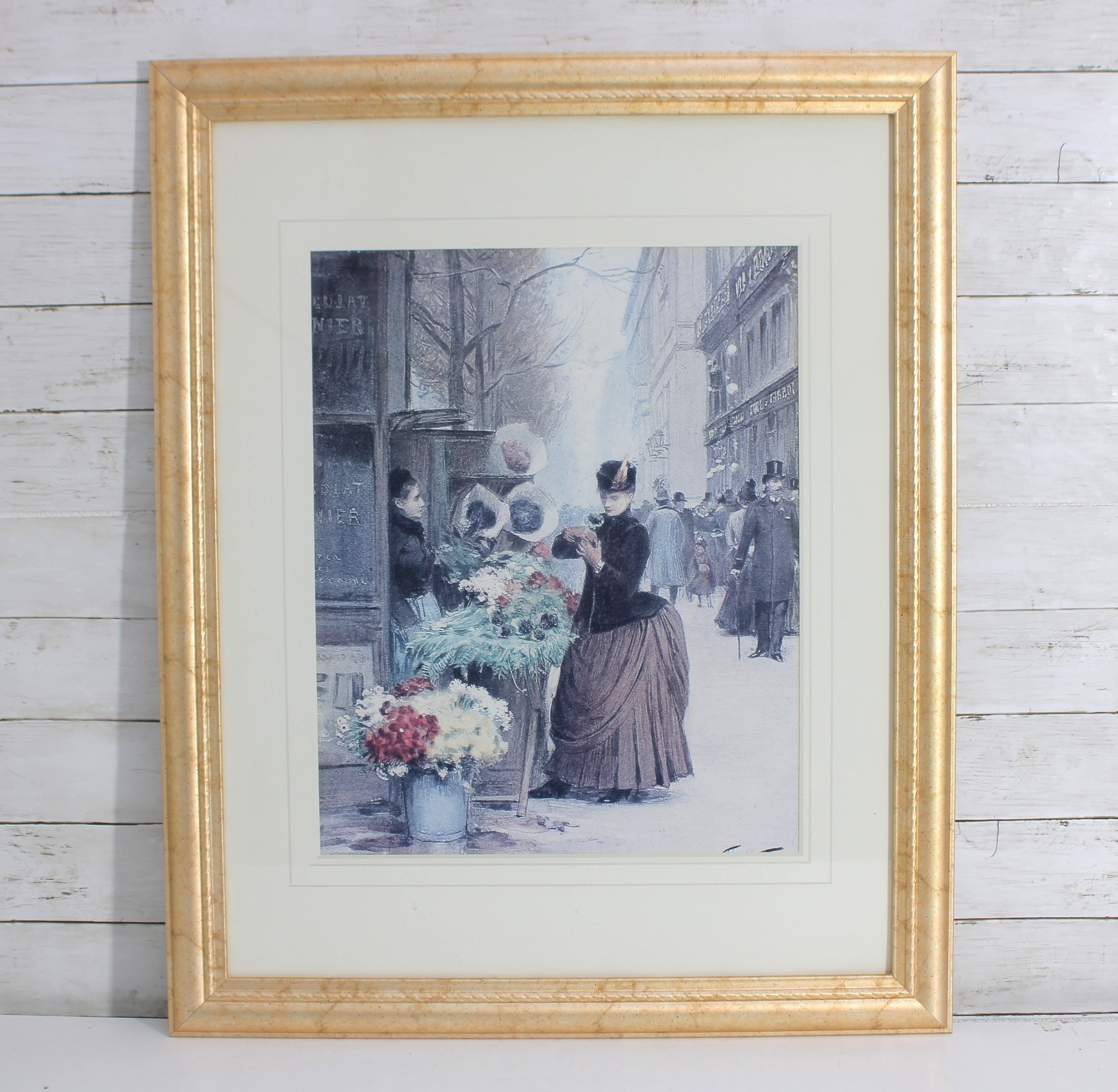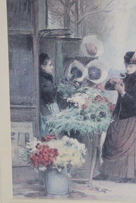 framed art print captures a charming Parisian street scene centered around a bustling flower market. Set along a city sidewalk, finely dressed figures pause among buckets of blooms while pedestrians stroll past in the background. The soft, muted palette and delicate detail evoke the romance and everyday beauty of turn-of-the-century Paris.