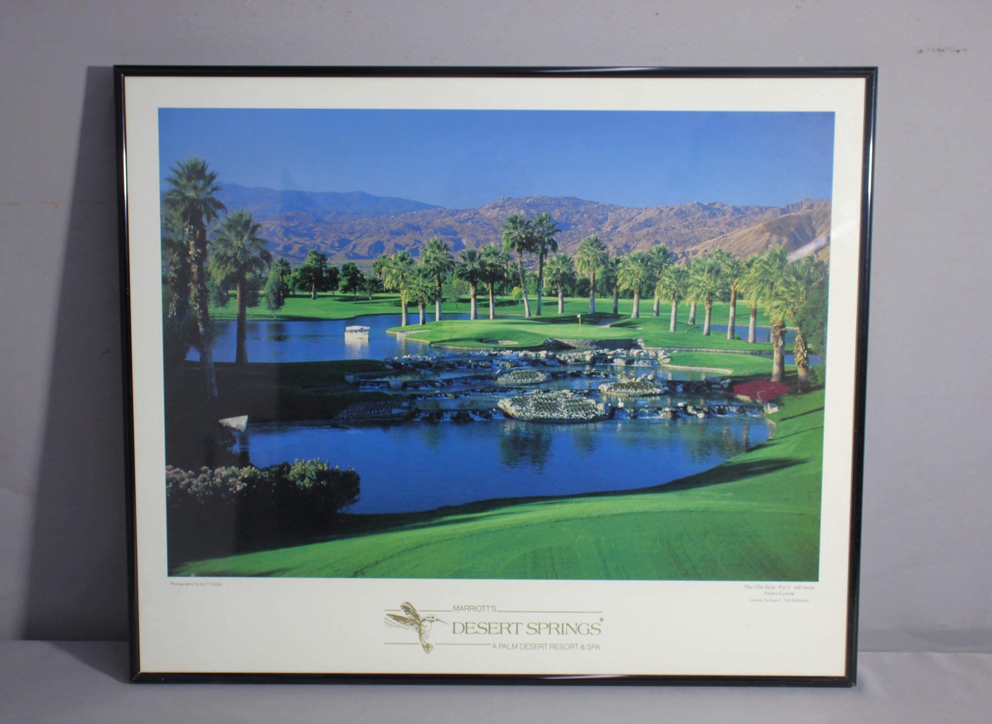 The print features lush green fairways, strategically placed bunkers, and the iconic palm trees that dot the course, all framed by the rugged mountains that define the Palm Springs skyline. The vibrant colors and meticulous detail of the print transport viewers to the heart of the action, evoking the excitement and camaraderie of a day on the links.