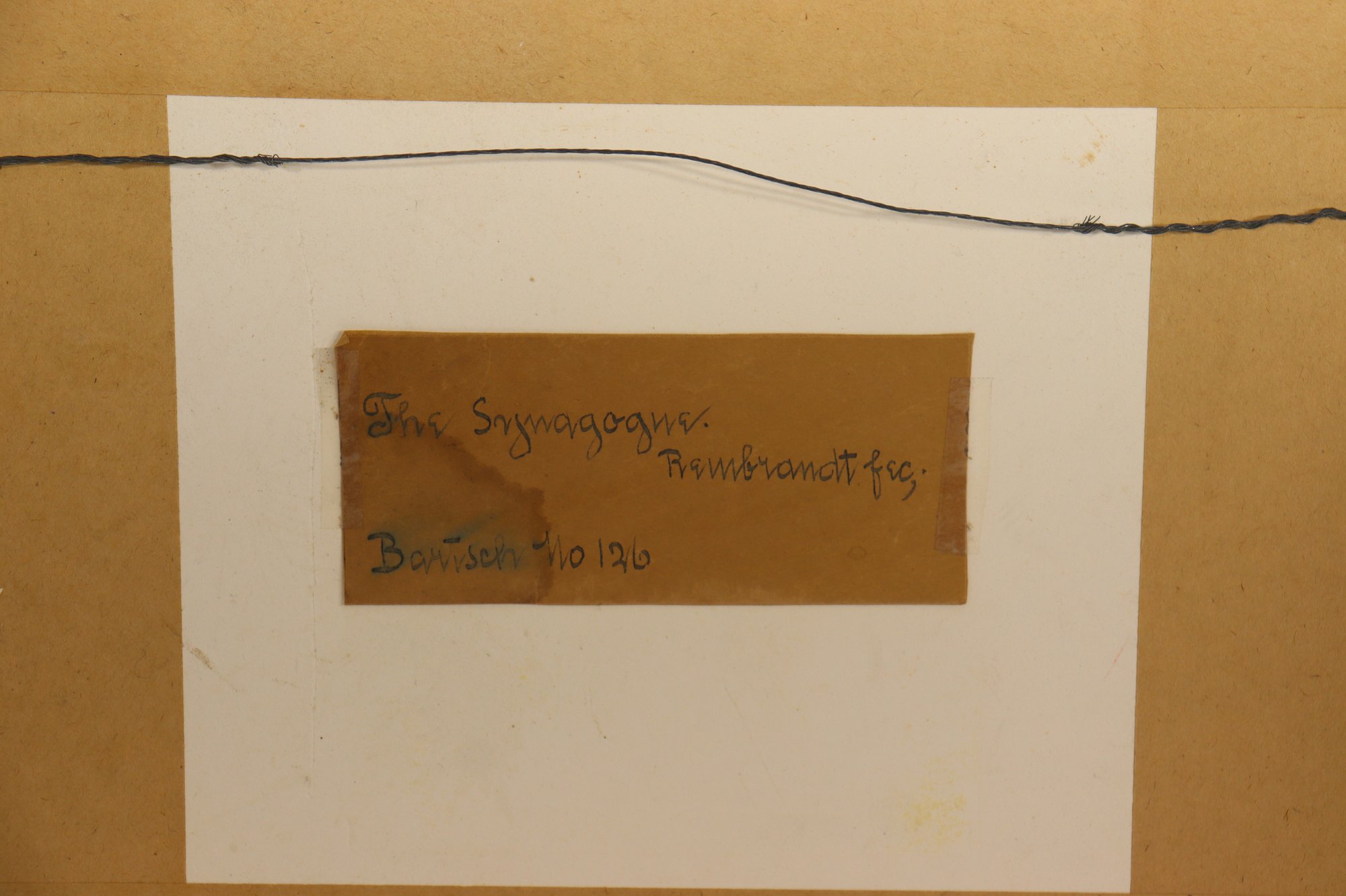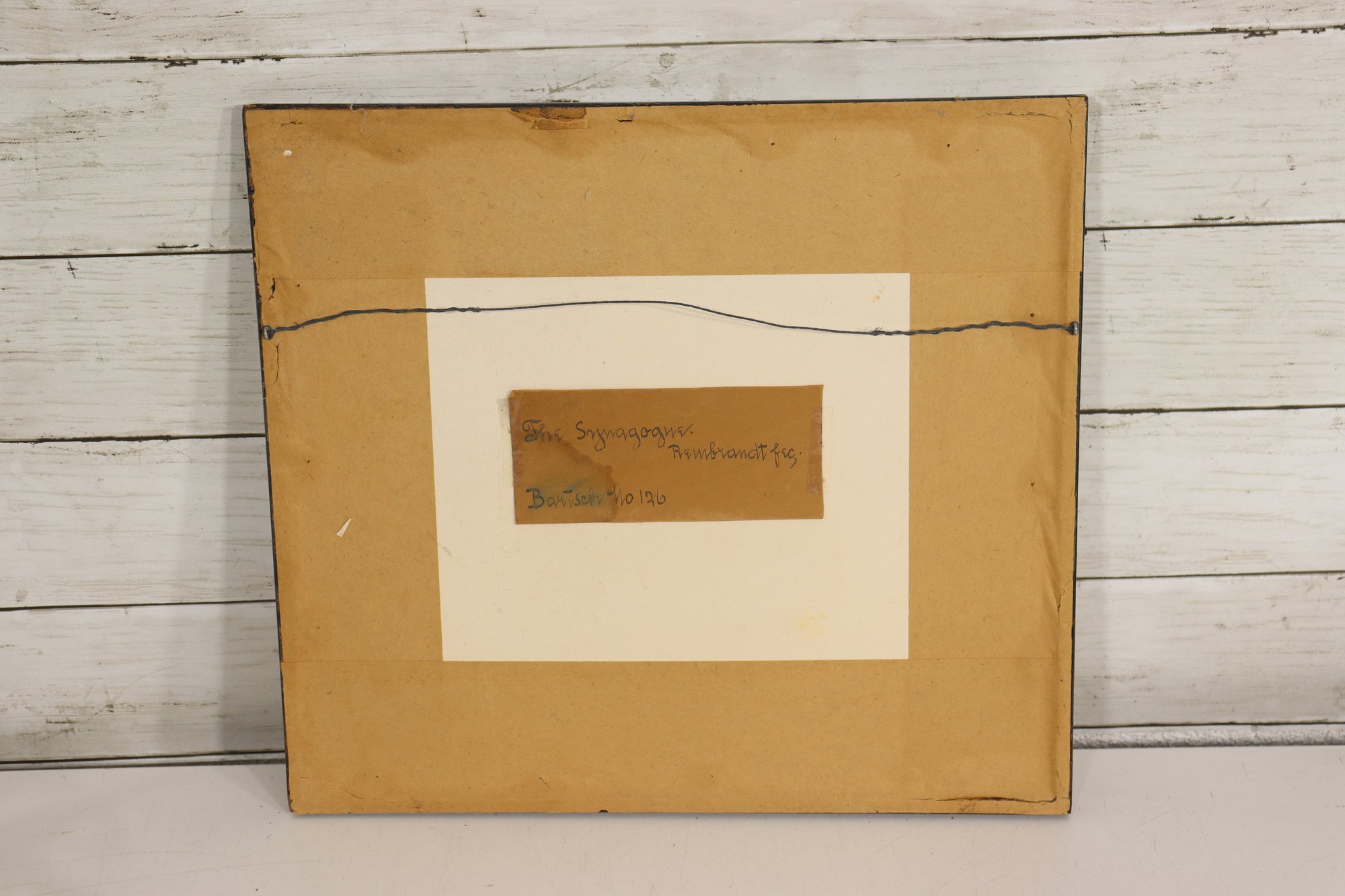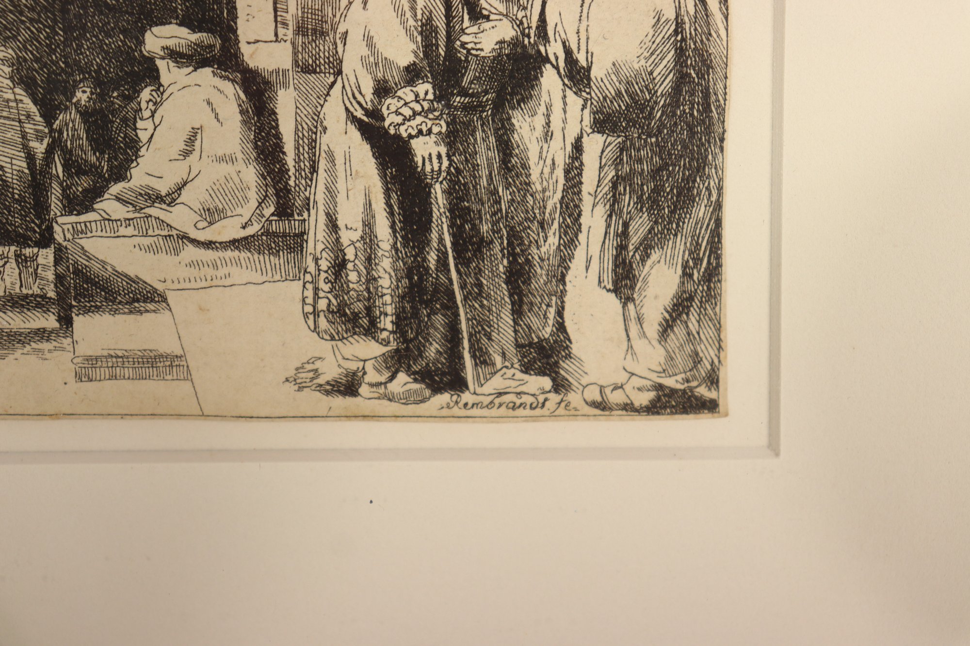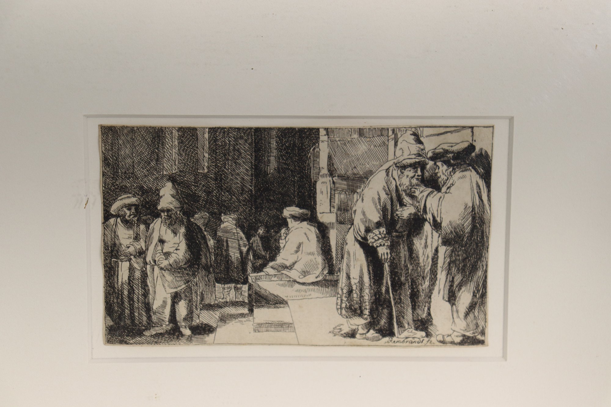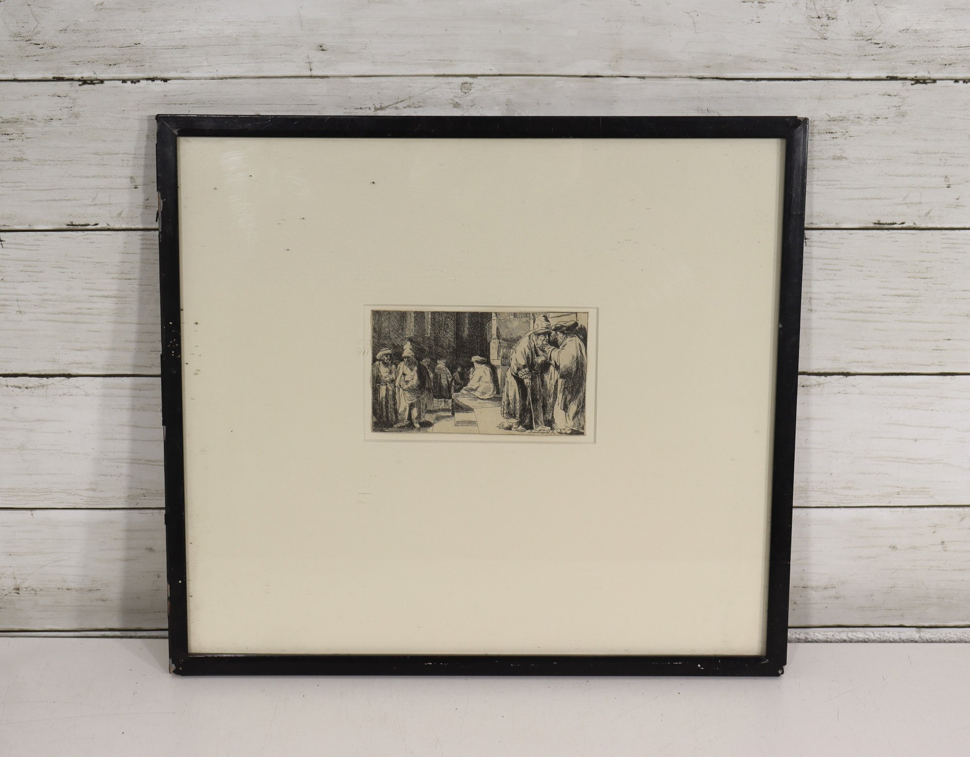 Framed print after Rembrandt, depicting the scene commonly known as “The Synagogue.” The image shows a detailed interior genre scene with figures gathered in conversation, rendered in Rembrandt’s characteristic dramatic line work and shadow.
