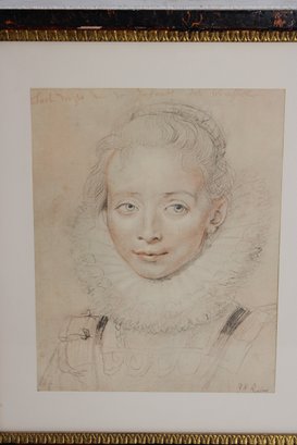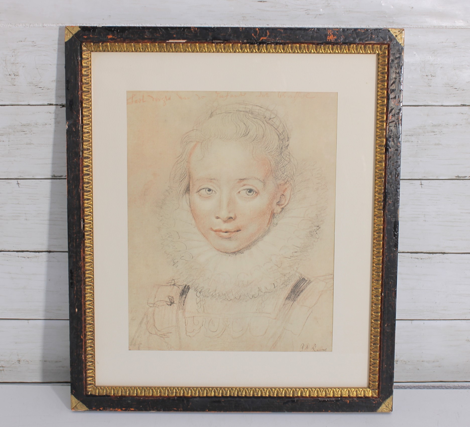 This refined framed art print features a softly rendered Renaissance-style portrait of a young woman adorned with a delicate ruffled collar. The gentle pastel tones and graceful expression evoke the elegance of classical European portraiture, giving the piece a timeless, museum-inspired presence.