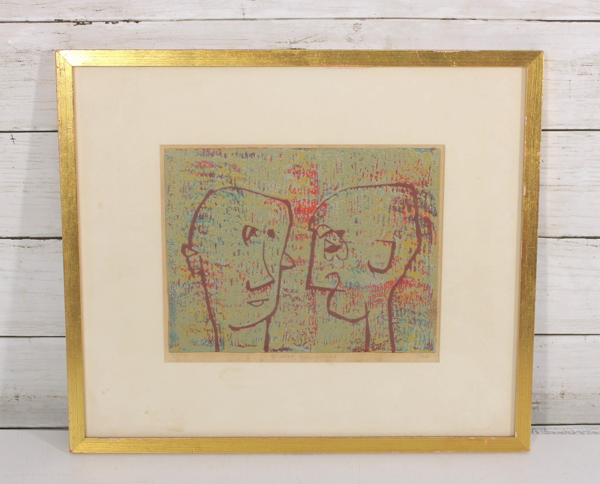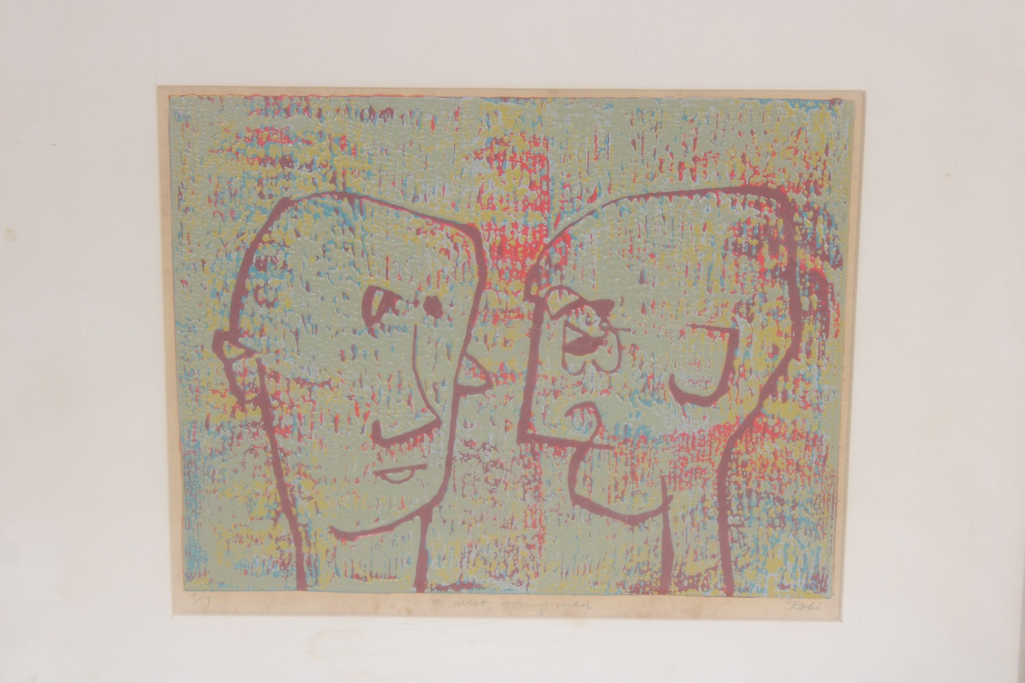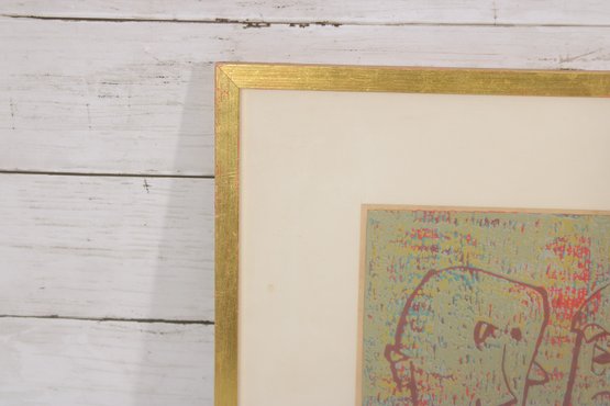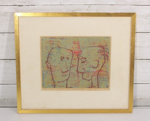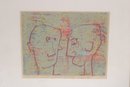 A charming signed and numbered abstract figural print featuring a playful composition of two stylized faces in profile, rendered in a soft, multicolor palette with expressive linework. The artwork has a modern, whimsical feel, with textured color application that adds depth and visual interest.