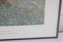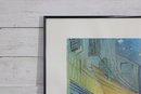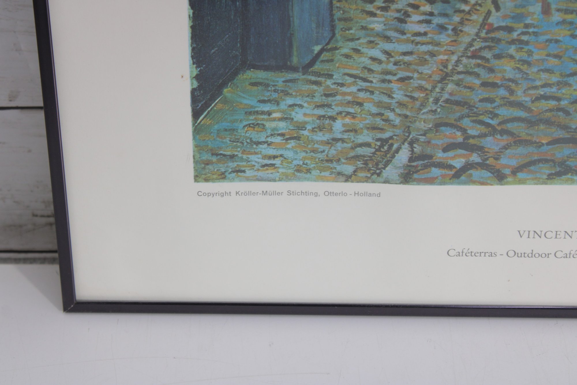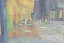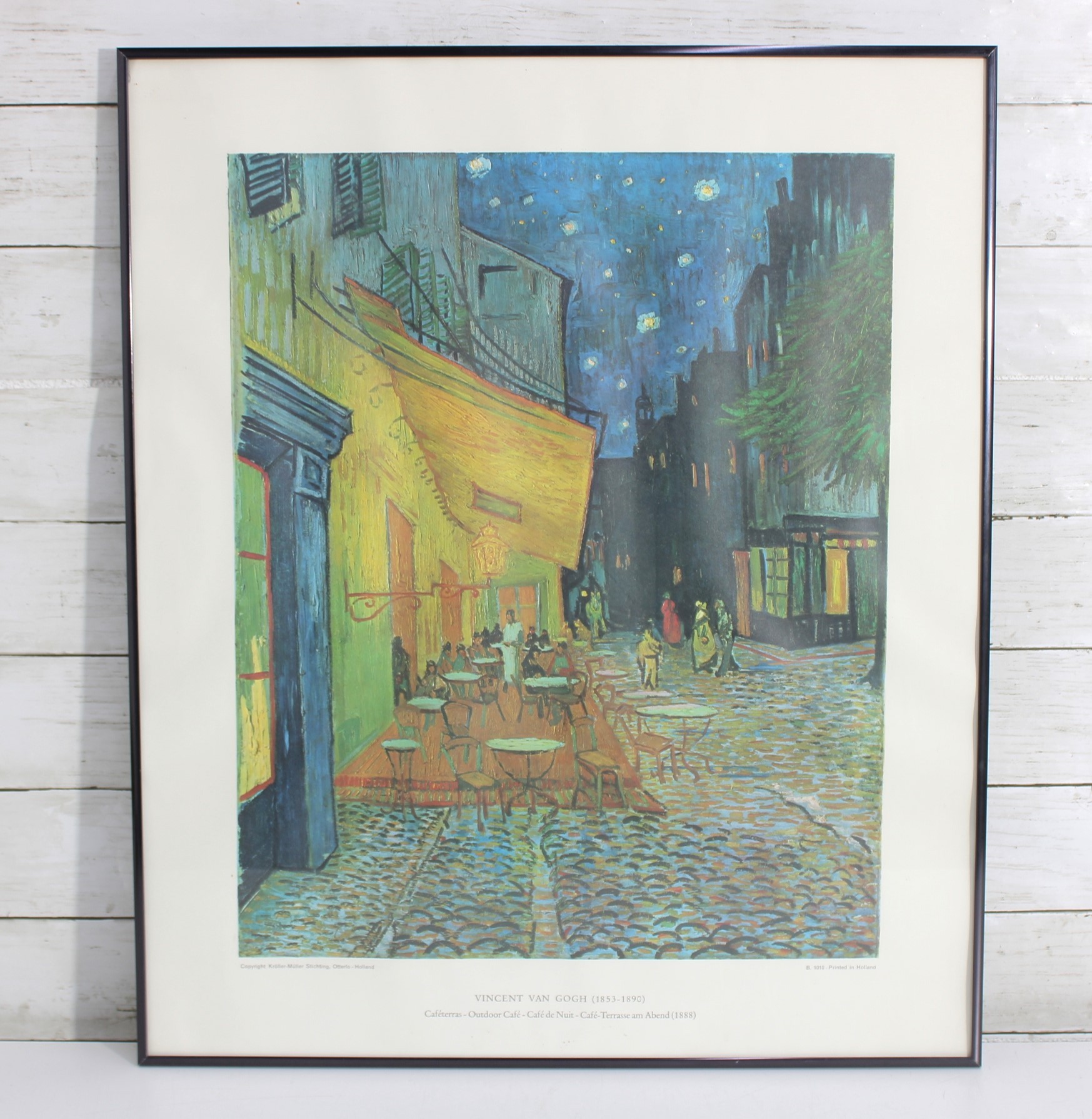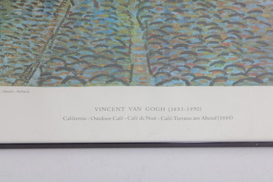 a beautifully framed art print of “Café Terrace at Night” by Vincent Van Gogh (1888), one of the artist’s most beloved and recognizable works. The scene depicts a lively evening café illuminated by warm yellow light beneath a brilliant starry sky along a cobblestone street.