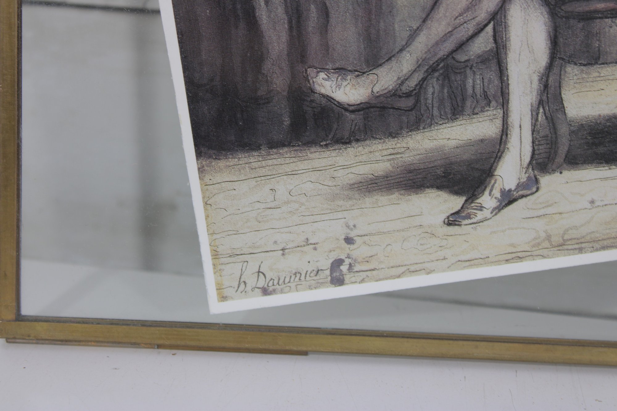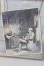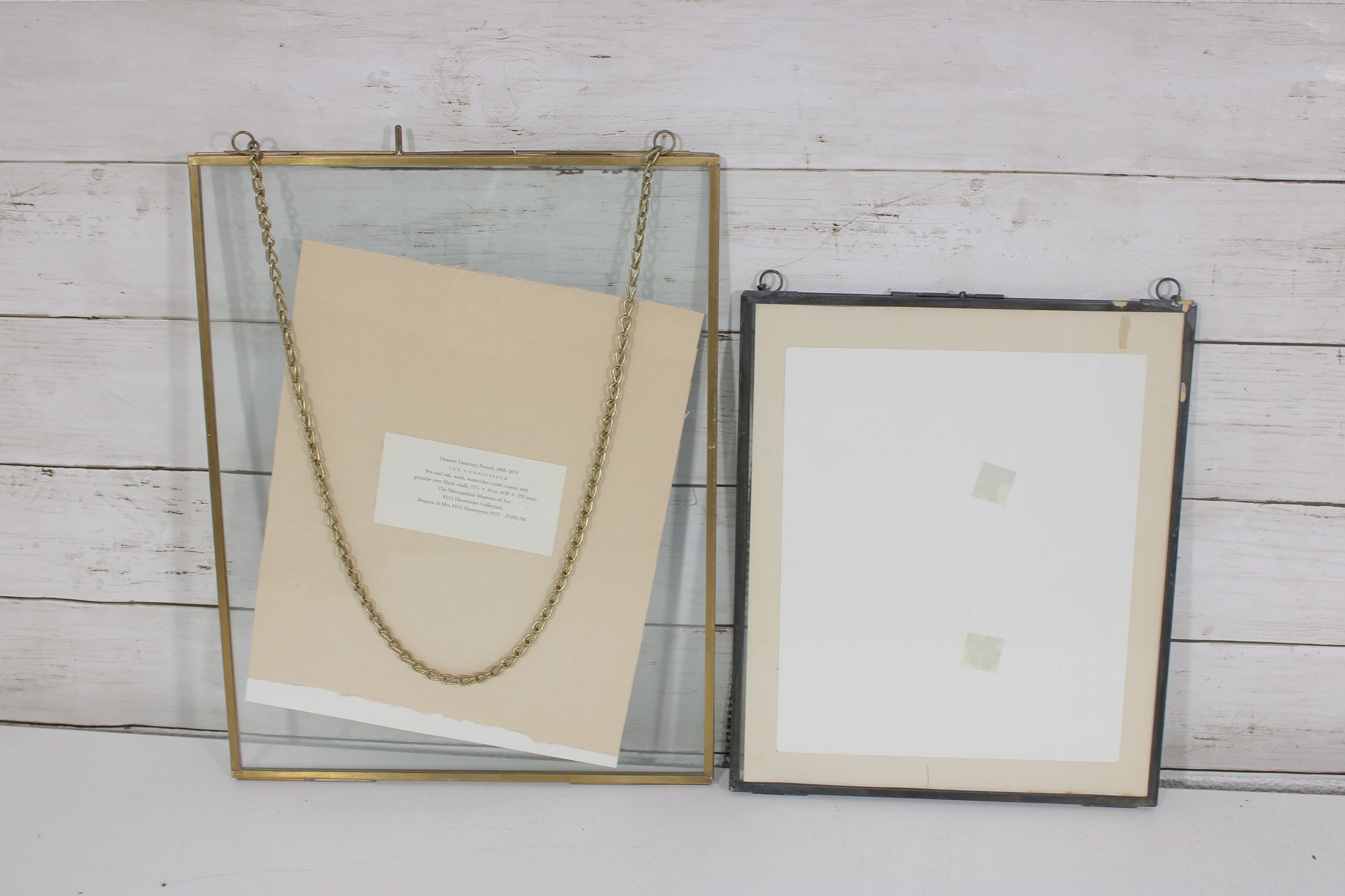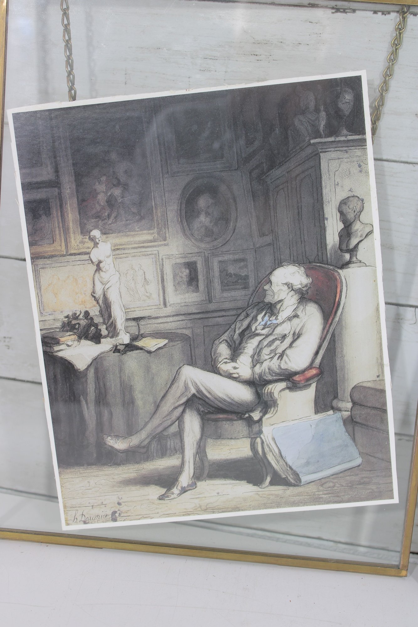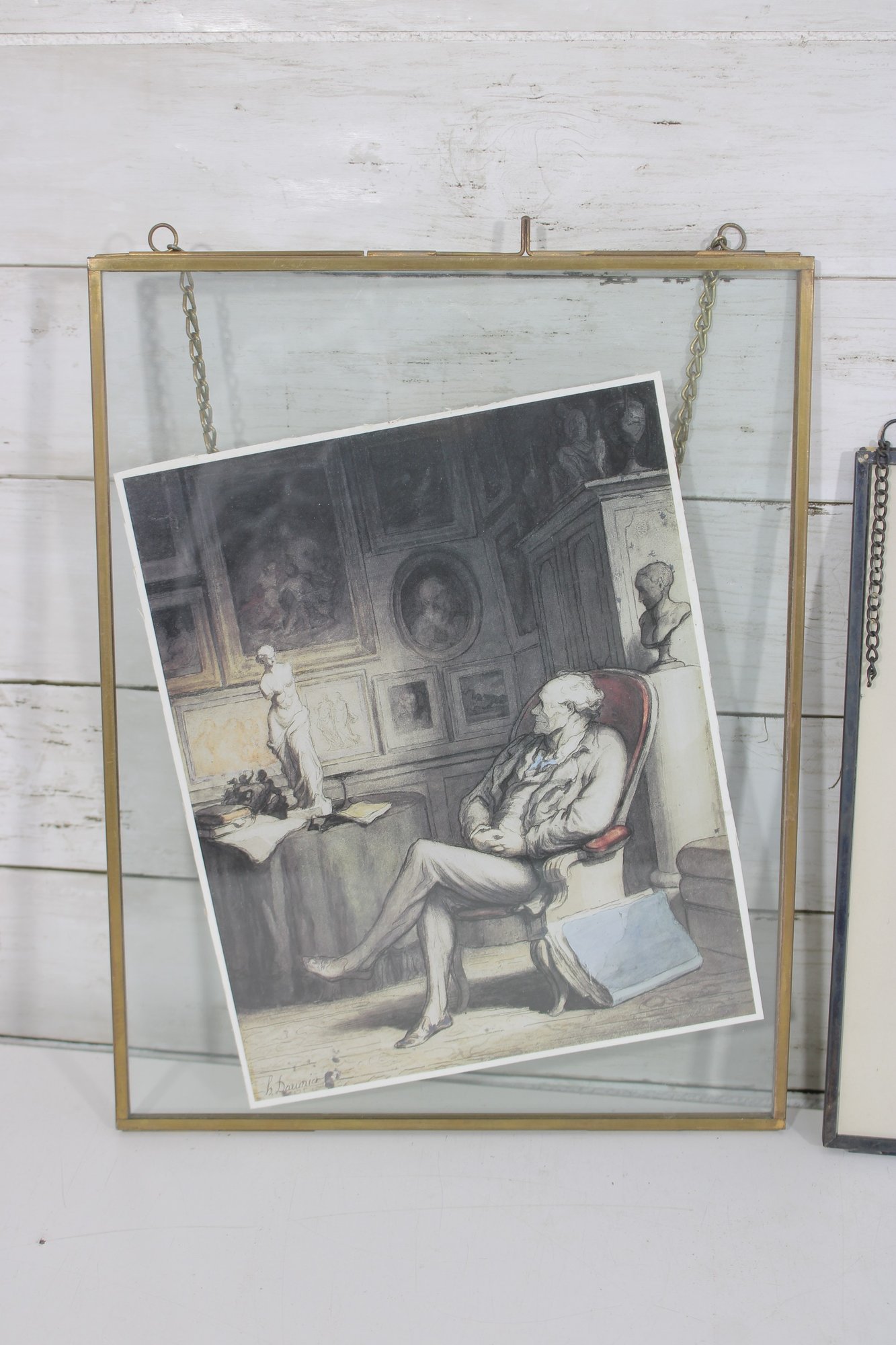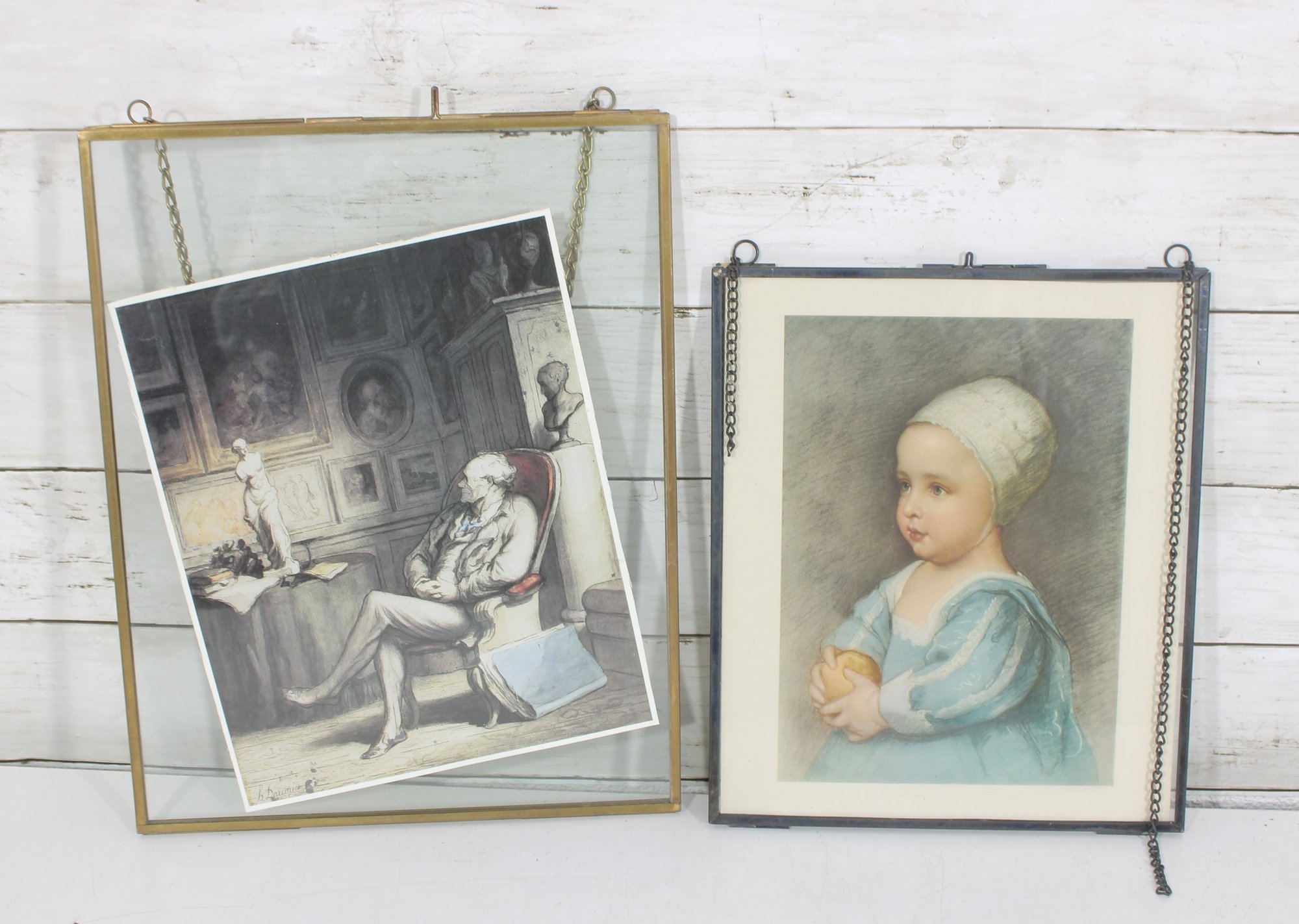 The second piece showcases a monochrome interior scene, depicting a seated figure in a classical setting. This print is displayed in a glass and brass hanging frame, adding a modern vintage touch with clean lines and a floating presentation.