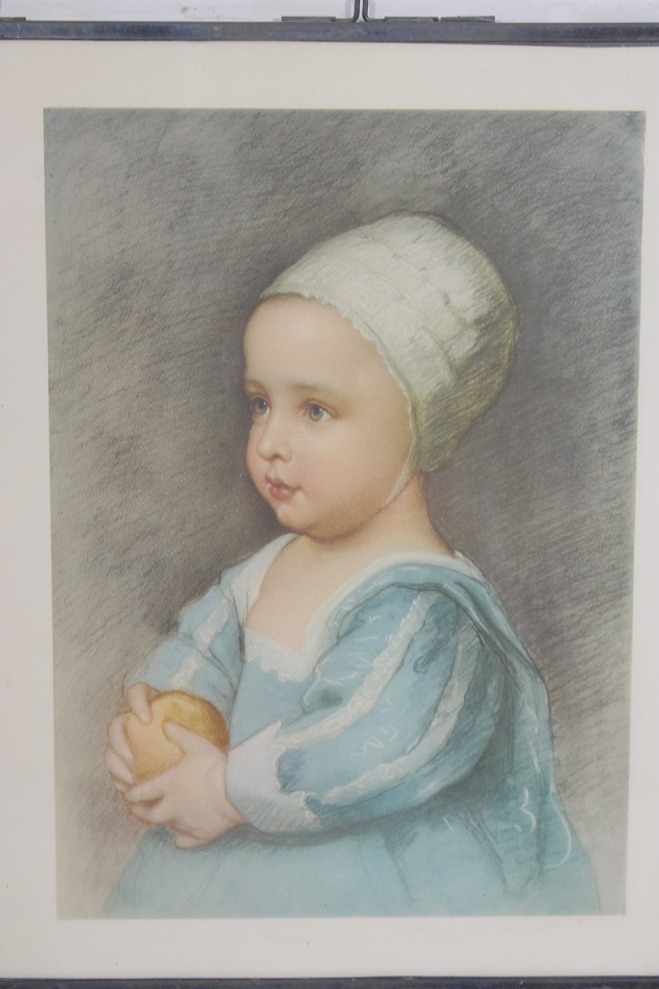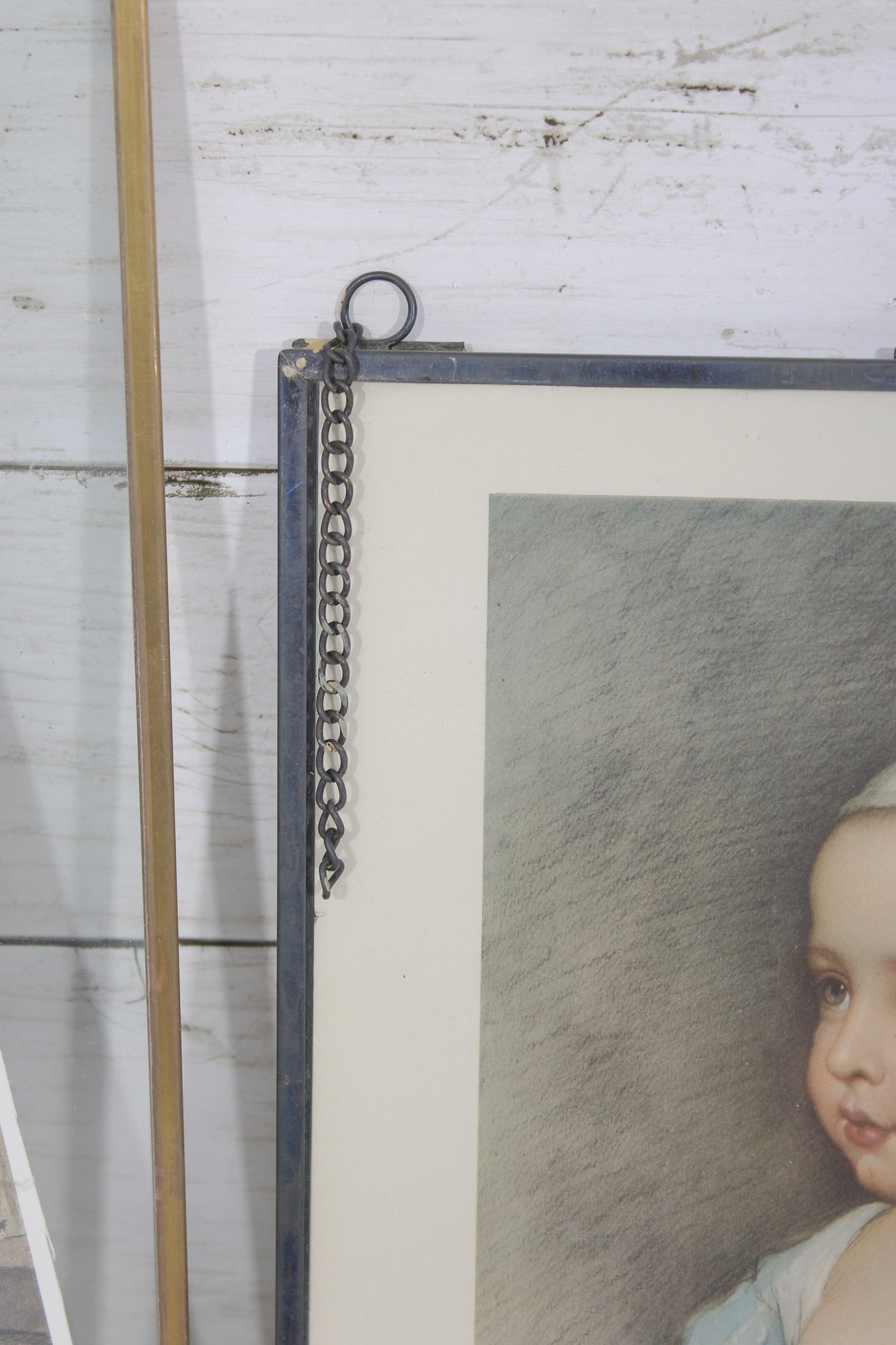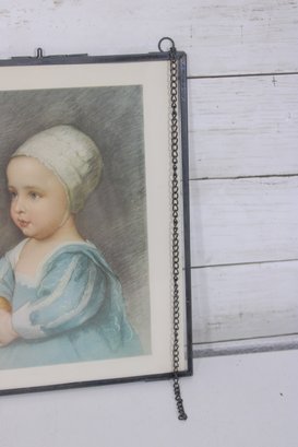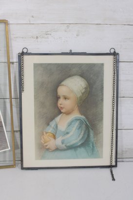 The first piece features a soft, pastel-style portrait of a young child, delicately rendered with gentle tones and fine detail. It is housed in a decorative frame with hanging chain accents, giving it a refined and slightly ornate look.