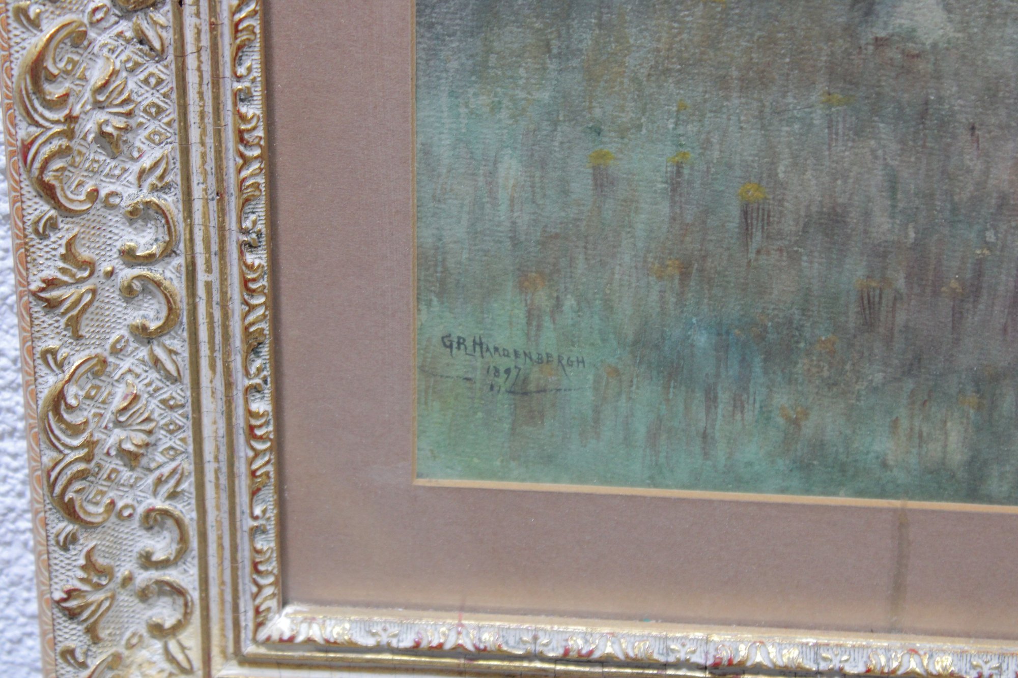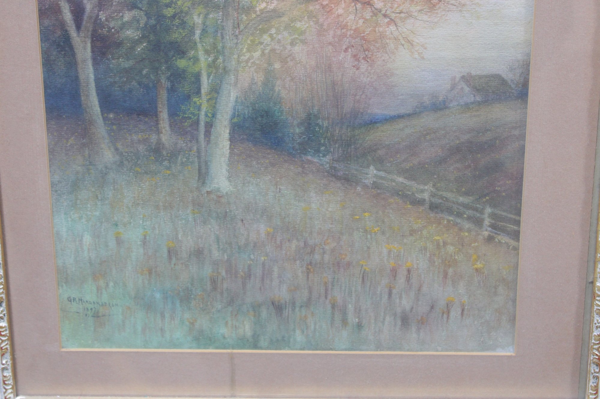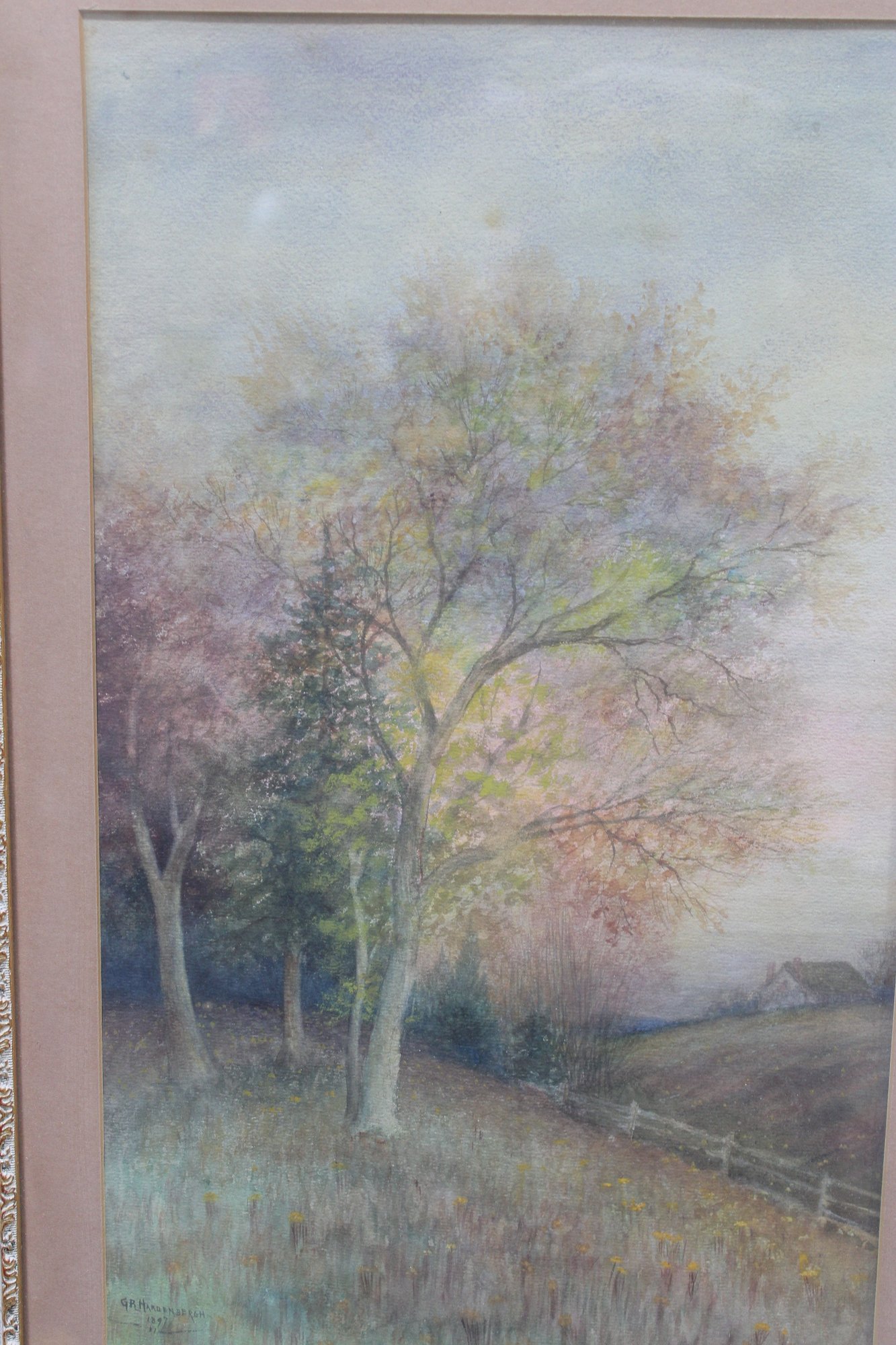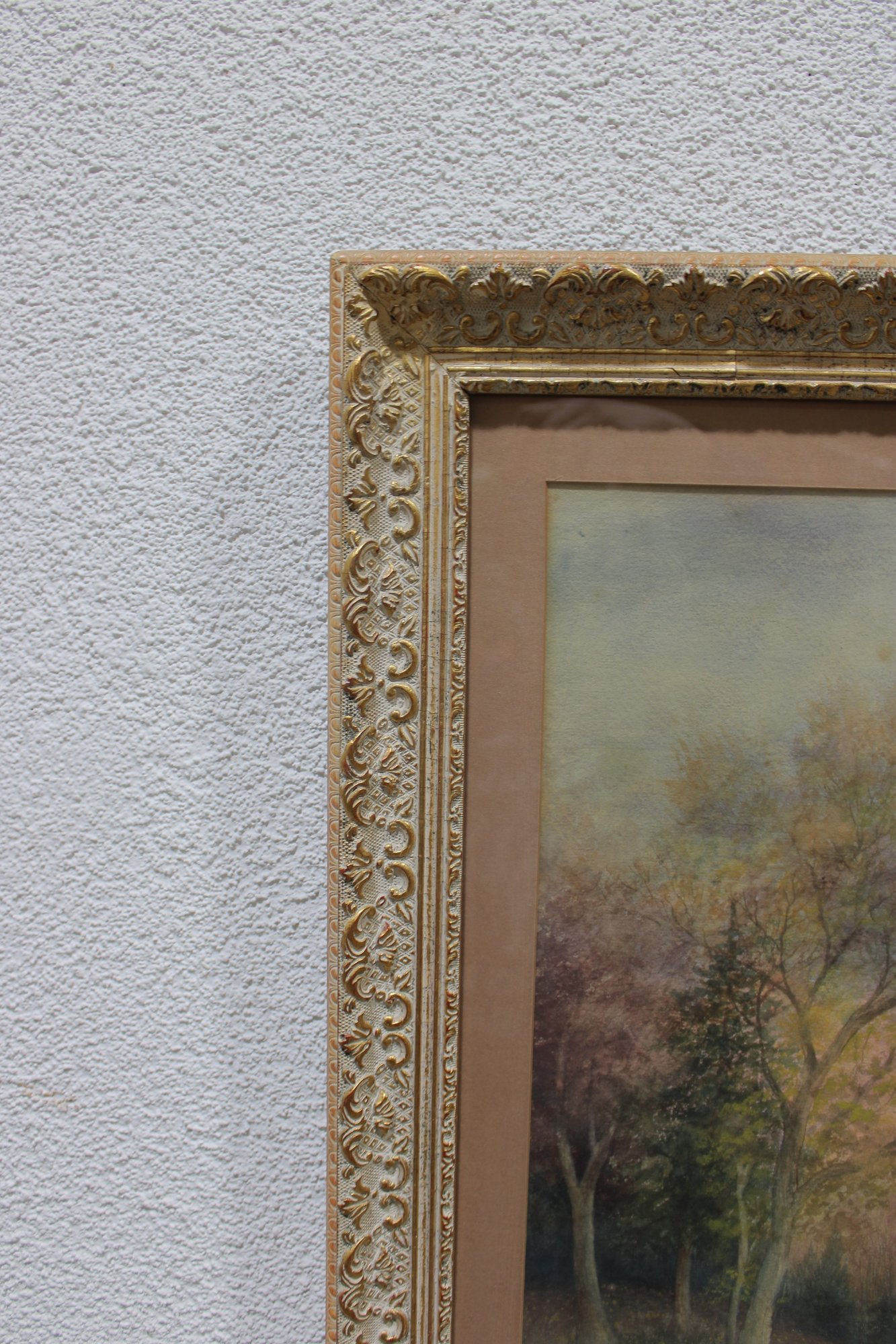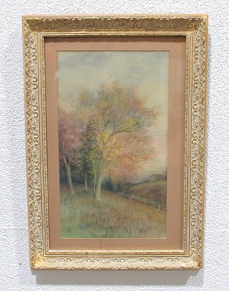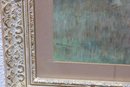 The painting is beautifully presented in an ornate gold-toned frame with decorative detailing and a wide mat that enhances the softness and depth of the composition. This piece has a calm, atmospheric quality and would display well in a living room, bedroom, hallway, or cottage-style interior.