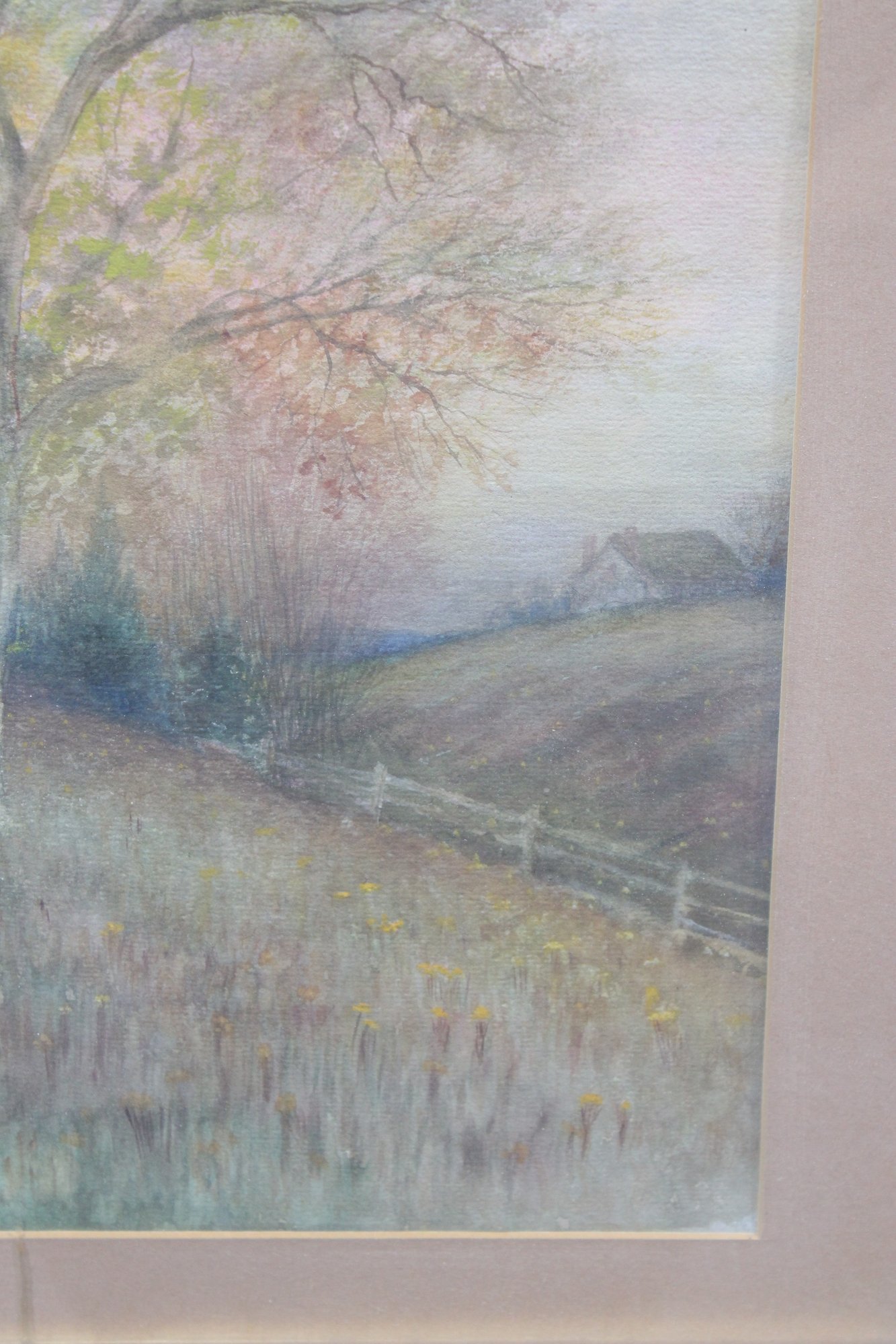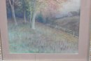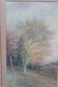 a framed original watercolor landscape painting, measuring approximately 25.5 inches x 18 inches overall including the frame. The artwork depicts a serene countryside scene with softly colored trees, open grassland, and a winding path, rendered in gentle pastel tones typical of traditional watercolor technique.