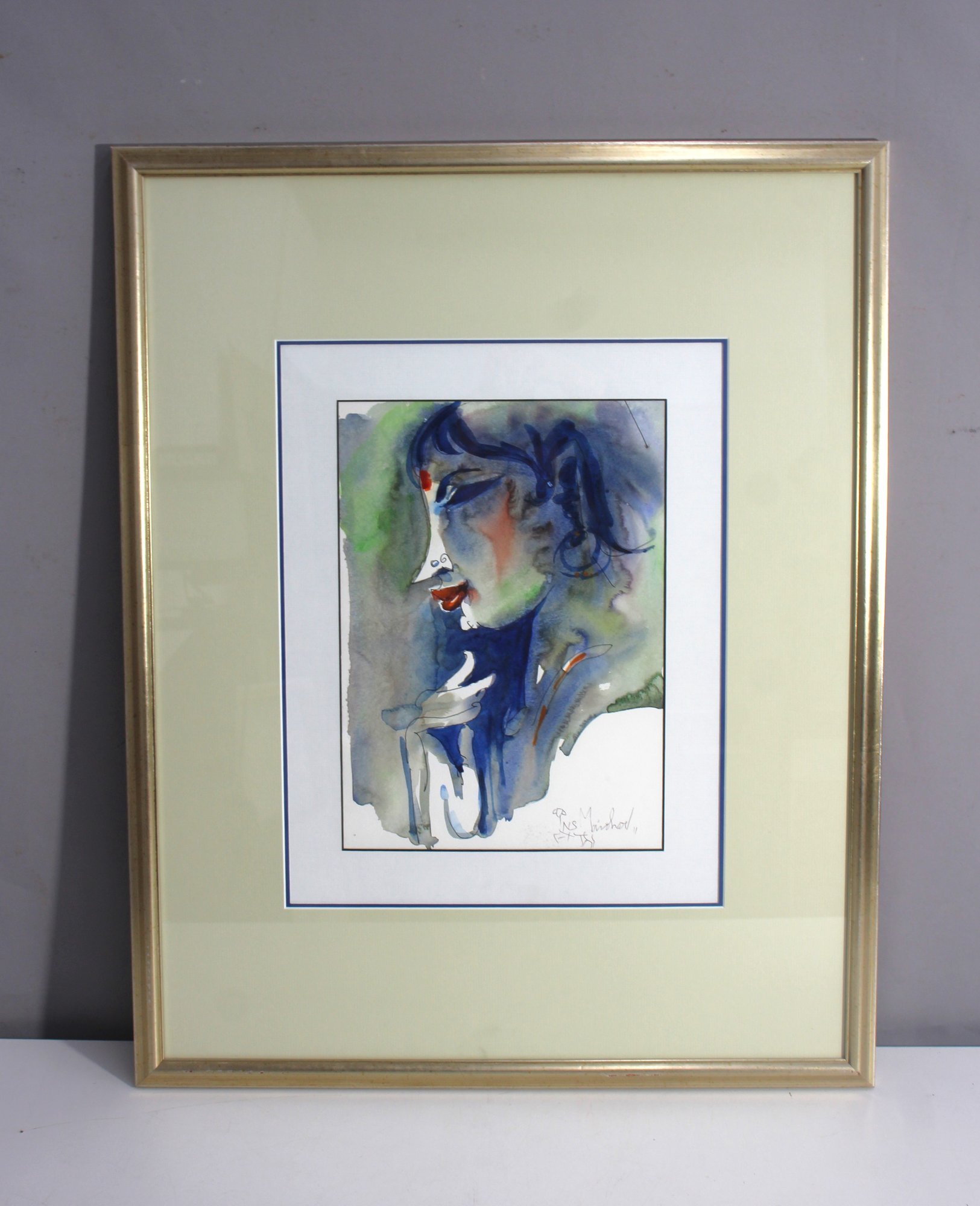 a stunning original watercolor portrait, framed under glass in a gold-tone metal frame with double matting. This expressive artwork features a mysterious female figure in shades of blue, green, and red, executed in a fluid, abstract style with delicate brushwork. The piece is signed by the artist in the lower right corner.