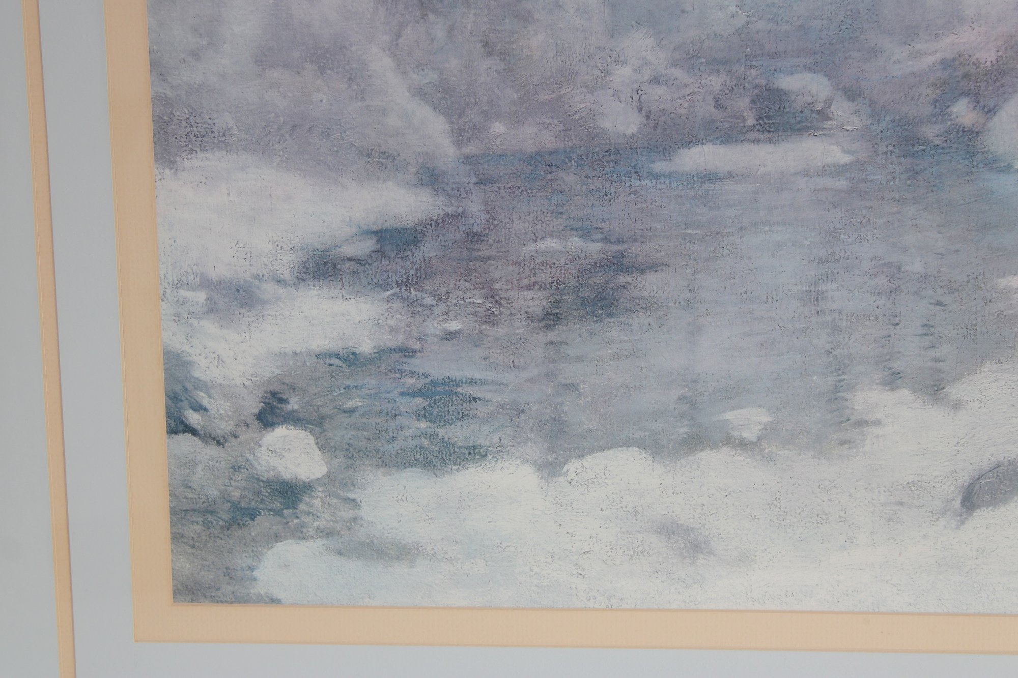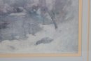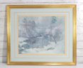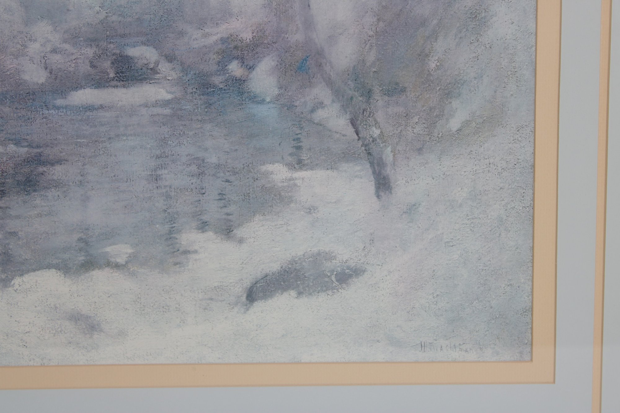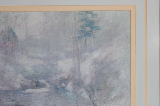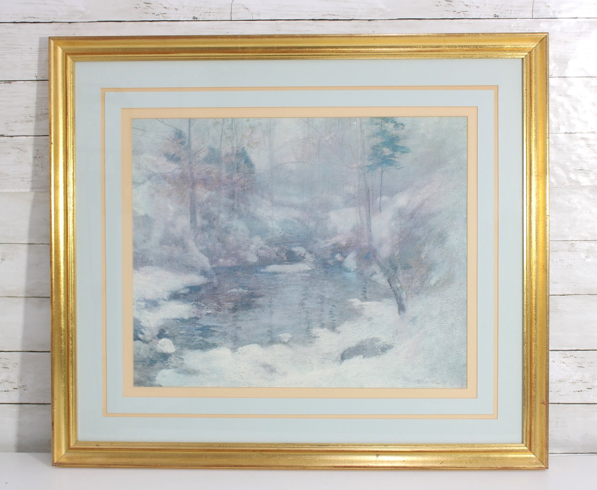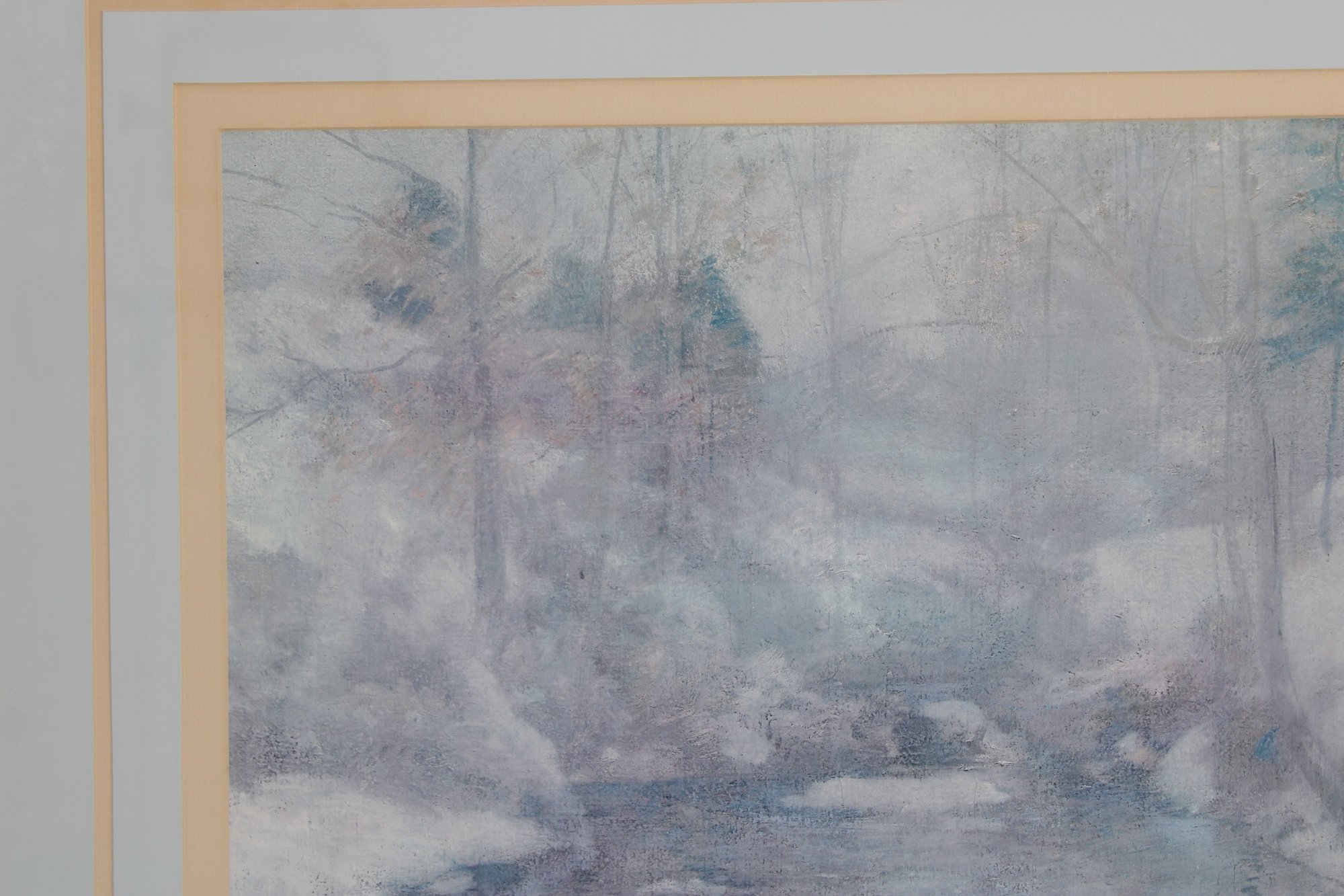 a beautiful framed winter landscape print signed , depicting a serene snowy woodland scene with a gently flowing stream surrounded by trees and soft winter light. The artwork features delicate pastel tones and a tranquil composition, creating a peaceful natural setting.