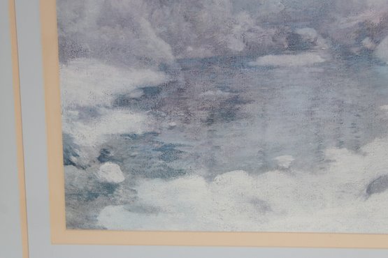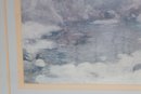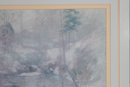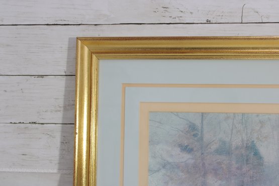 The print is signed in the lower corner and is attractively presented with a double mat and gold-tone frame, which enhances the soft colors of the landscape. The overall presentation gives the piece a classic decorative style suitable for traditional or rustic interiors.