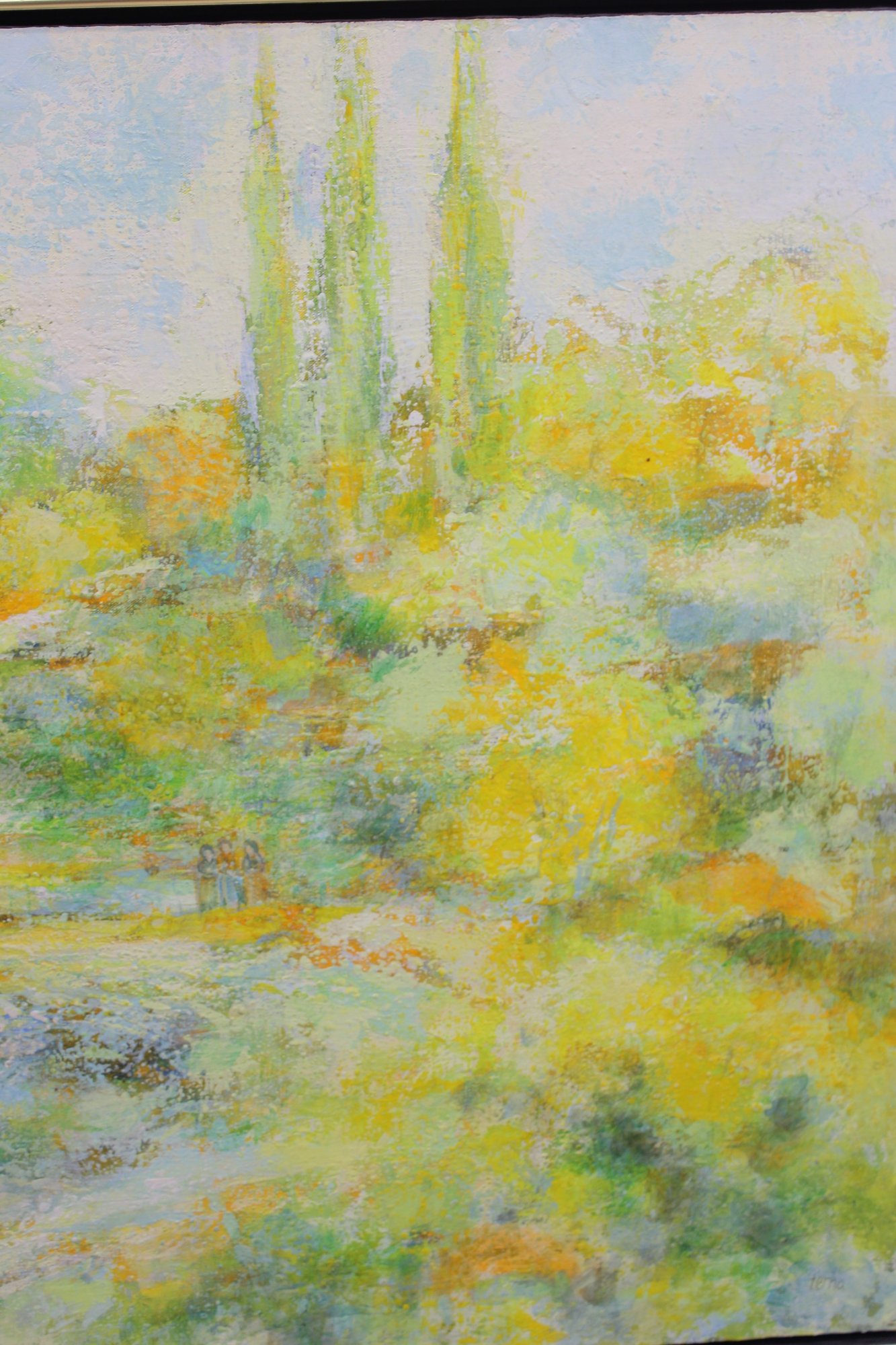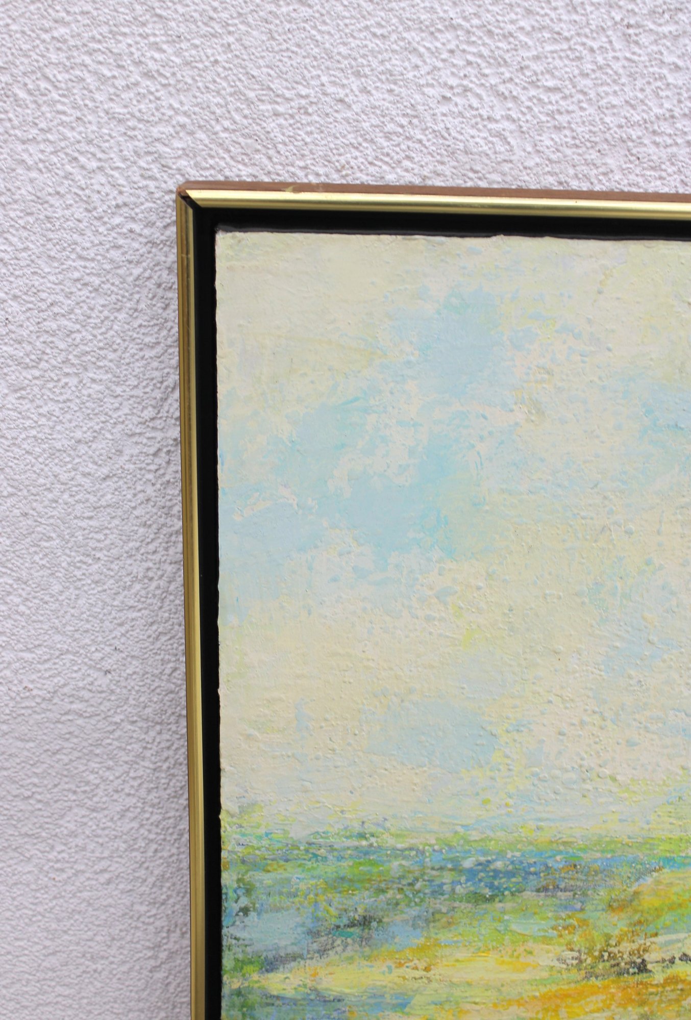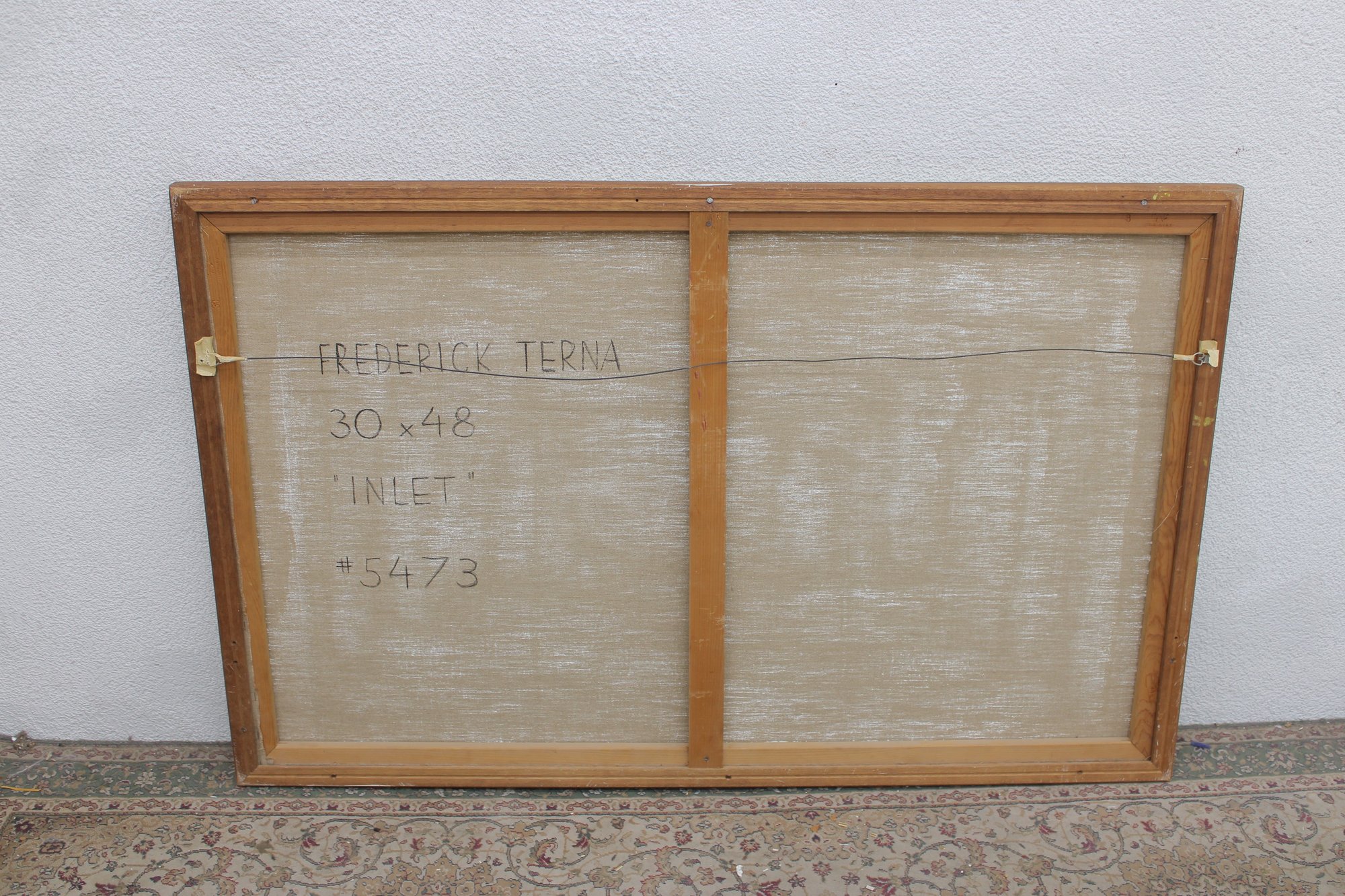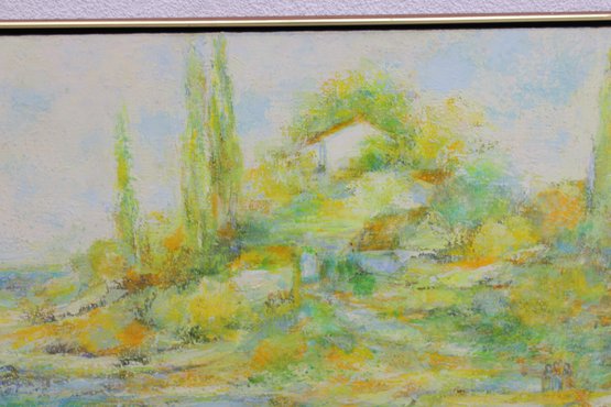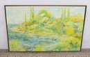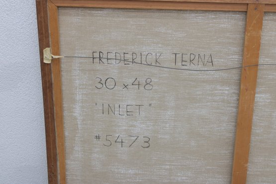 a beautiful original painting by listed artist Frederick Terna, titled “Inlet.” This large-scale work captures a serene landscape scene with soft, impressionistic brushwork and a luminous palette of greens, yellows, and blues.