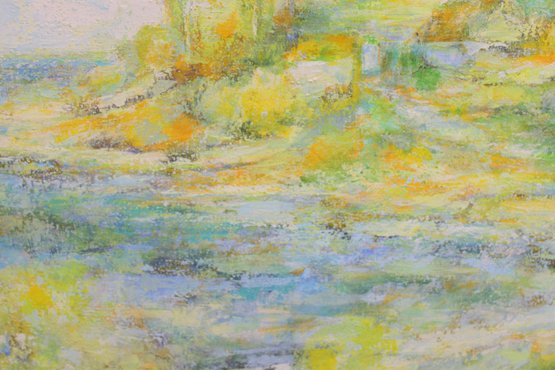 The composition features a tranquil waterside setting with trees and gentle foliage, rendered in an expressive, atmospheric style that evokes light and movement. The layered colors and loose technique give the painting a dreamy, almost abstract quality while still maintaining a recognizable natural setting.