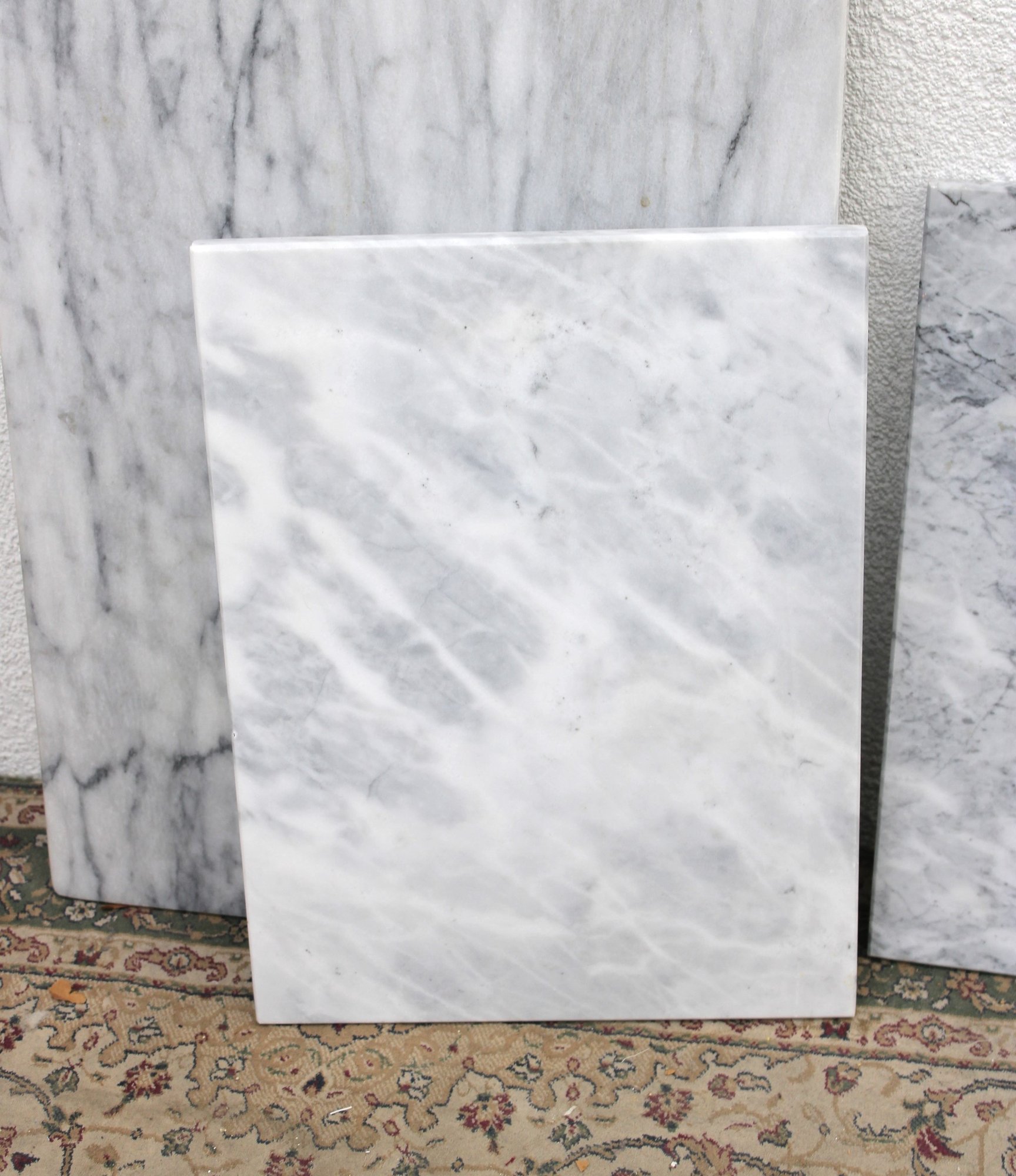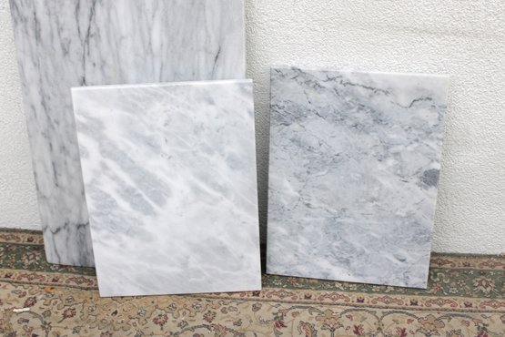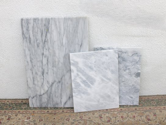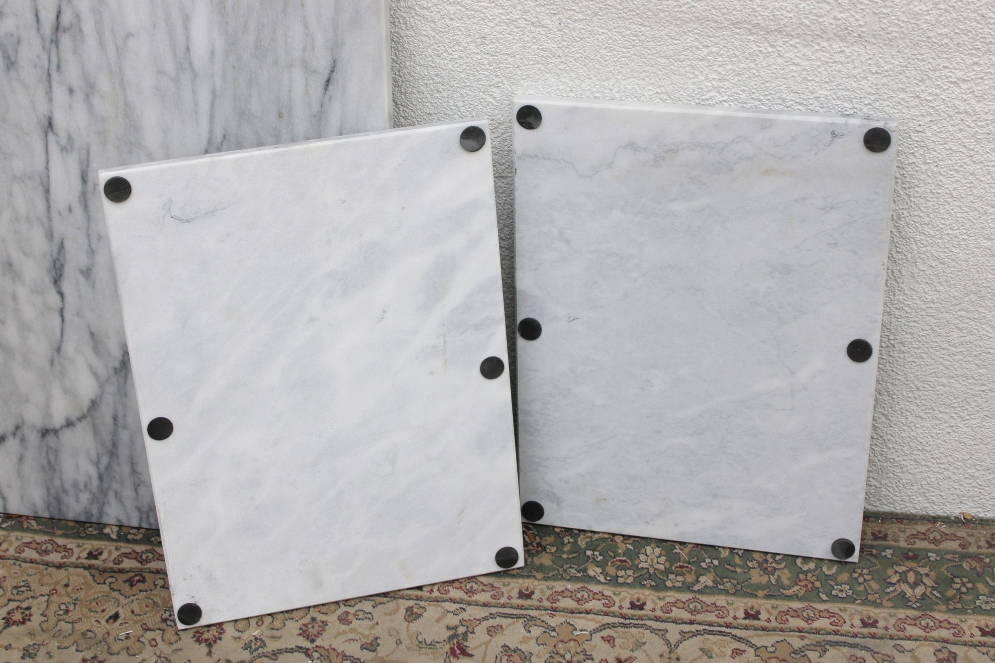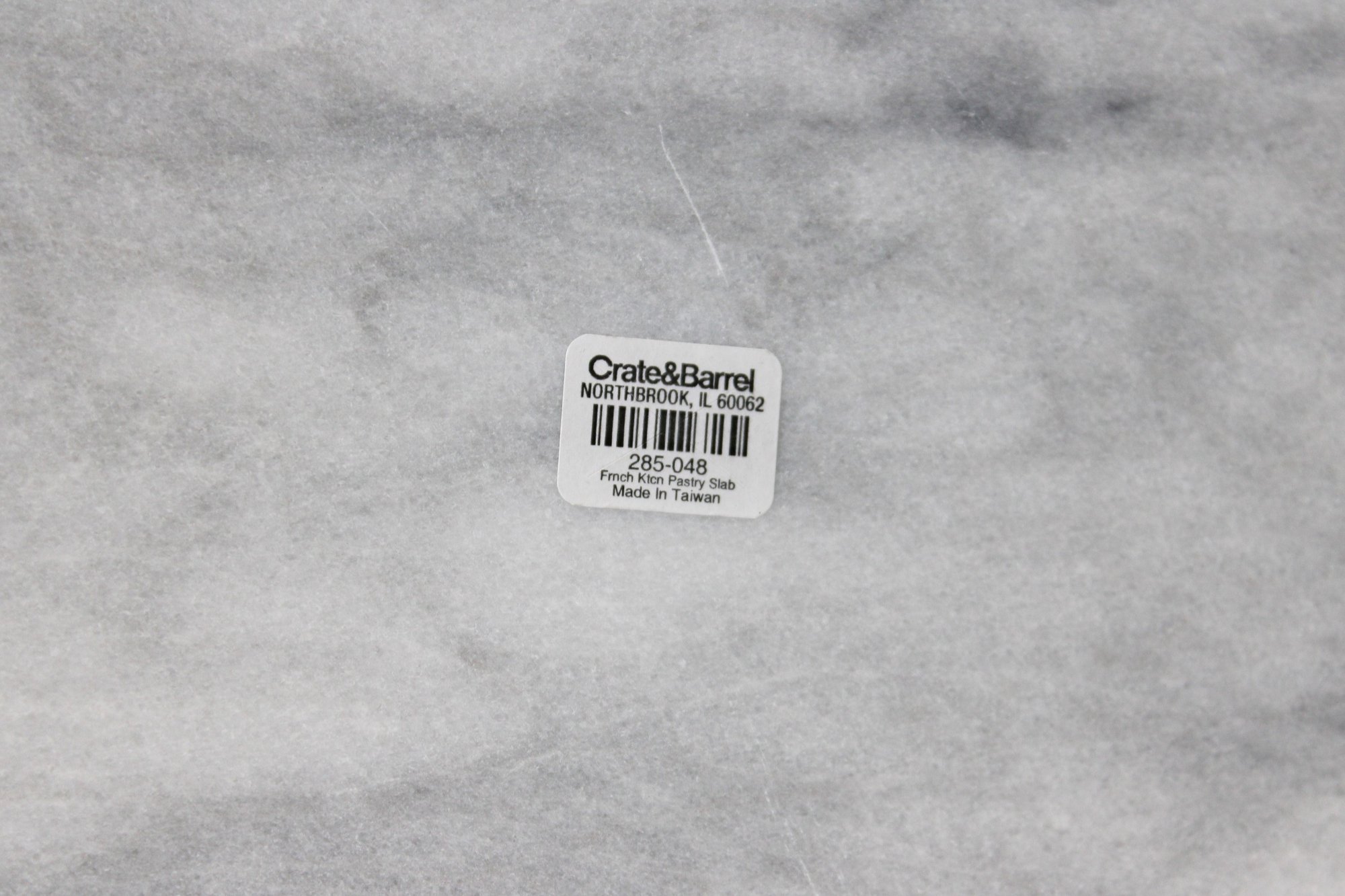These pieces are ideal for serving cheese, charcuterie, desserts, appetizers, or for use as stylish kitchen and countertop décor. The smaller boards have protective feet on the underside, and one retains its original Crate & Barrel label. The natural marble variation gives each piece a unique appearance.