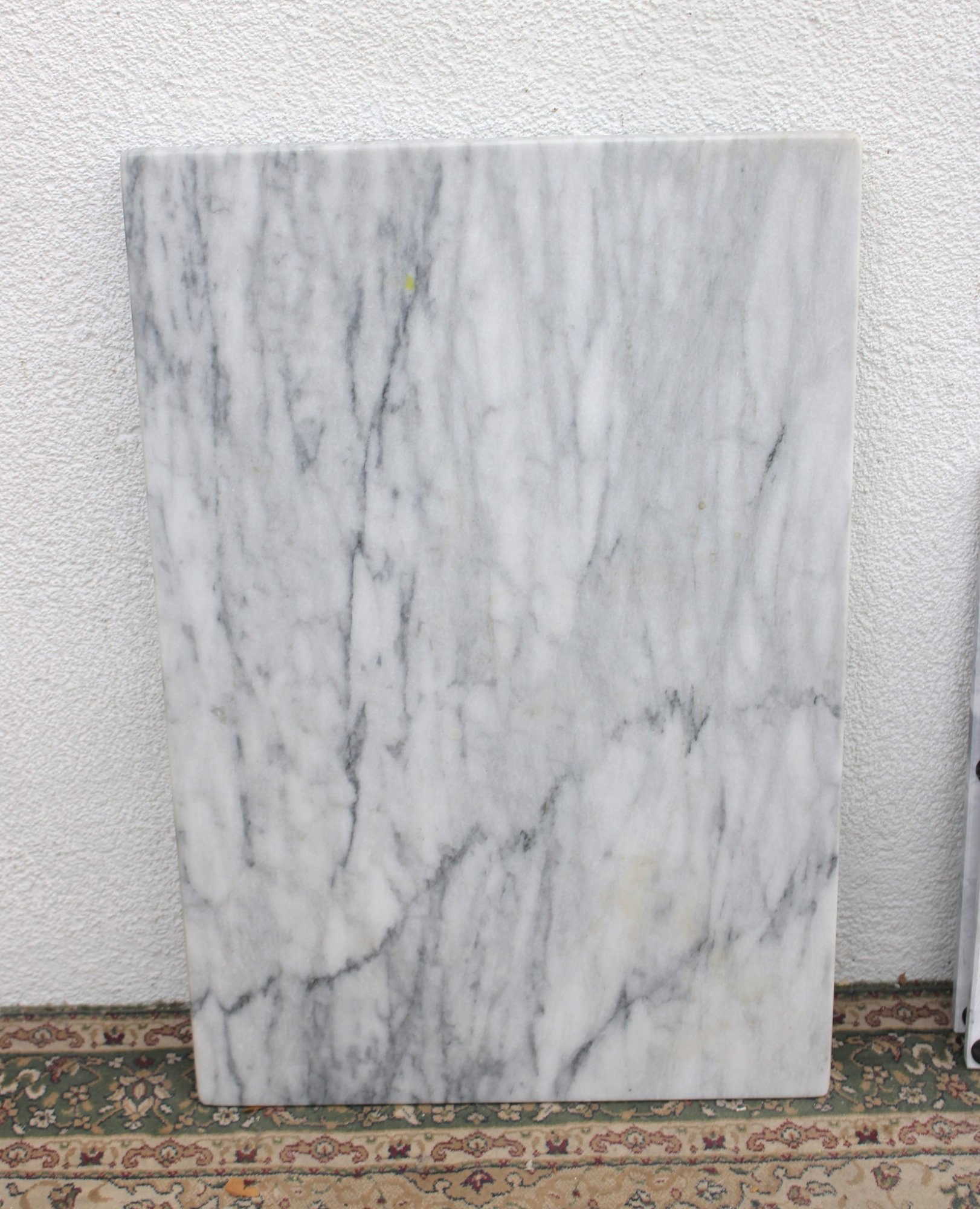 French Kitchen marble serveware set by Crate & Barrel, offered as a 3-piece lot. This group includes one larger rectangular marble board and two smaller rectangular marble serving boards, each featuring soft gray and white veining for a timeless, classic look.