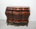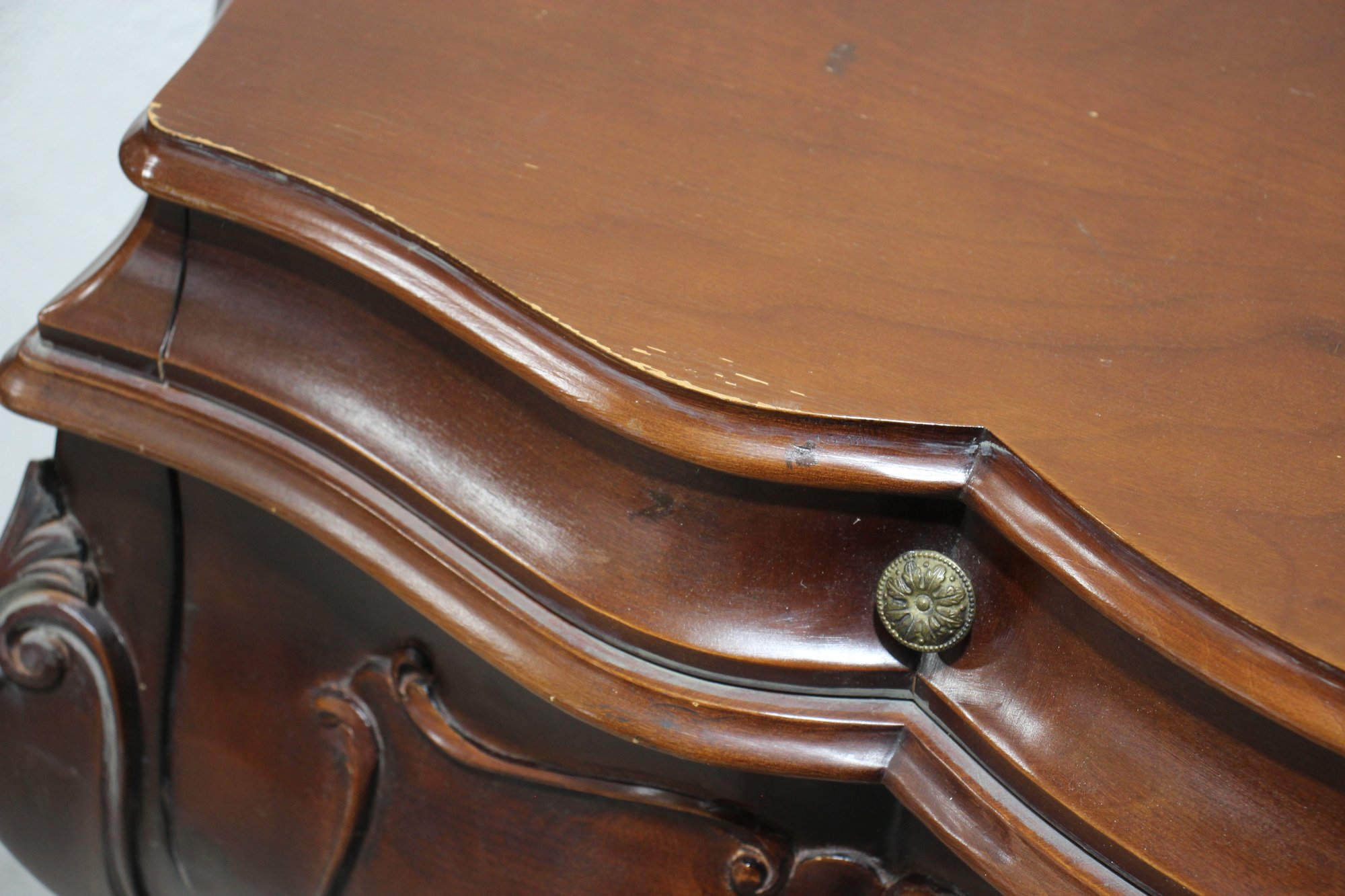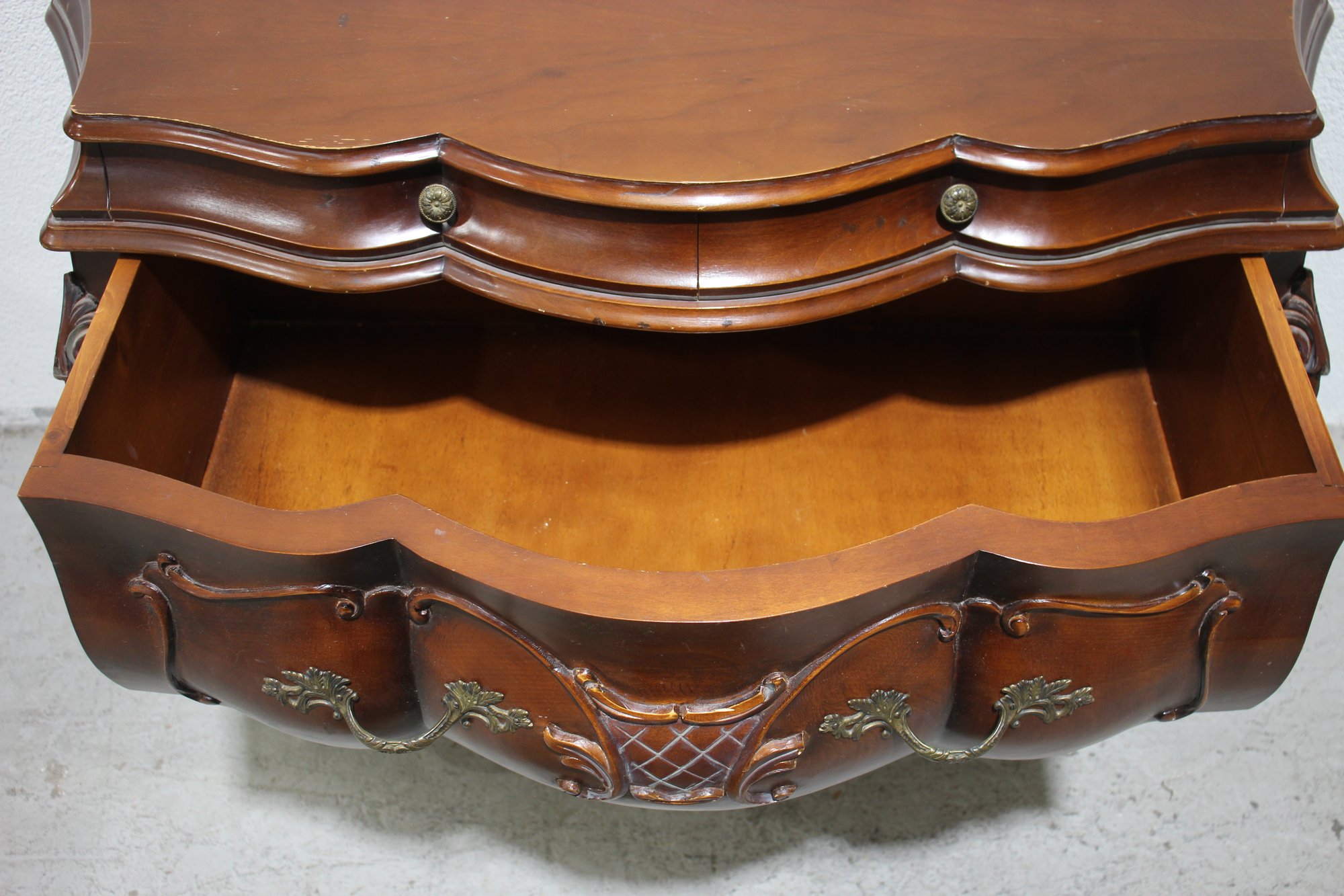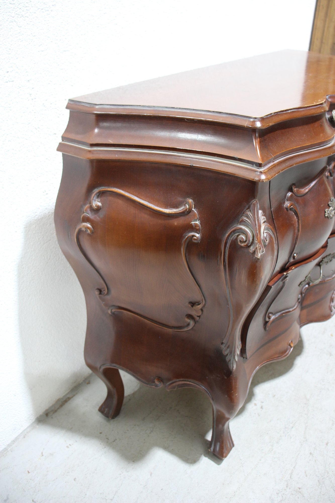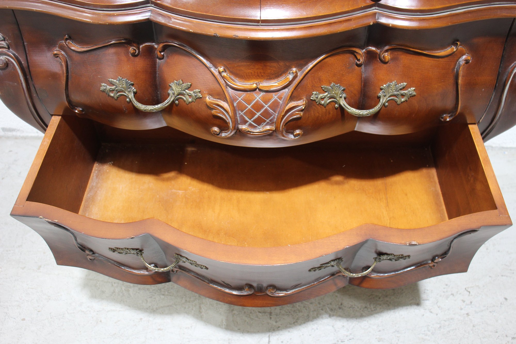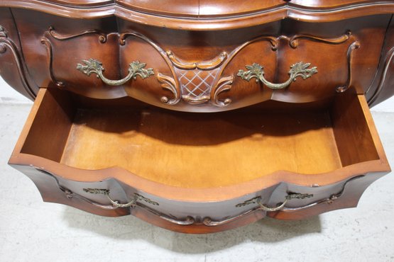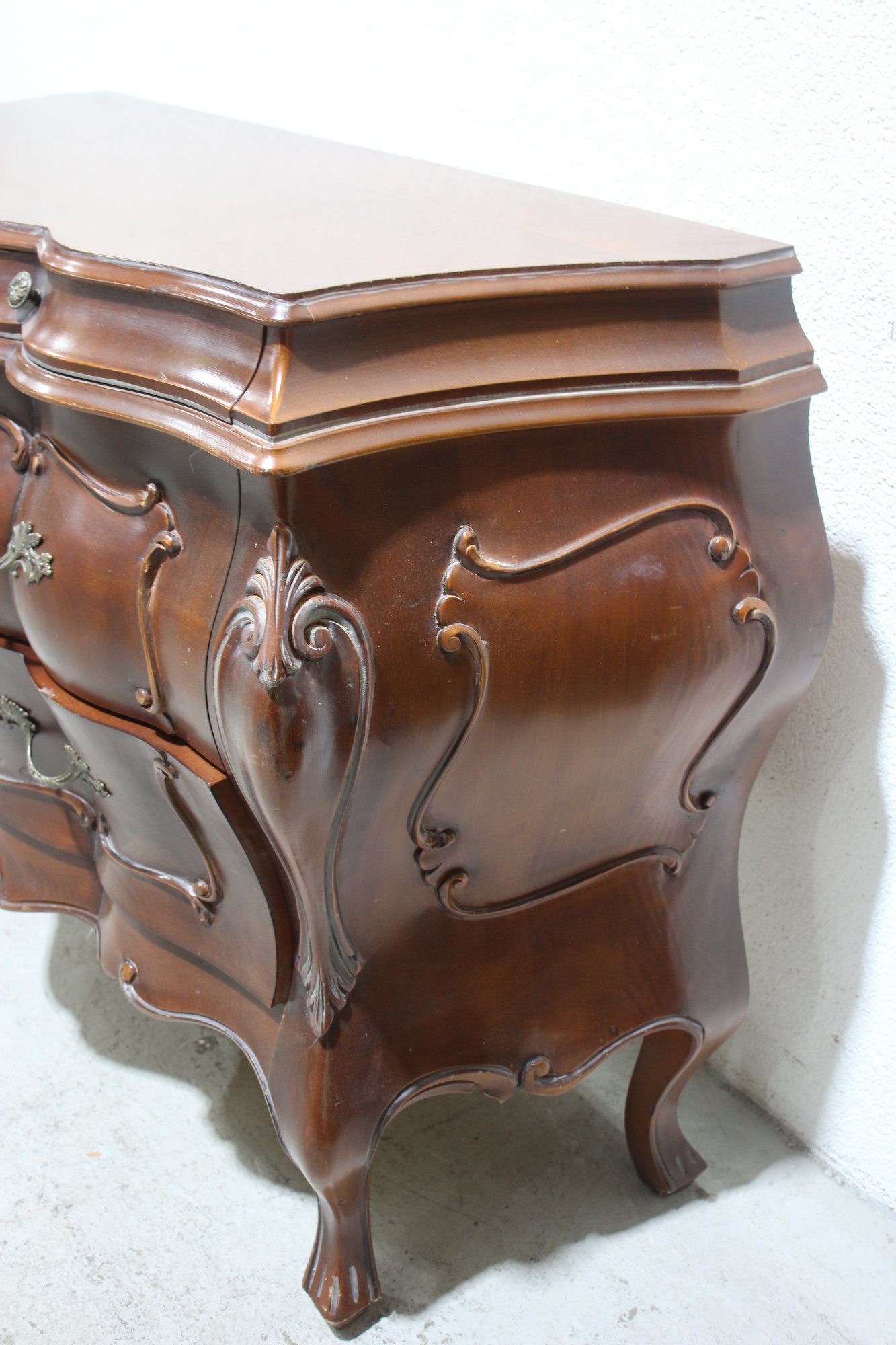 This exquisite French Provincial Bombe Chest is a statement of classic elegance and craftsmanship. Featuring a beautifully curved bombe silhouette, this piece is crafted from rich mahogany wood with an ornate hand-carved design and a warm finish.