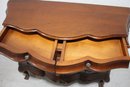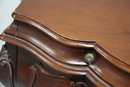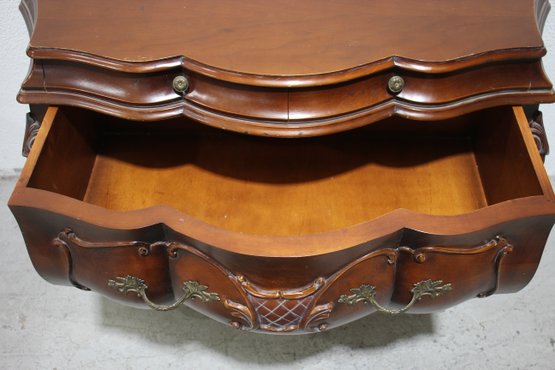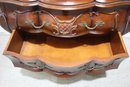 The serpentine top houses two smaller drawers, while the larger bottom drawers provide ample storage. Brass hardware with intricate detailing enhances the luxurious aesthetic, while the gracefully curved cabriole legs add a refined touch.