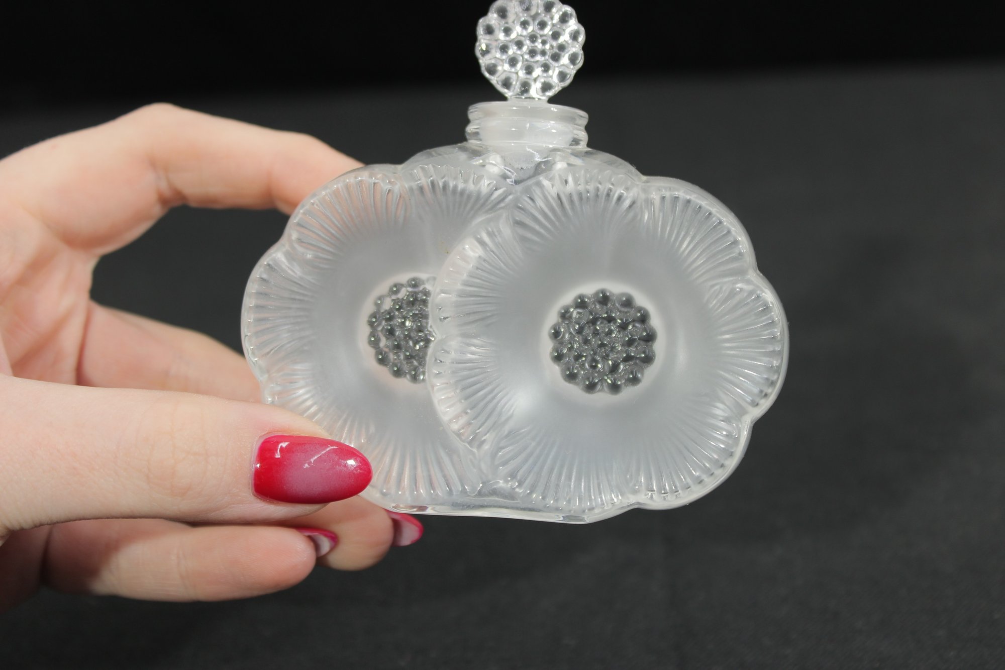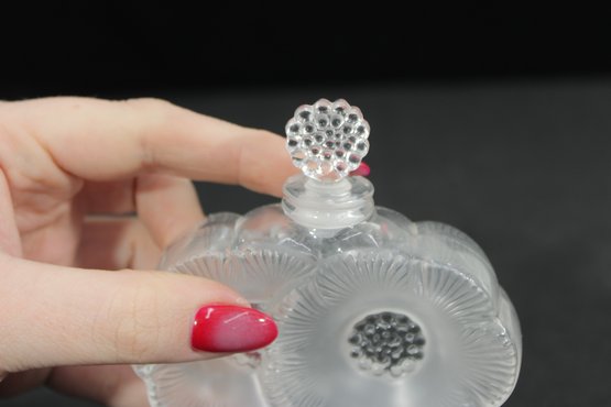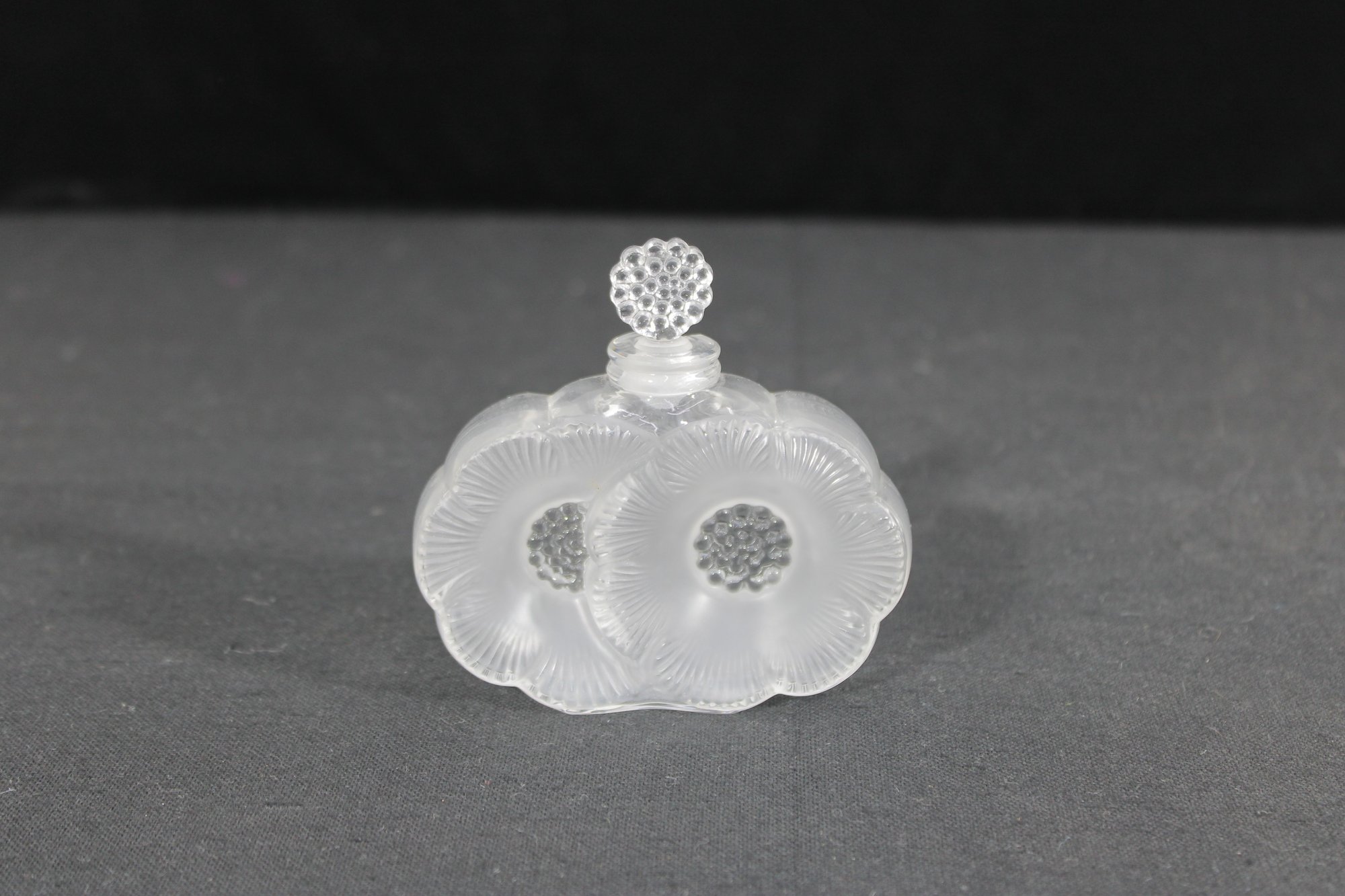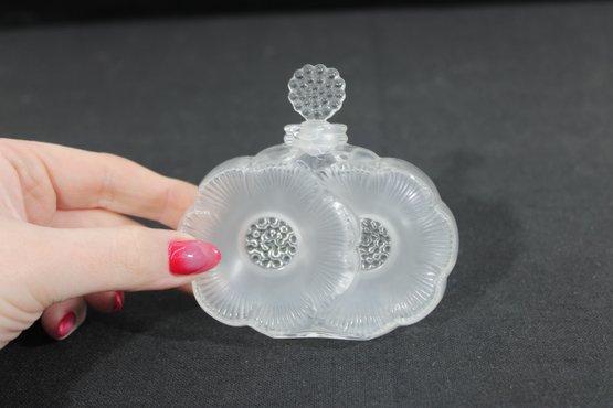frosted crystal perfume bottle in the “Deux Fleurs” (Two Flowers) design, featuring a beautifully sculpted double floral motif. The bottle is crafted with a soft matte finish and detailed petal textures, with raised centers adding depth and visual interest.